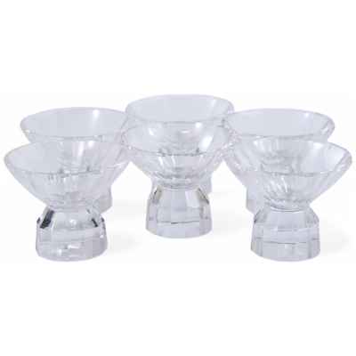 Антикварный набор рюмок для ликёра, изготовленный в Европе во второй четверти XX века, является изысканным образцом стеклянного искусства в стиле ар-деко. Изделия выполнены из бесцветного стекла, украшенного гранением и шлифовкой, что подчёркивает элегантность формы и игру света на гранях.