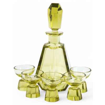 Антикварный набор для алкогольных напитков, изготовленный в Богемии в 1930-е годы, является ярким примером стекла в стиле ар-деко. В комплект входят графин и пять рюмок, выполненные из цветного стекла с использованием литья и гранения.