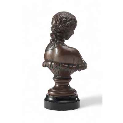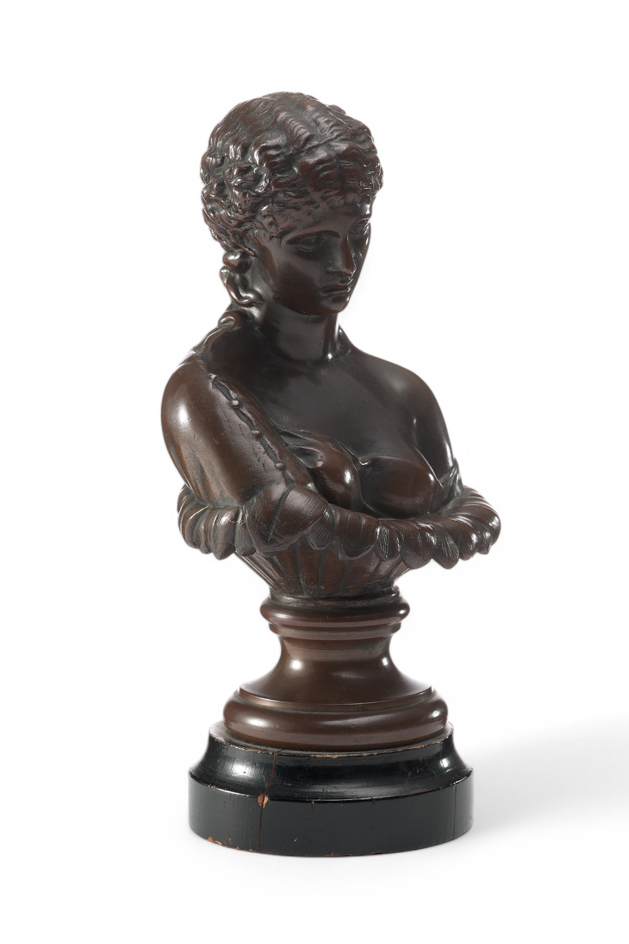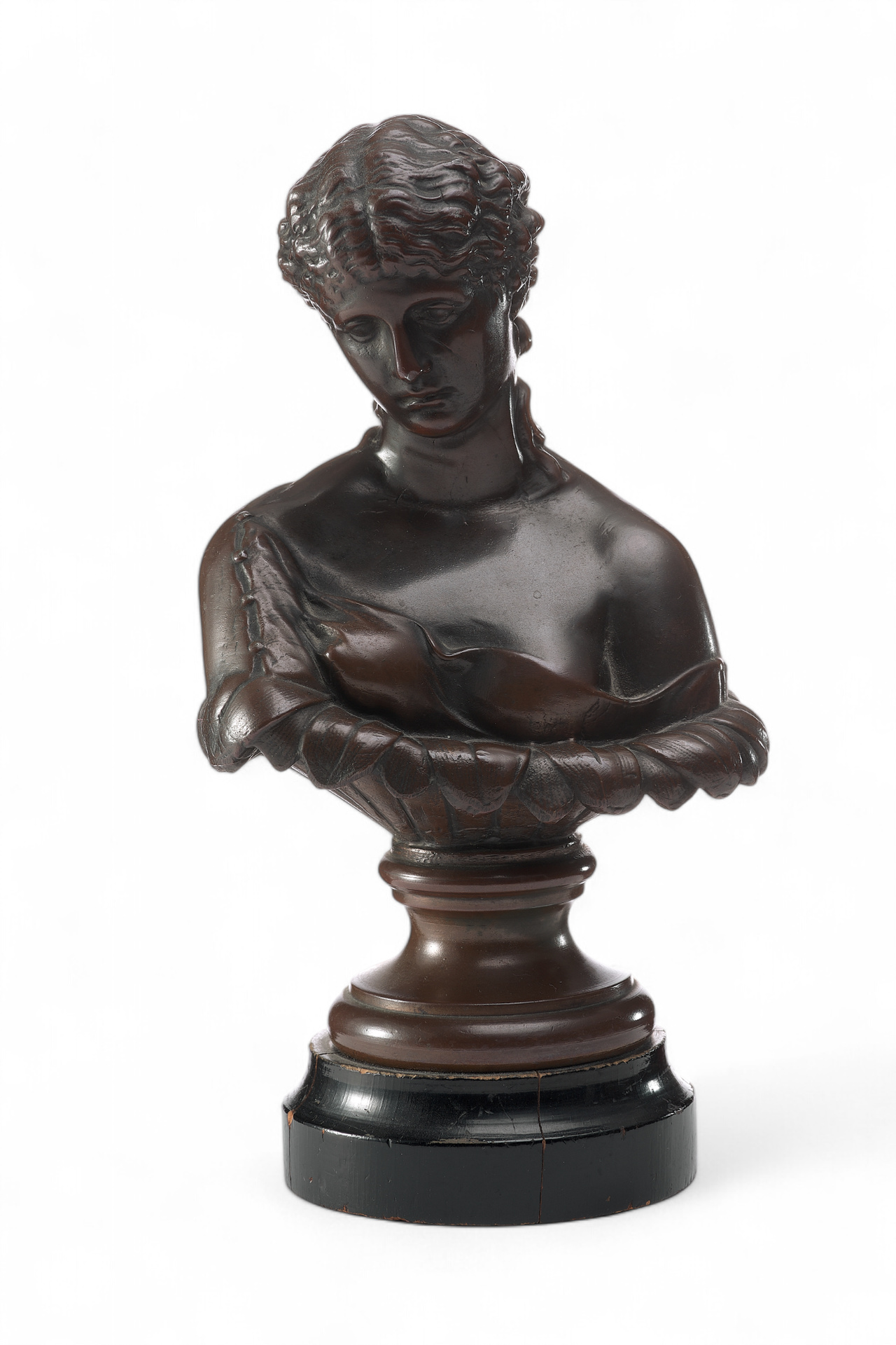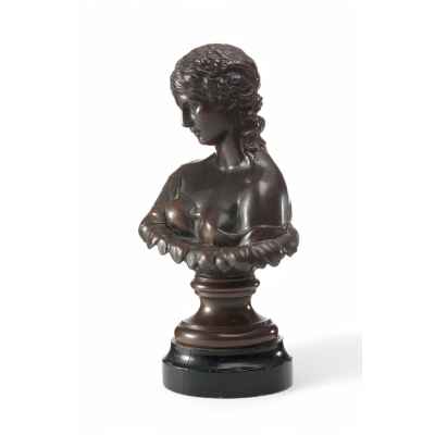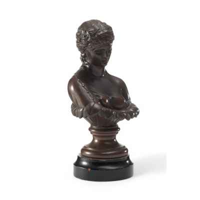 Скульптура «Женский бюст» относится к декоративному искусству начала XX века и представляет собой утончённое произведение в духе стиля модерн. Изделие создано в Европе методом литья из шпиатра (цинково-оловянистого сплава), с последующим патинированием, и установлено на деревянное круглое основание, что придаёт композиции устойчивость и завершённость.
