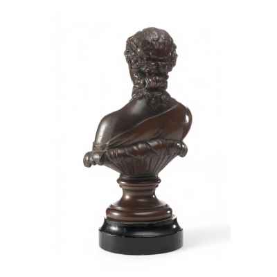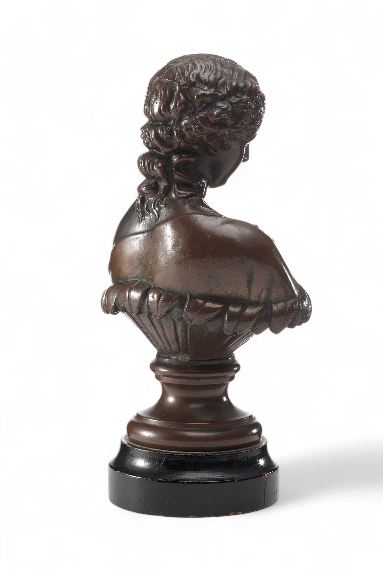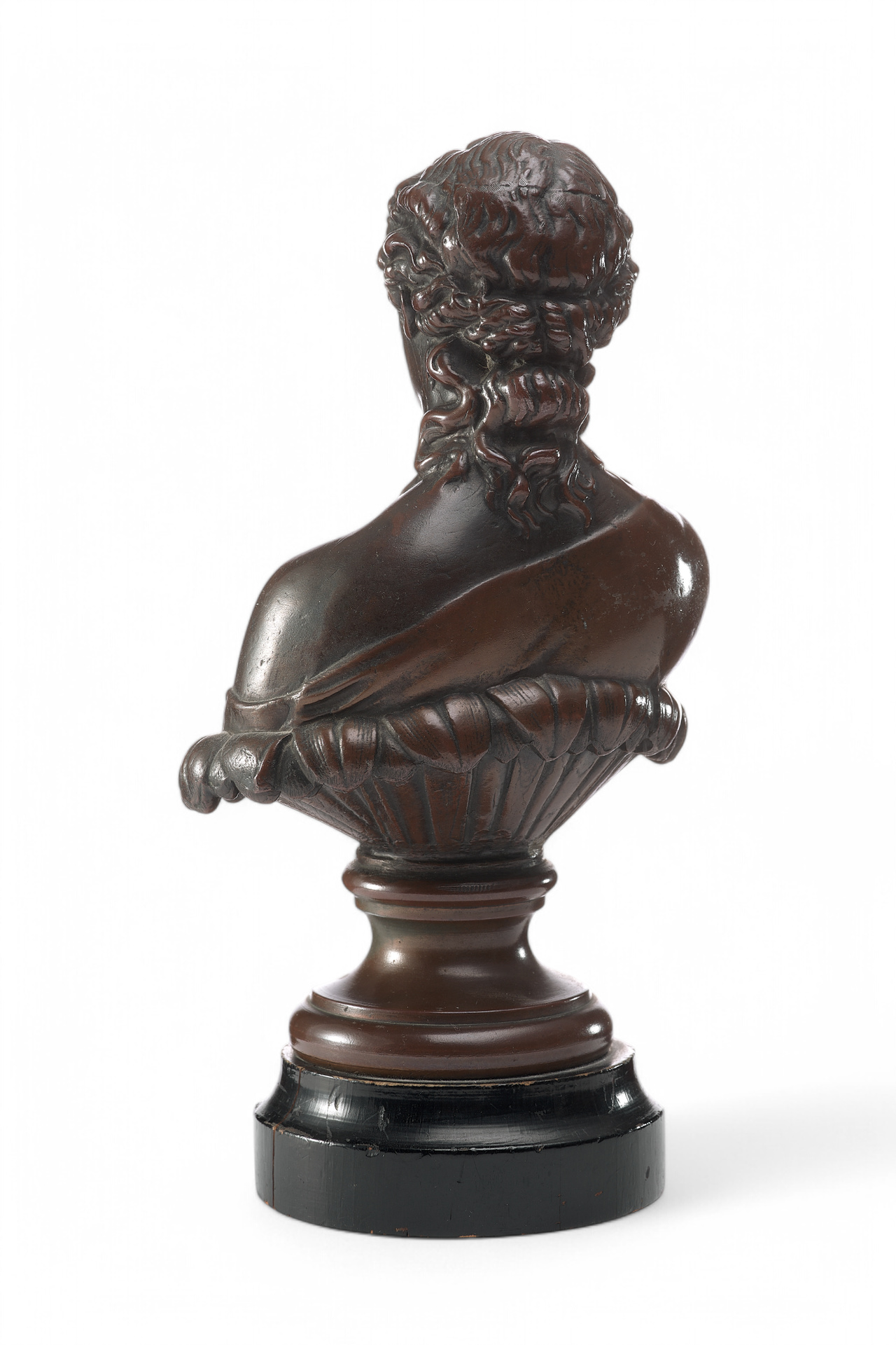 Особое внимание привлекает необычное композиционное решение нижней части бюста: линия среза повторяет изгиб плеч, а драпировка одежды переходит в стилизованный декоративный венец, напоминающий цветочные лепестки. Такой декоративный бордюр становится частью скульптурной формы, органично связывая фигуру с постаментом. Сам постамент выполнен в виде невысокой одноордерной ножки, гармонично завершающей композицию.