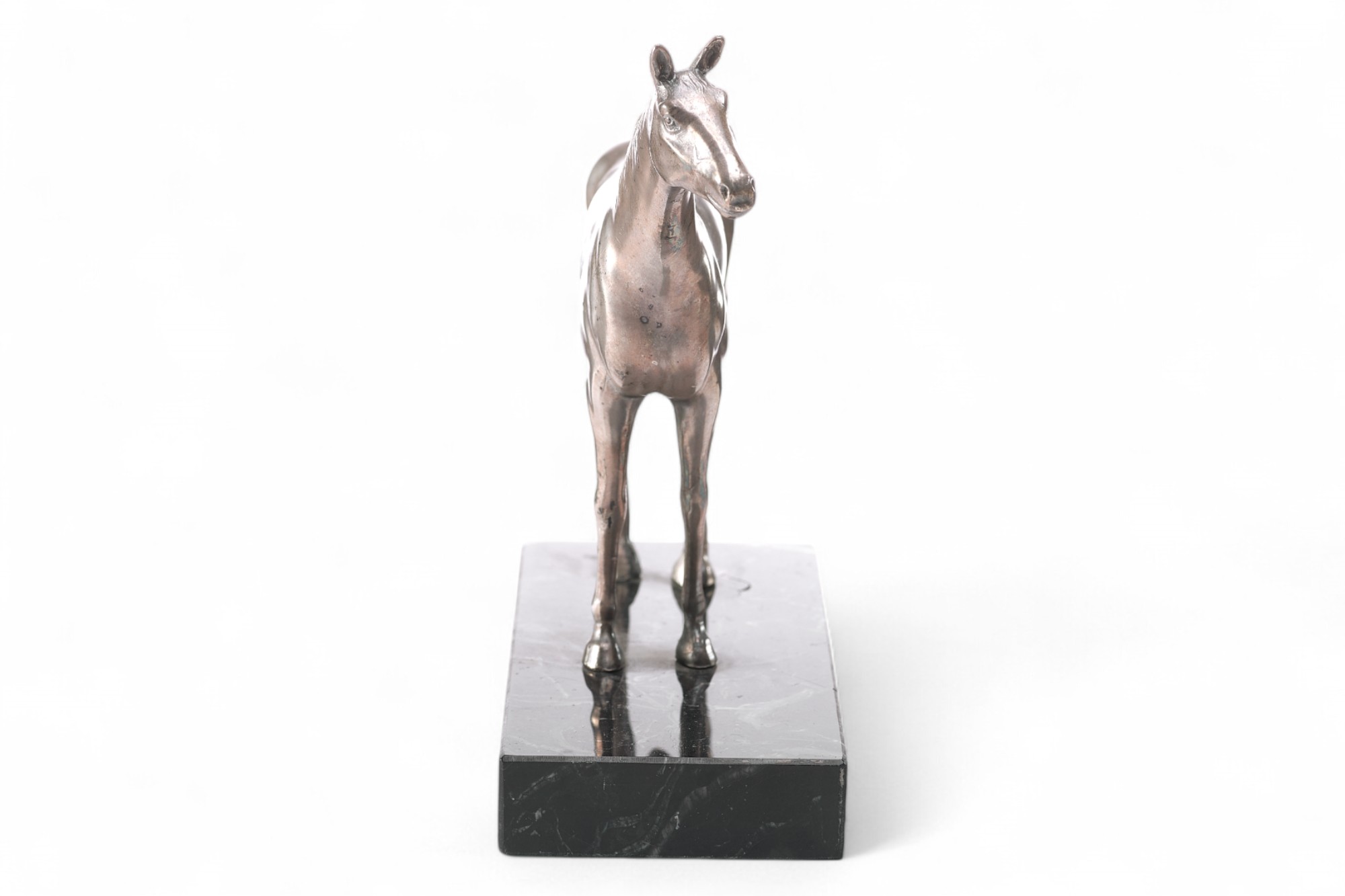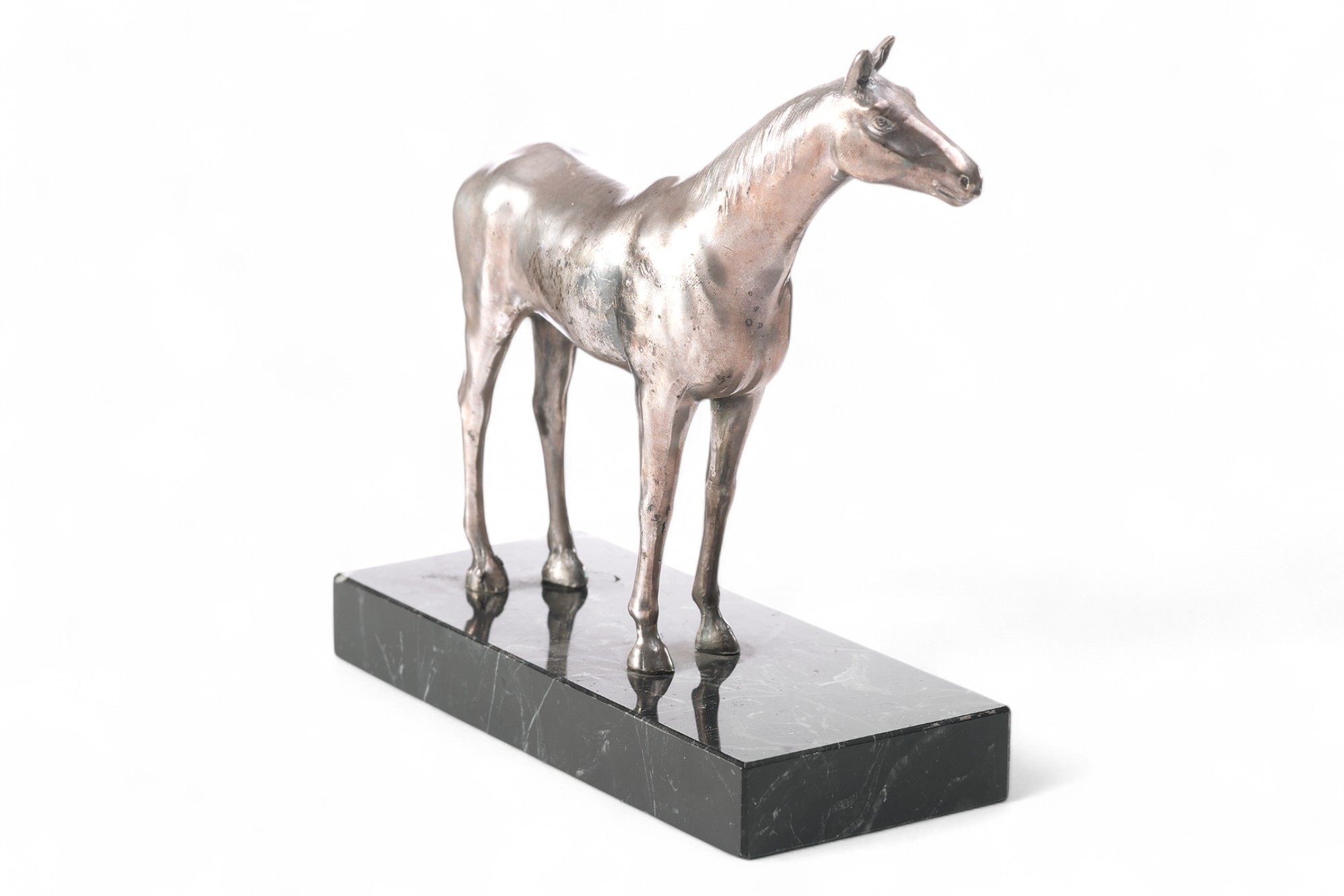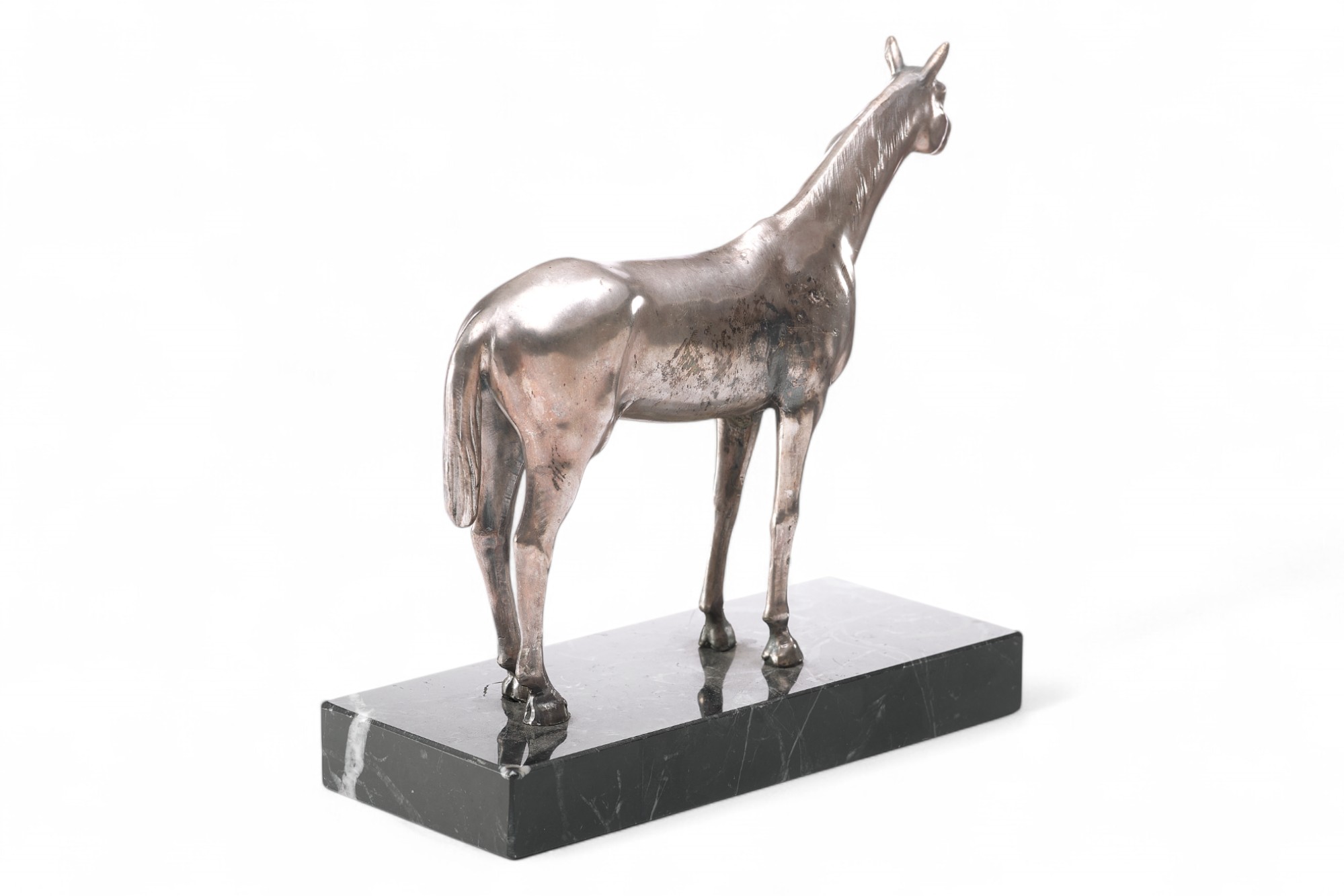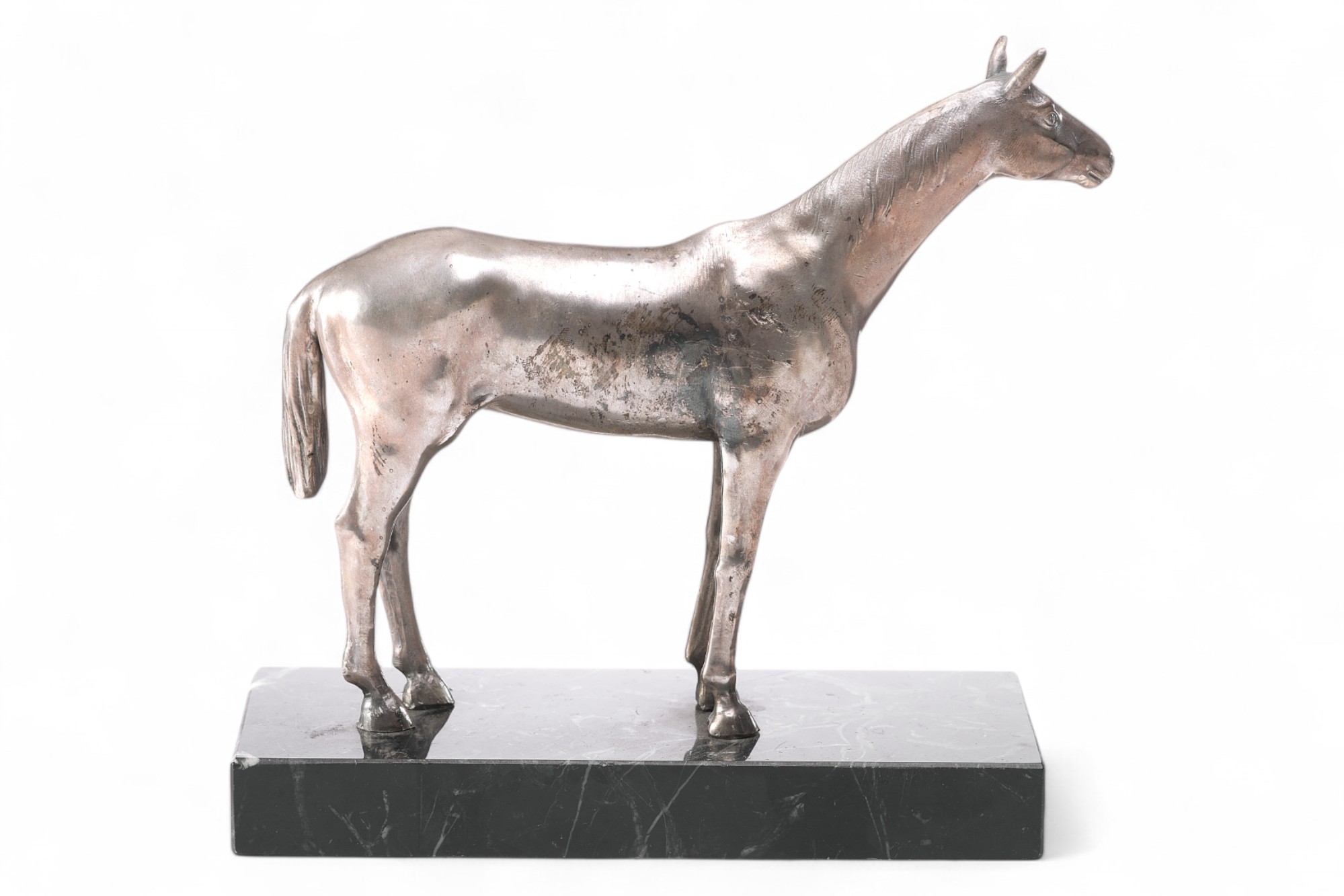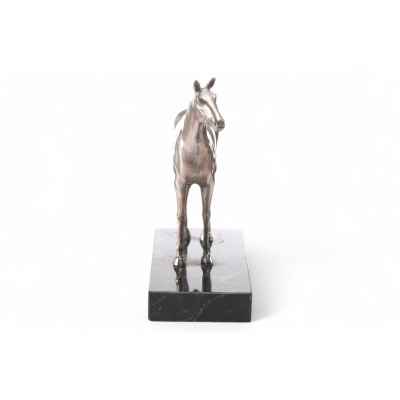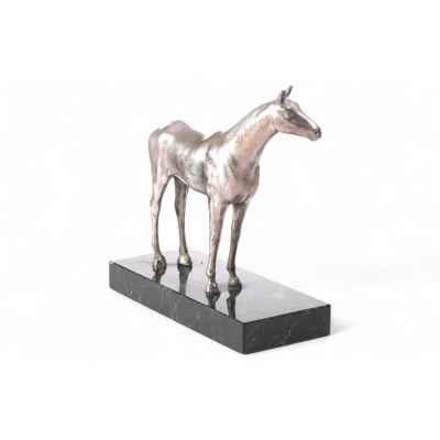 Скульптура «Английская охотничья лошадь» относится к жанру анималистики и была выполнена в Европе в конце XIX — начале XX века. Изделие представляет собой реалистичное изображение стоящей лошади, отлитое из шпиатра (цинково-оловянистого сплава) с покрытием серебрением и установленное на прямоугольной подставке из чёрного мрамора. Композиция выполнена в духе натуралистической пластики, характерной для кабинетной скульптуры эпохи.
