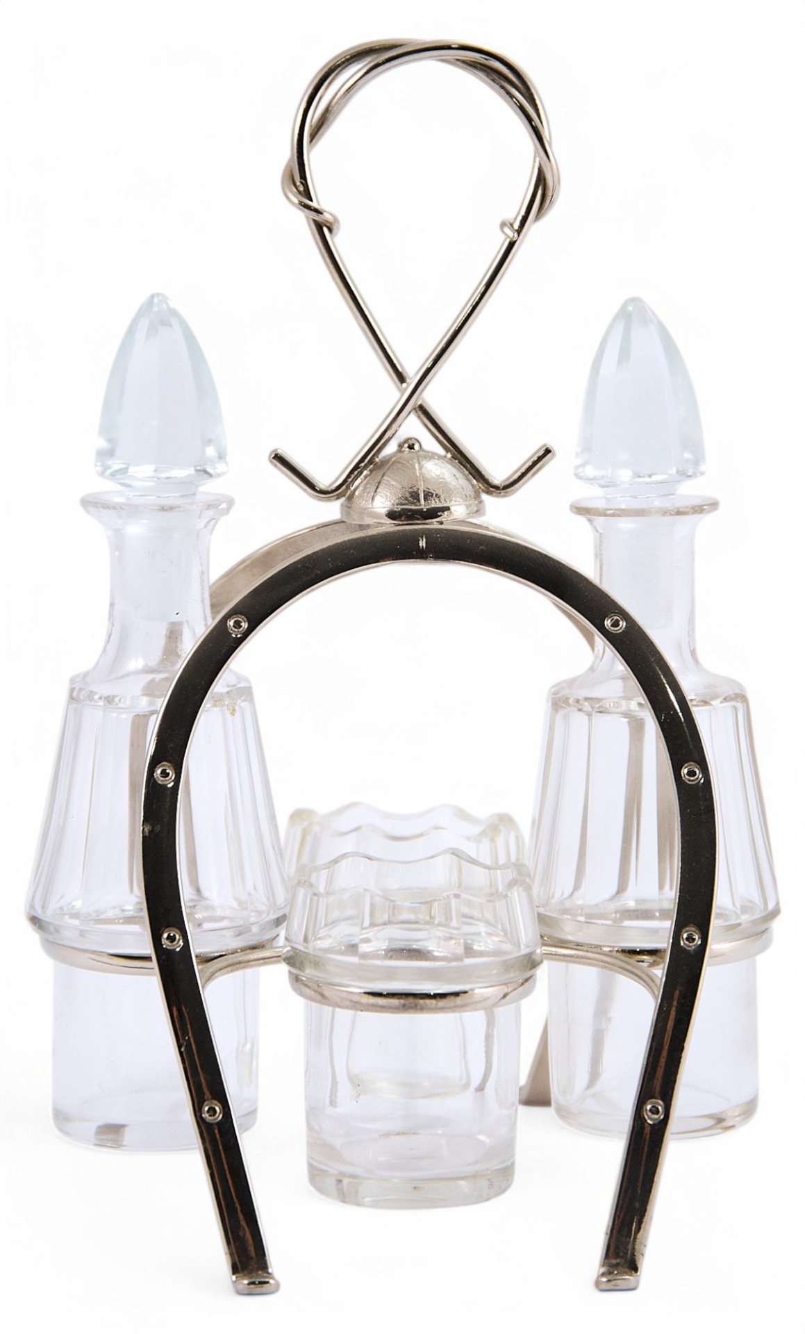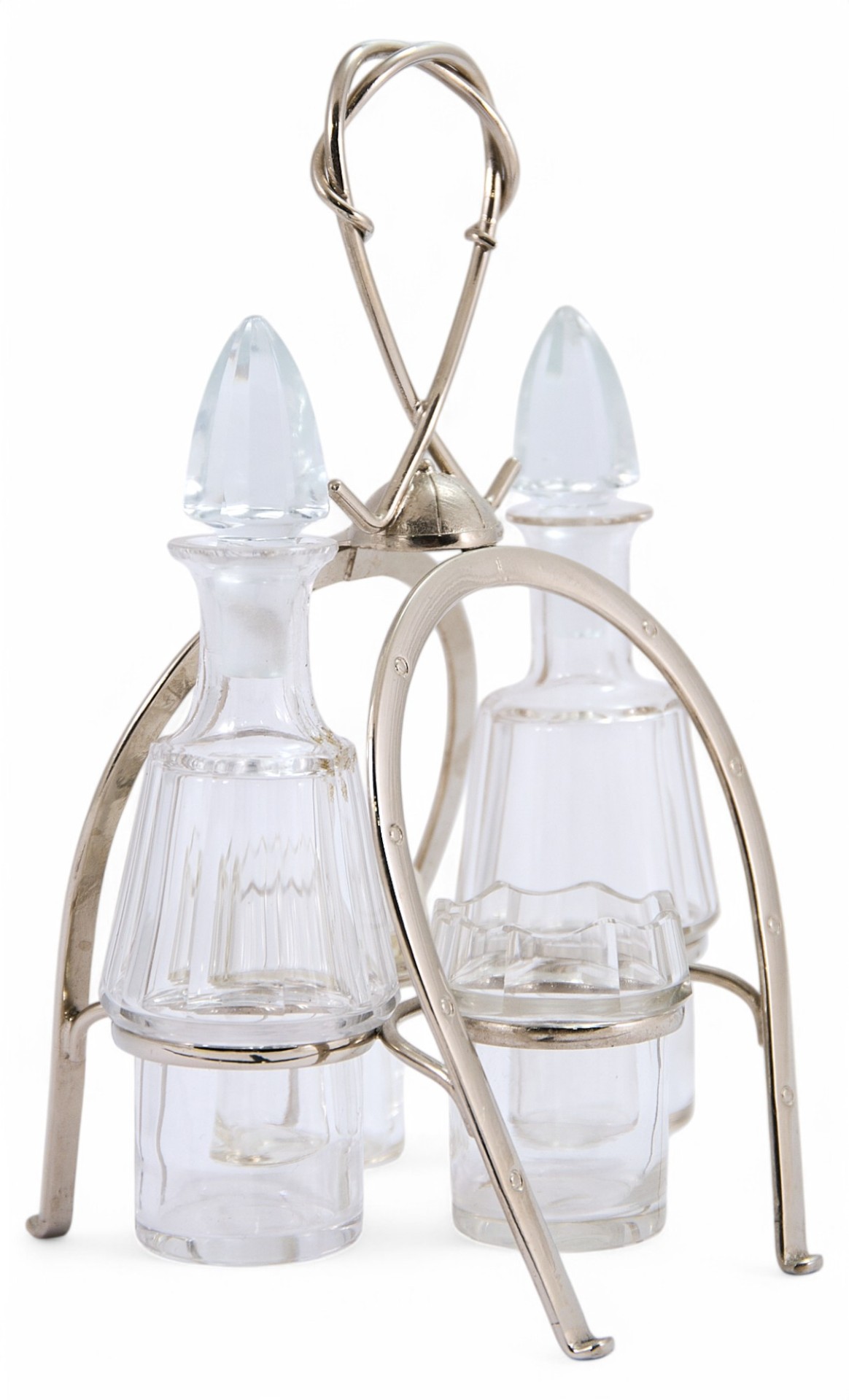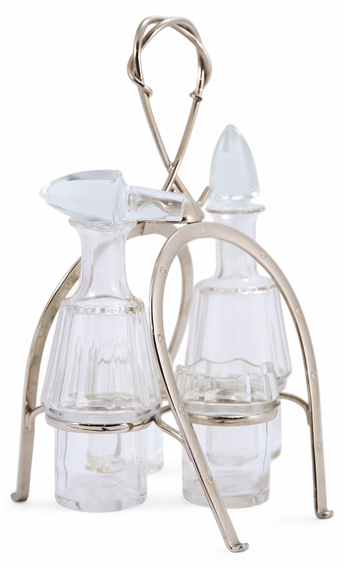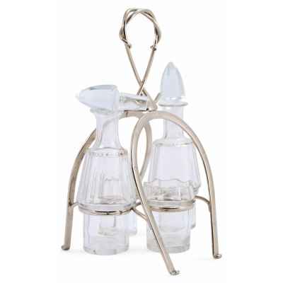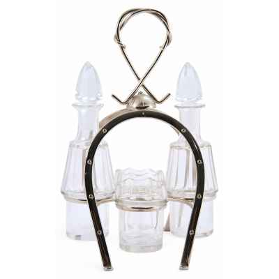 Набор для специй состоящий из двух графинчиков для масла и уксуса и двух стеклянных емкостей для соли и перца. Подставка на высоких ножках выполнена из металла и покрыта серебрением. Аналогичными предметами обладали конструкции судков для специй с единственным отличием, что такие конструкции снабжались судкамиподносами, на которые ставились флакончики. Главными достоинствами серебра с гальваностегической точки зрения являются его высокая химическая стойкость и яркий блеск. В отличие от ряда других гальванических покрытий, серебрением можно достичь значительной толщины покрытия, причем оно сохраняет свою эластичность и хорошее сцепление с основным металлом.
