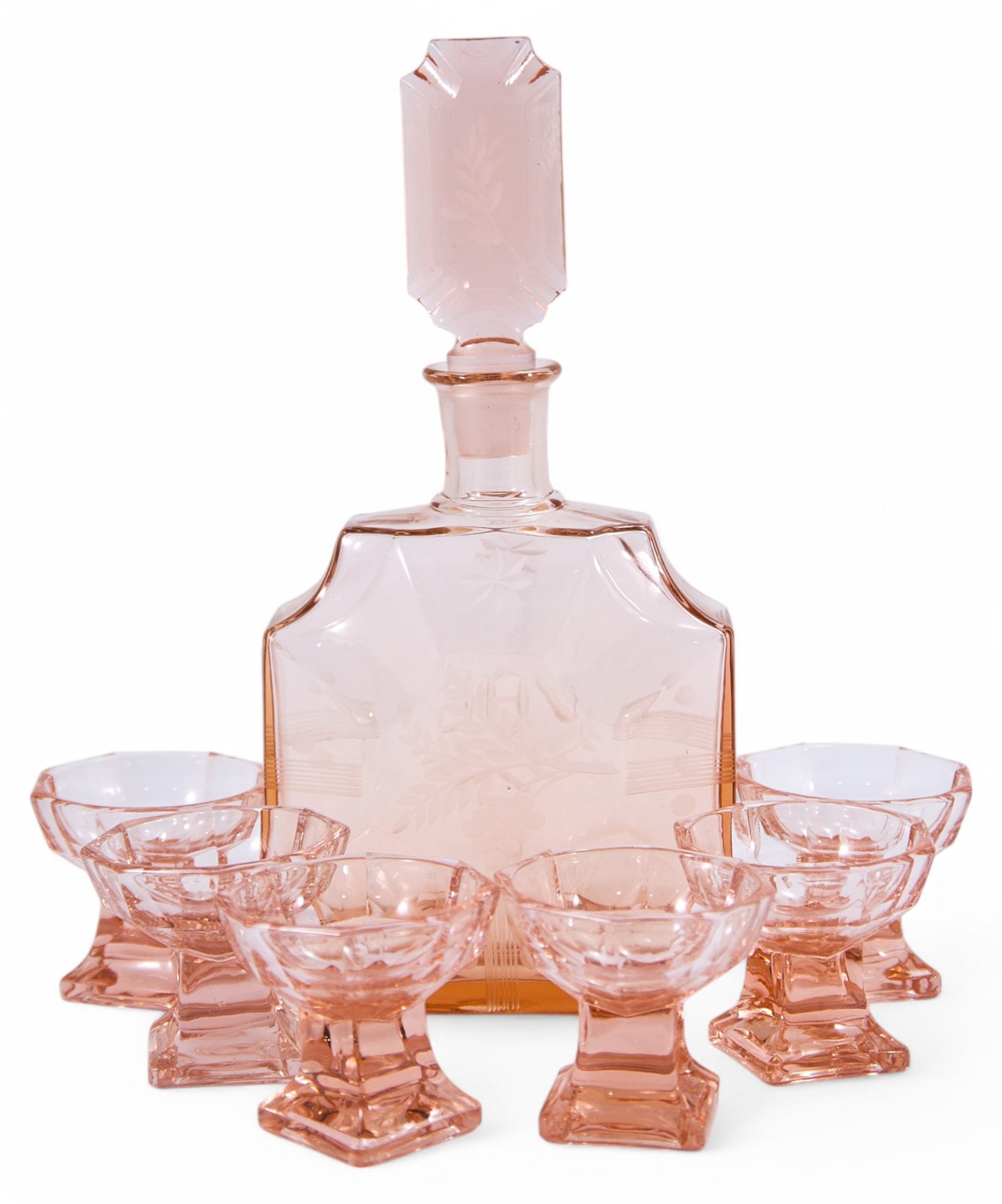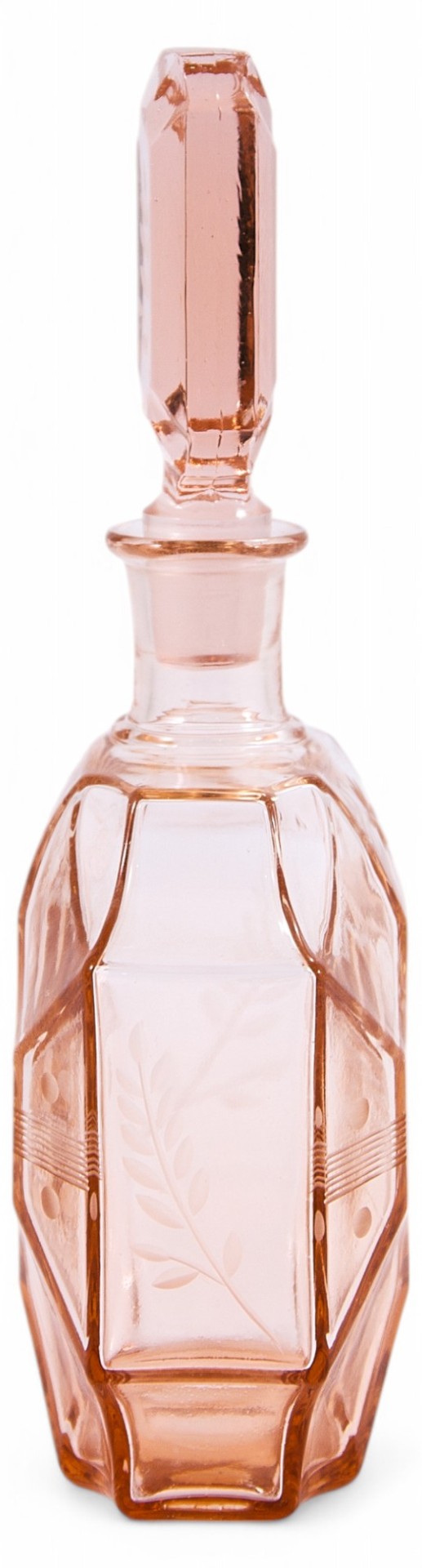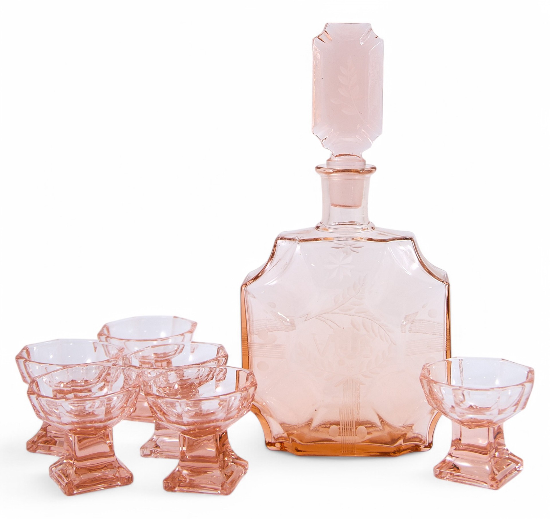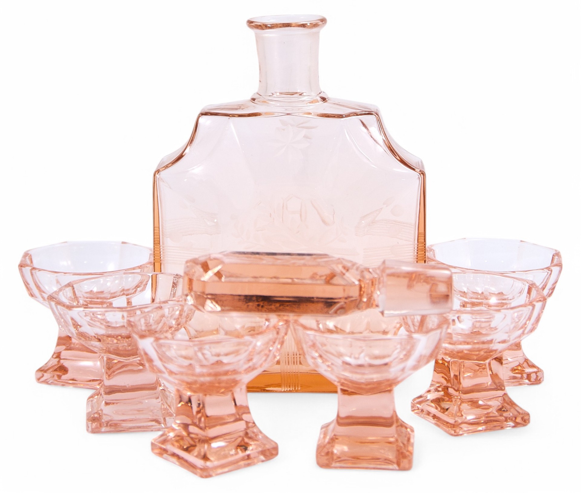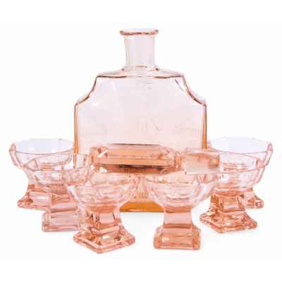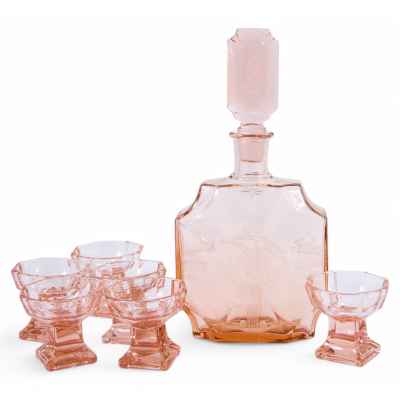 Антикварный набор для алкогольных напитков, изготовленный в Богемии в 1930-е годы, является прекрасным образцом стекла в стиле ар-деко. В комплект входят графин и шесть рюмок, выполненные из цветного стекла золотисто-оранжевого оттенка с использованием гранения и шлифовки.