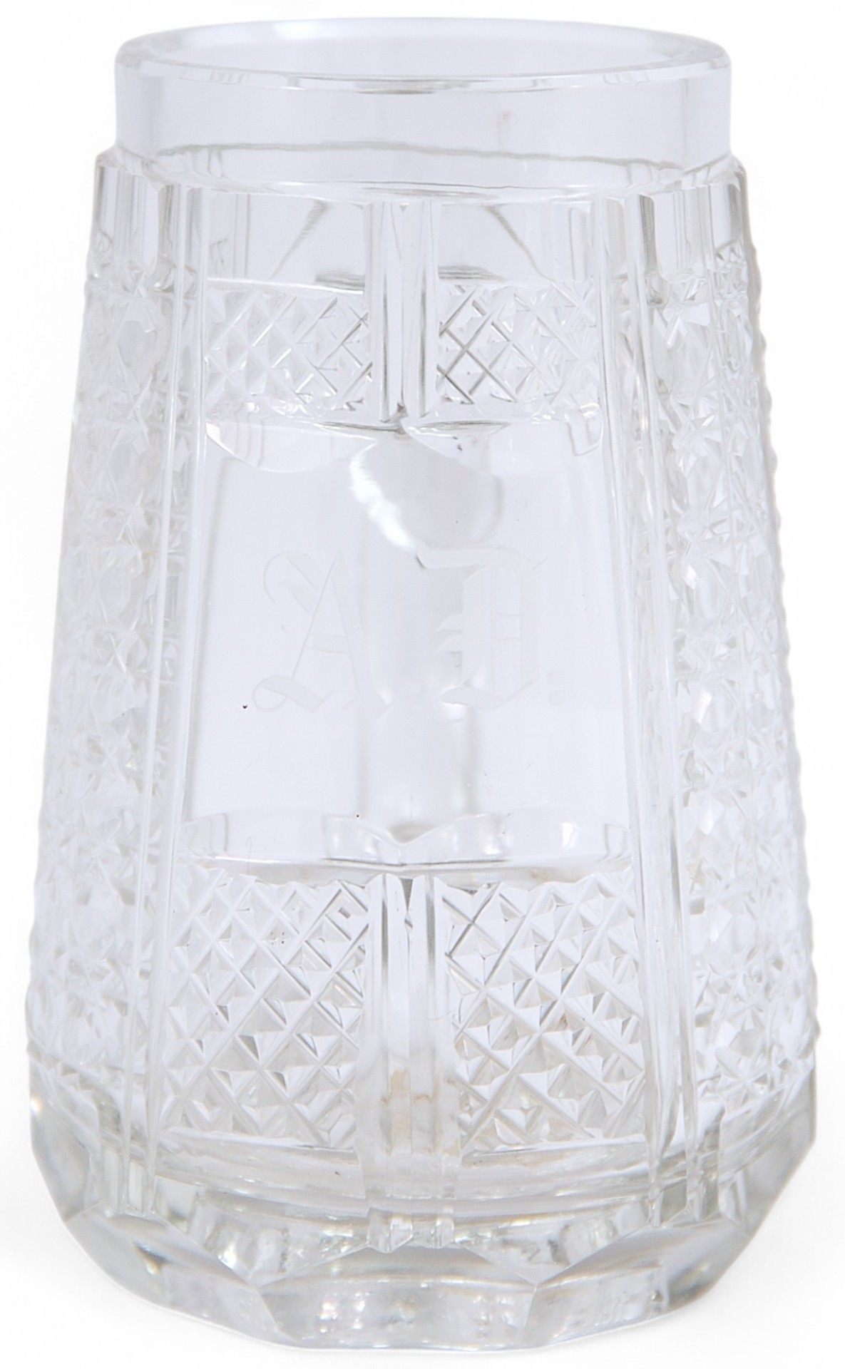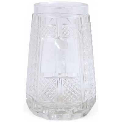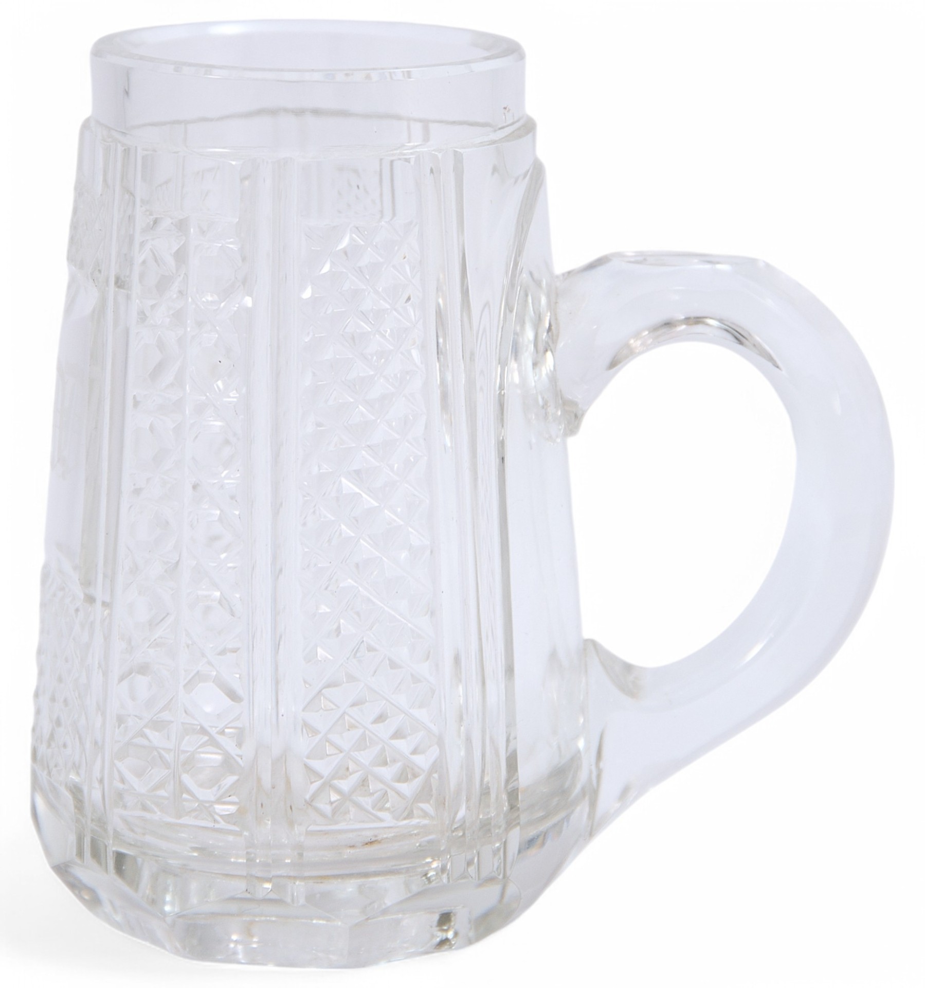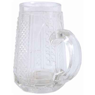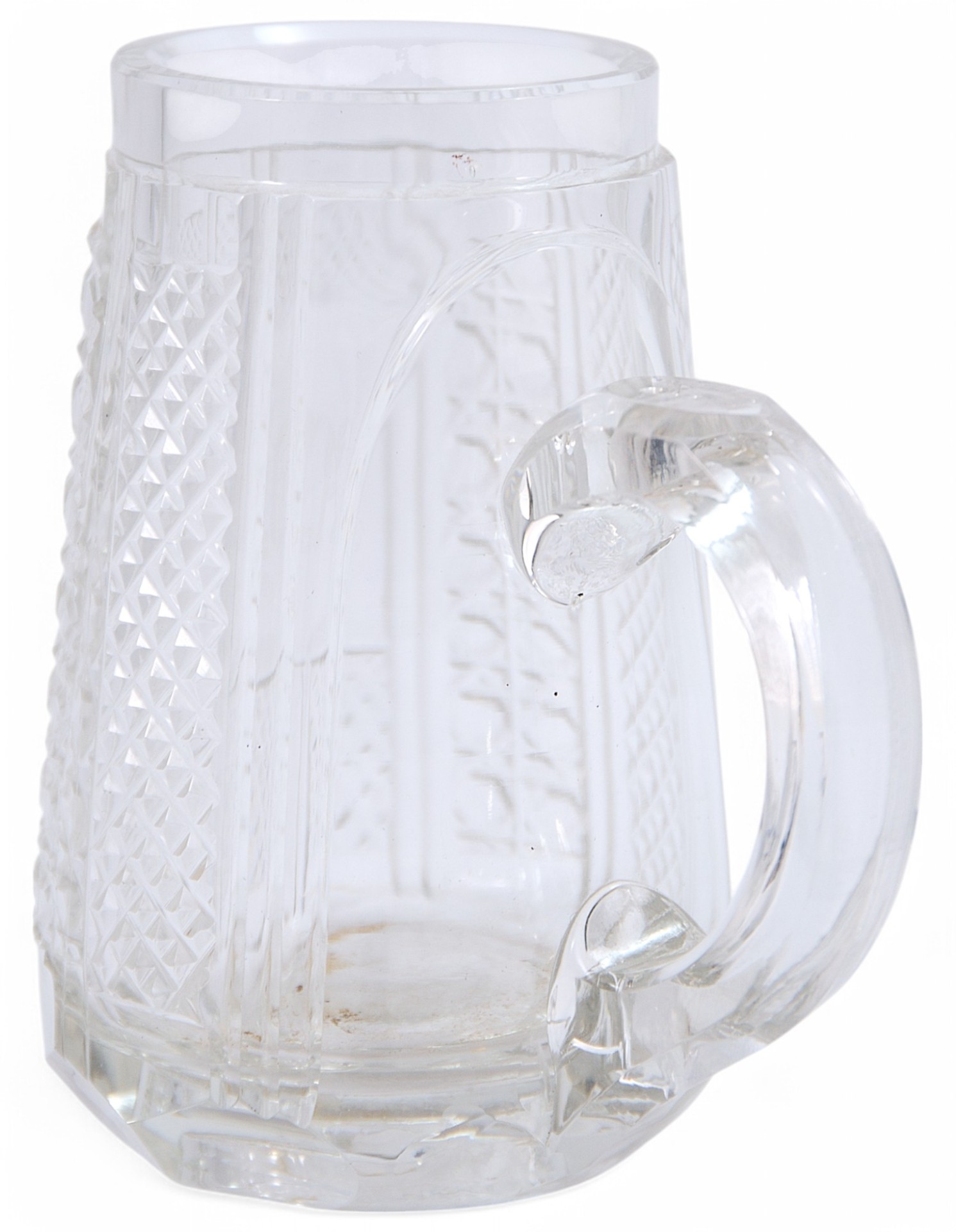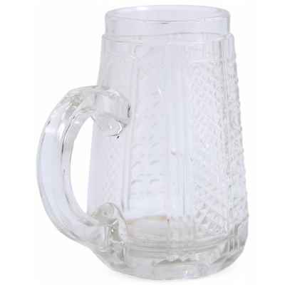Пивная кружка из прозрачного хрусталя, украшенного граненым рисунком. У края кружки выгравировано: ”0,3 L”. Стекло производится из кварцевого песка, углекислого калия и известняка. Эта смесь с добавкой стеклобоя плавится в печи при