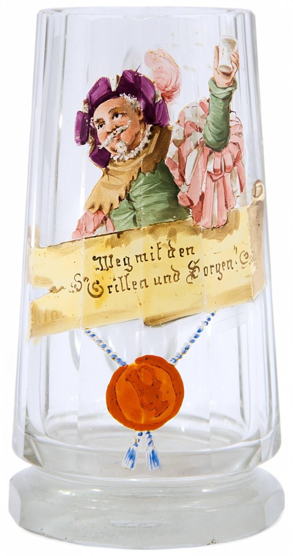 Пивная кружка граненой конусообразной формы декорирована изображением мужчины в характерном костюме, нанесенным