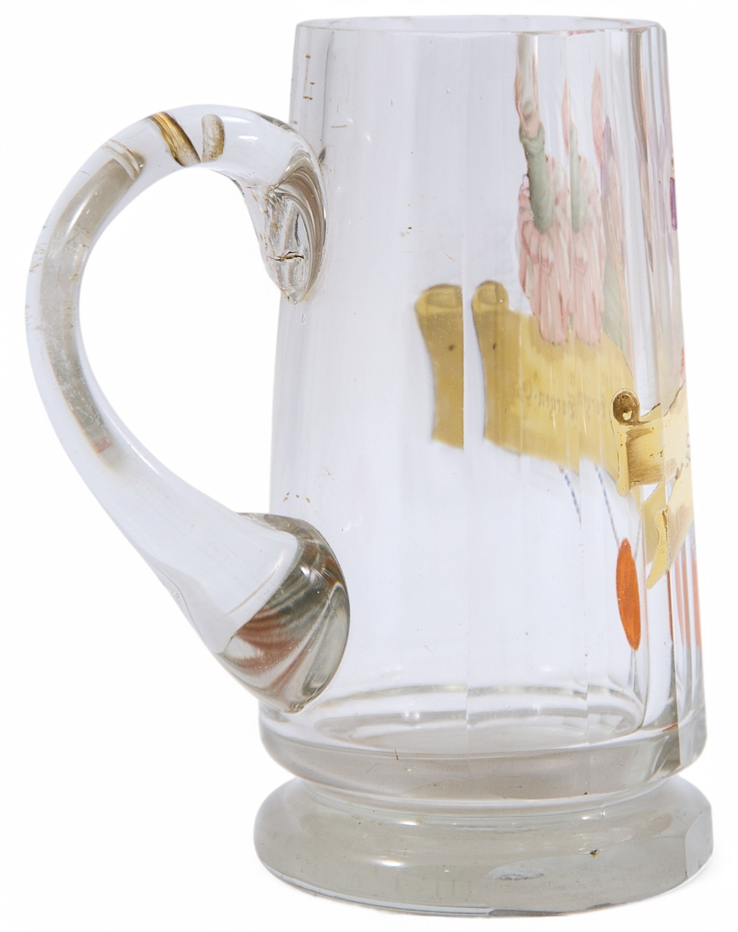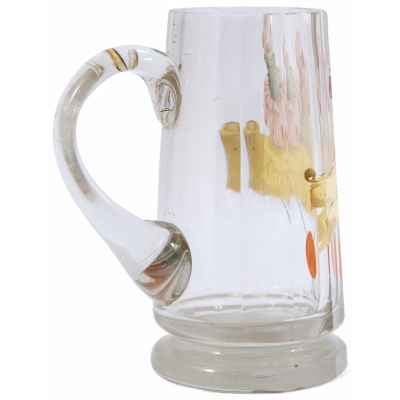 эмалями. На кружке присутствует пометка «0,3 L». Роспись отличается высоким уровнем исполнения и красочностью. Высококачественное богемское стекло с очень малым процентом содержания оксидов свинца было и остается чистым, прозрачным и сияющим. Наряду с французским и американским стеклом в стиле модерн конца XIX века - начала XX века, чешское стекло в том же стиле принадлежит к самому лучшему, что было создано в мире. Стеклозавод "Й.Лётц" из Клаштерского Млина, удостоенный многих призов на всемирных выставках (например, в Париже в 1900 г.), занимает ведущее место в производстве стекла в стиле модерн. Ключевое значение для достижения успеха чешским стеклом в стиле модерн конца XIX - начала XX века имело сотрудничество стеклозаводов с лучшими художниками. Небывалый расцвет художественное творчество в стиле модерн принесло стеклозаводу ’’Мозер” в Карловых Варах. Подобные кружки стоили дорого и были в большинстве своем подарочными, что поддерживало высокую репутацию богемского сувенирного стекла.