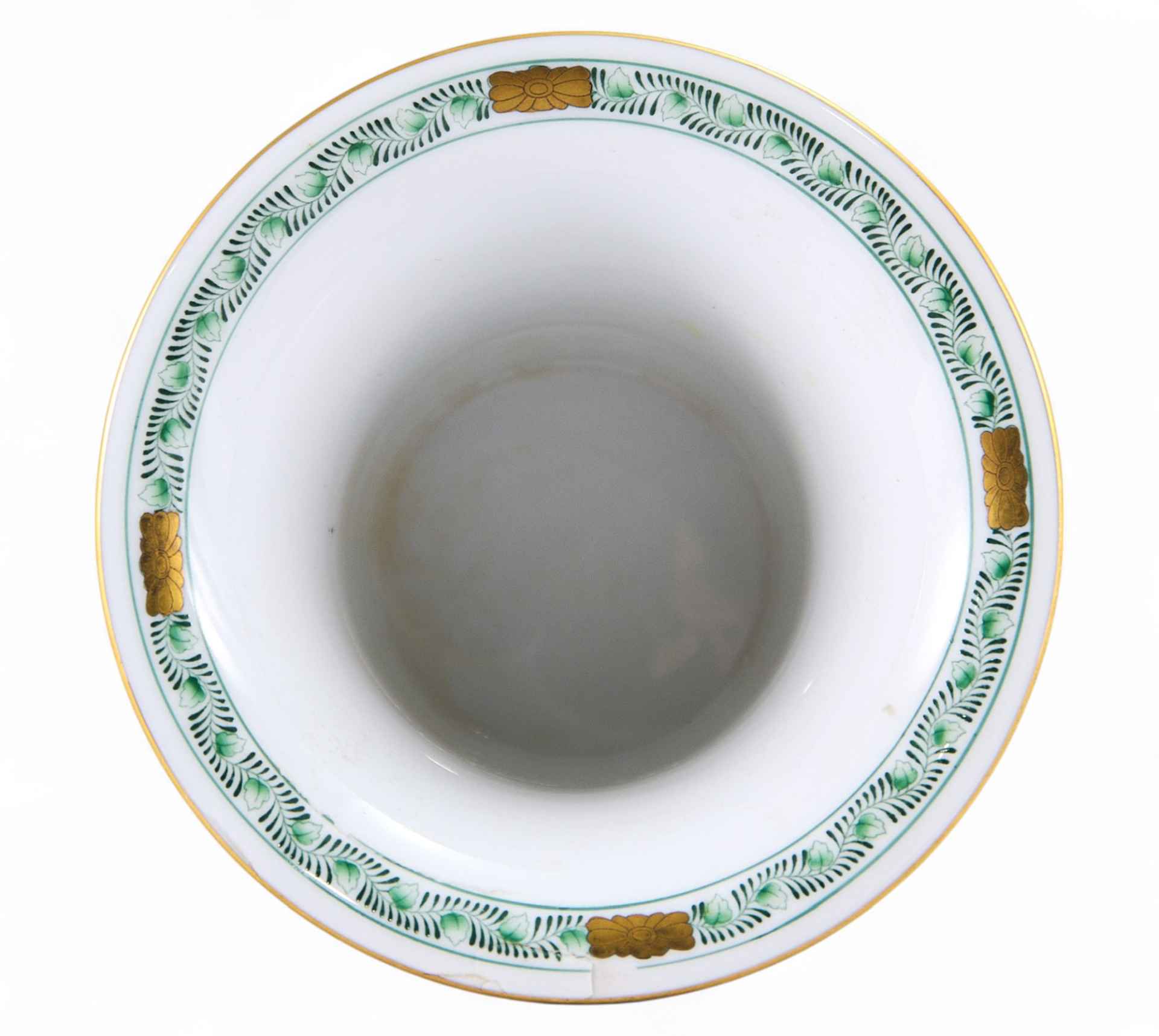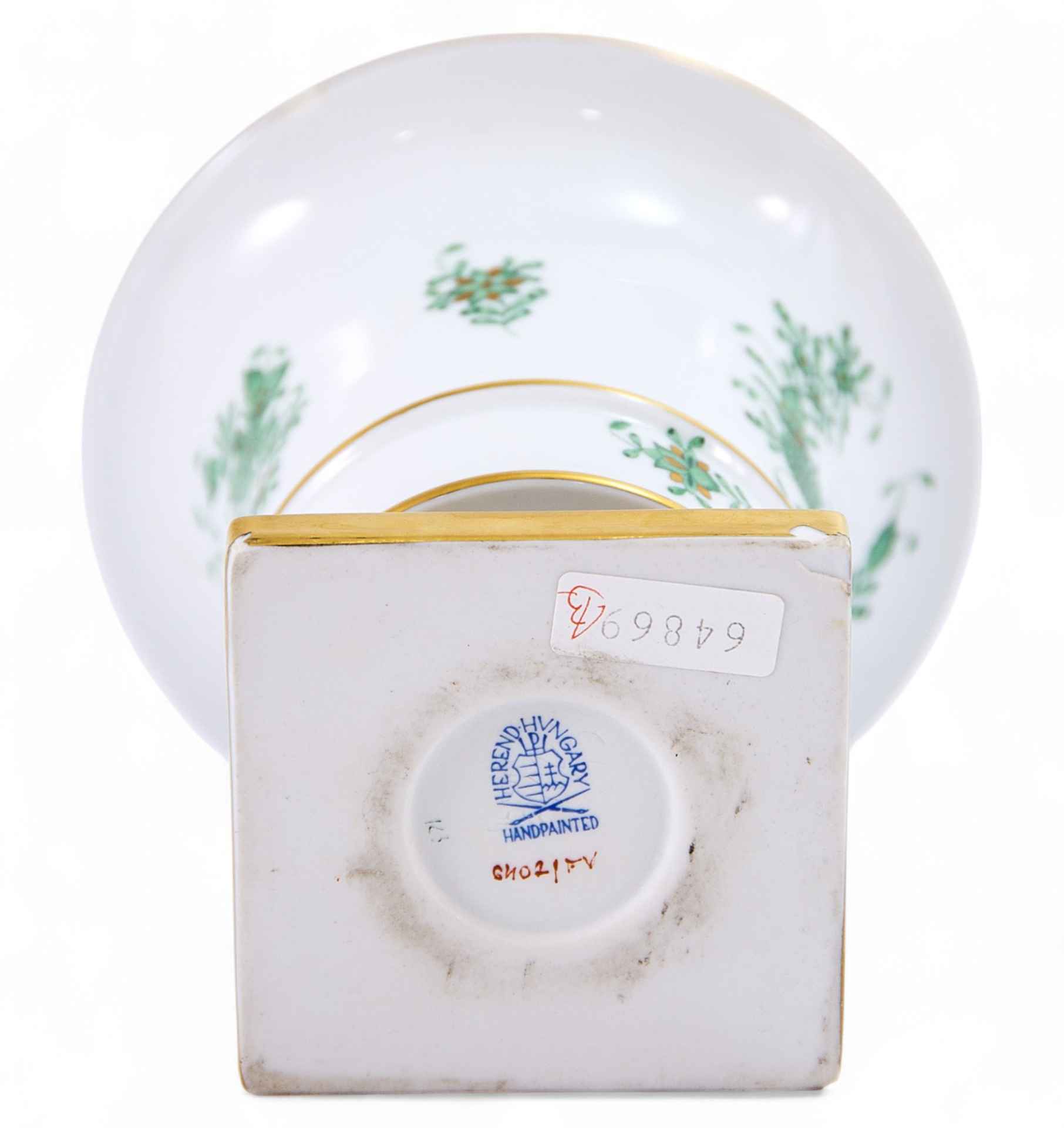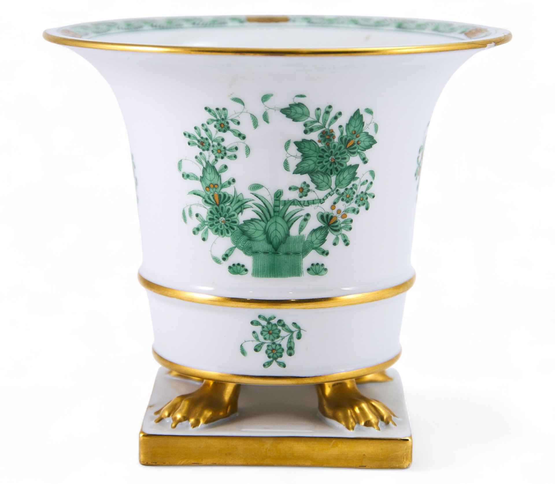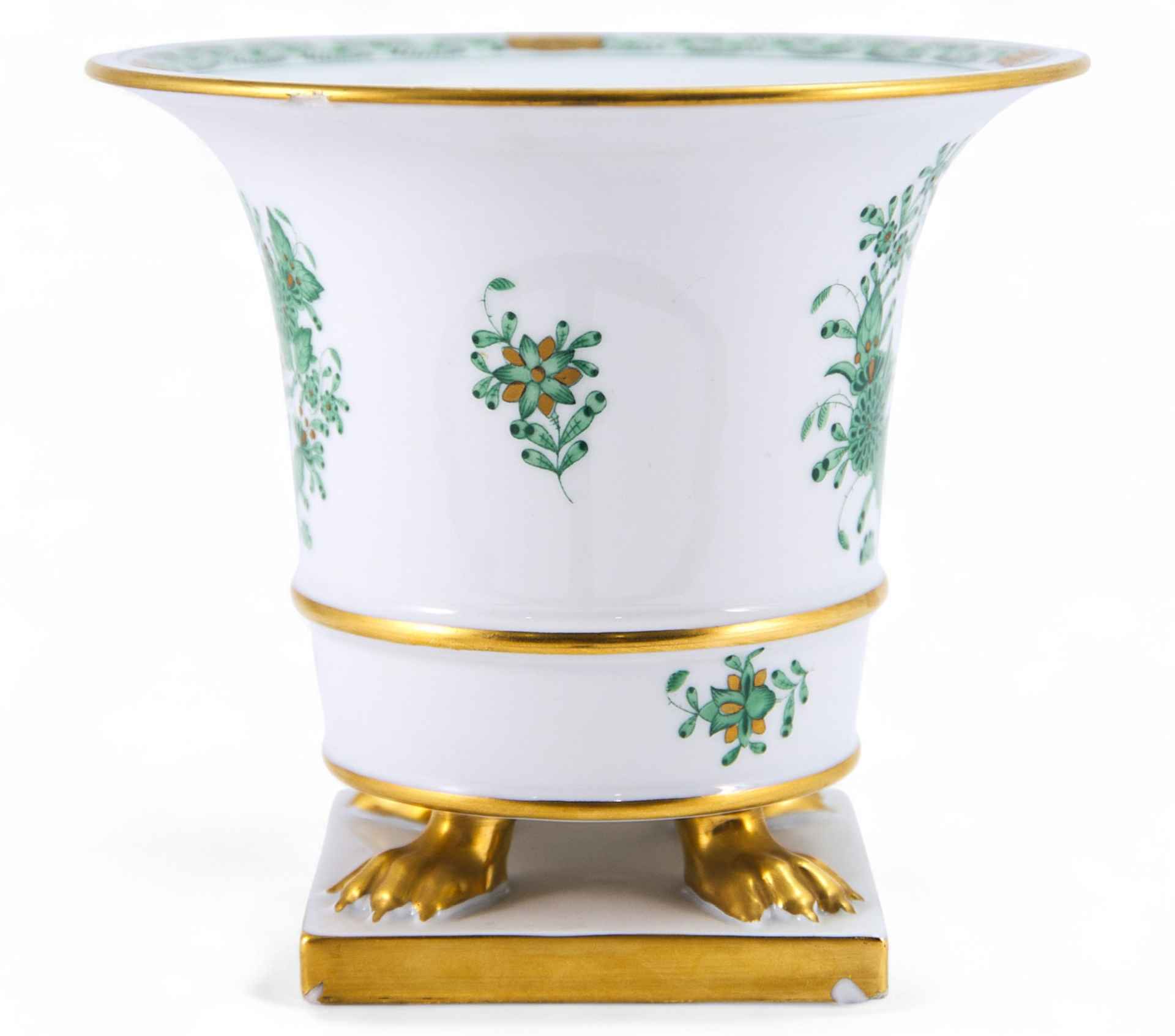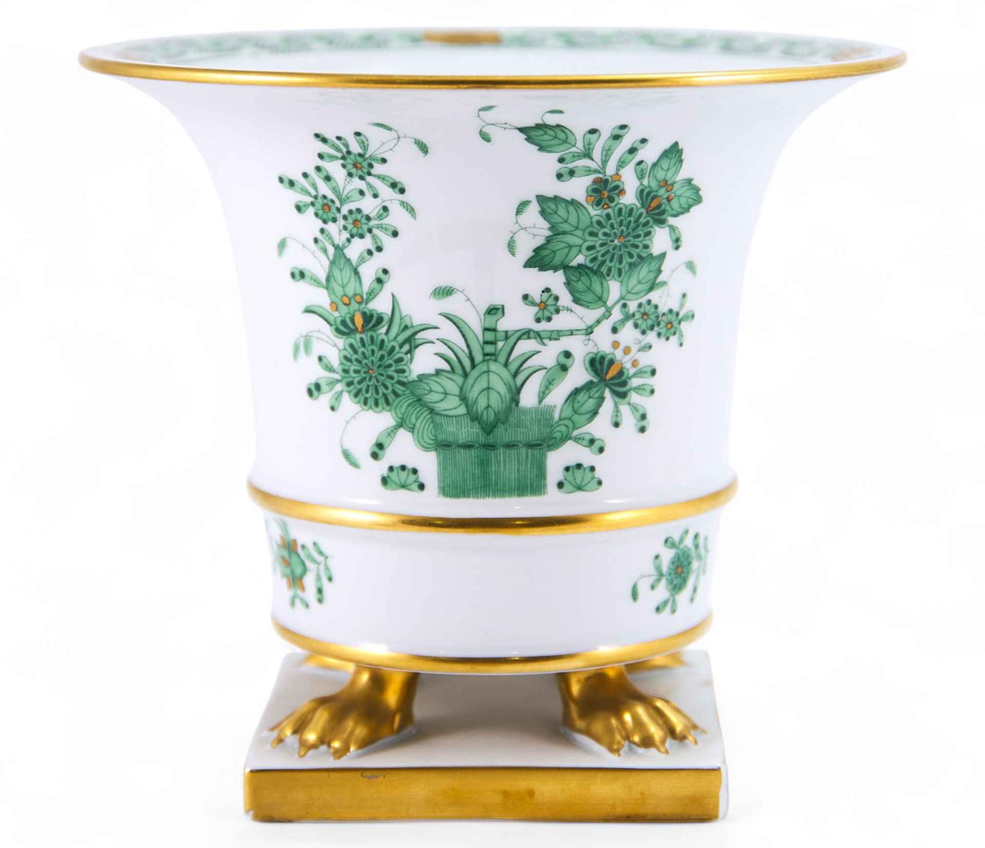 Белая ваза на подставке и ножках-лапах, с зеленым флориальным оформлением деколью. По дизайну своей формы ваза соответствует римскому стилю. На основании клеймо фарфоровой фабрики Херенд (Herend) 1960-х - 1986 годов Фарфоровая фабрика Херенд (Венгрия) В 1826 году, в небольшой деревушке Херенд (Herend), расположенной на склоне горы, открылась мастерская, выпускавшая керамические изделия. В 1839 году владельцем мастерской стал Мор Фишер (MórFischer), и это стало началом нового периода в развитии будущей фабрики. Фишер взял огромные ссуды на развитие фарфорового производства, первый коммерческий успех пришел довольно быстро. Заказчиками завода ’’Herend" стали венгерские аристократы, появились заказы на сервизы.В этот момент и формируется оригинальная и неповторимая школа росписи фарфора "Herend", ориентированная на изготовление уникального, расписываемого вручную фарфора. Некоторые рисунки, созданные в XIX веке, используются для росписи фарфора до сих пор ("Цветы Индии", "Птицы Ротшильдов", "Малые розы", "Королева Виктория"). Прославился "Herend" и росписями в стиле "шинуазри". С 1924 года завод стал выпускать фарфоровую скульптуру, как копии, так и оригинальные серии малой пластики. Модели делали известные венгерские скульпторы.