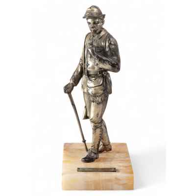 Скульптура «Охотник», представленная на изображении, выполнена в Европе в конце XIX — начале XX века и представляет собой выразительный образец камерной пластики в академической традиции. Композиция отлита из металла с применением техники литья, штампа и патинирования, и установлена на прямоугольное основание из мрамора, что подчёркивает её декоративный и мемориальный характер.