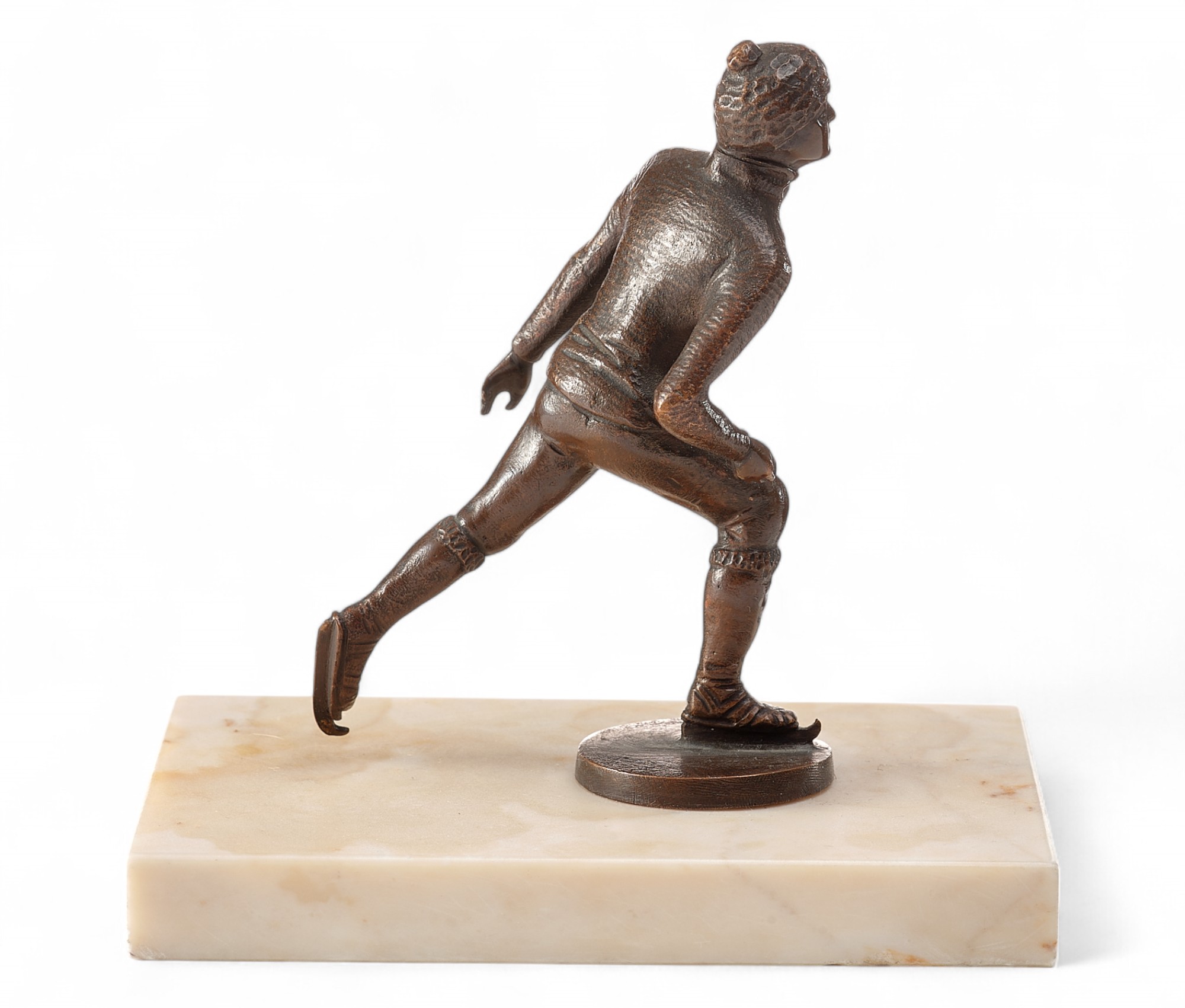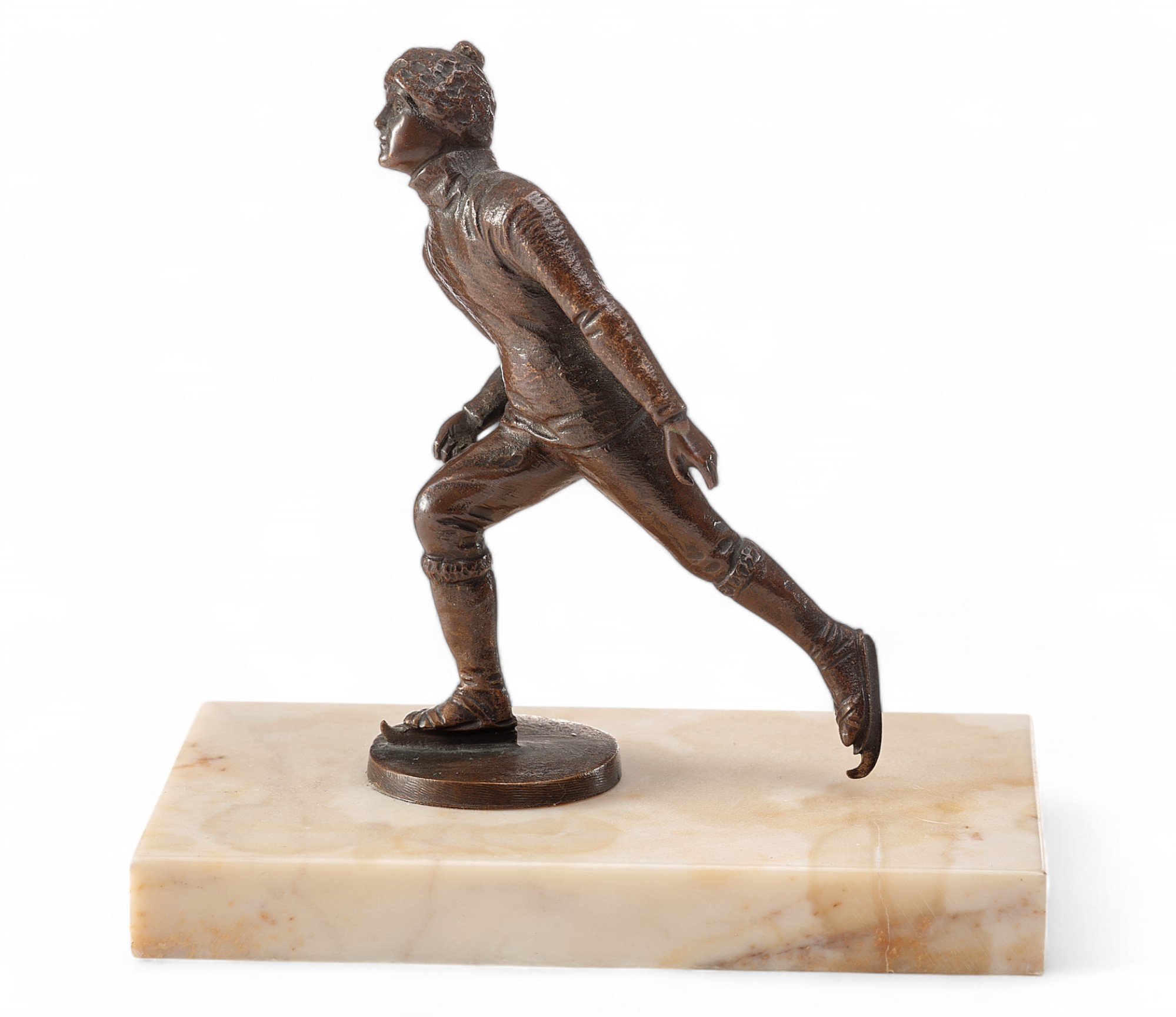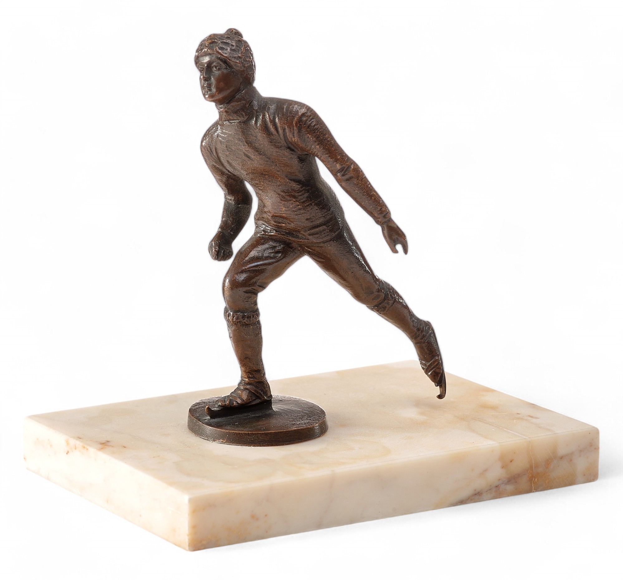 Скульптура «Конькобежец» представляет собой миниатюрное бронзовое произведение, выполненное в традициях венской бронзы, популярной в Европе в первой четверти XX века. Она изображает спортсмена в момент движения, с одной ногой, вытянутой назад, и выразительной динамикой позы, передающей скорость и грацию катания на коньках.
