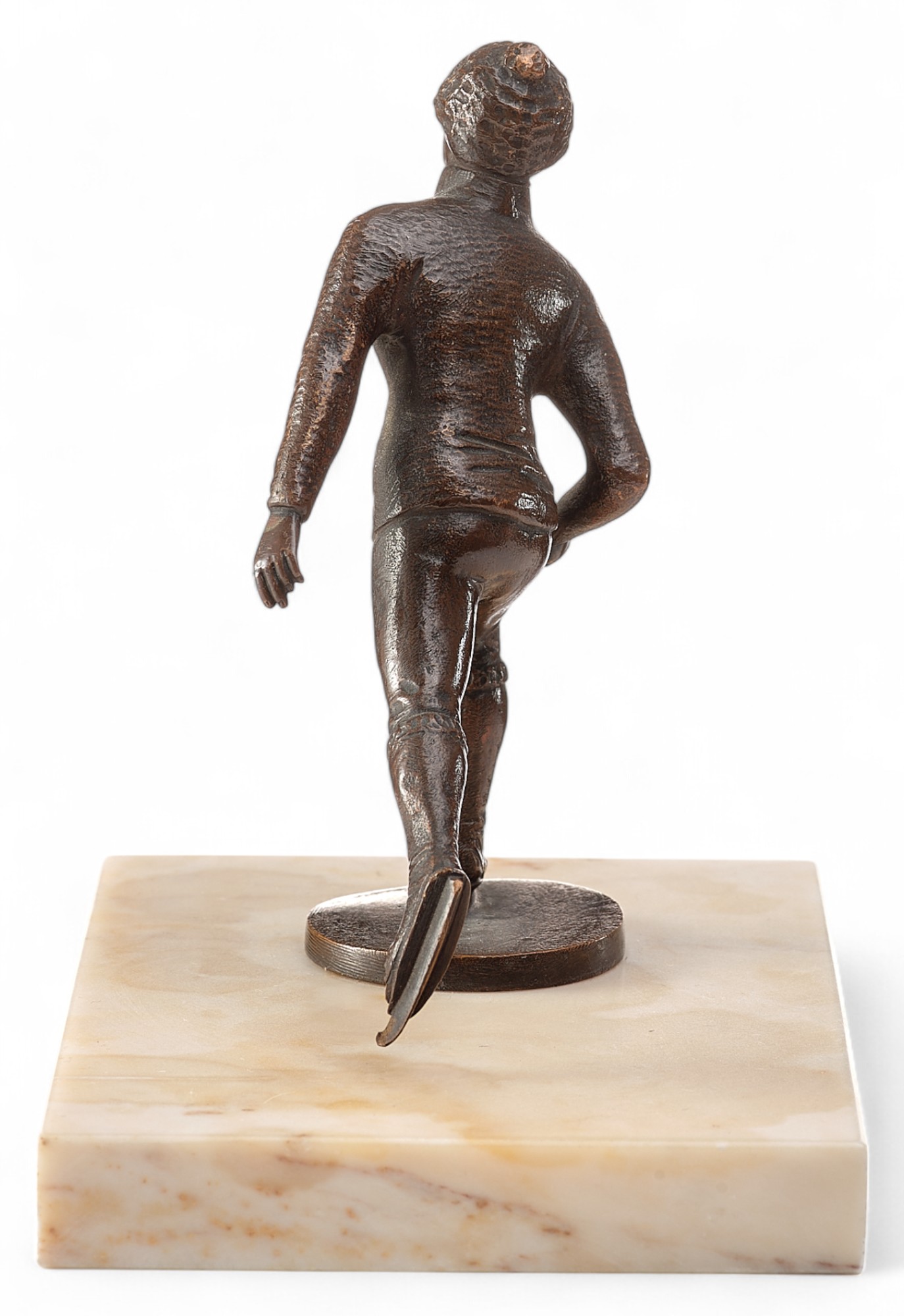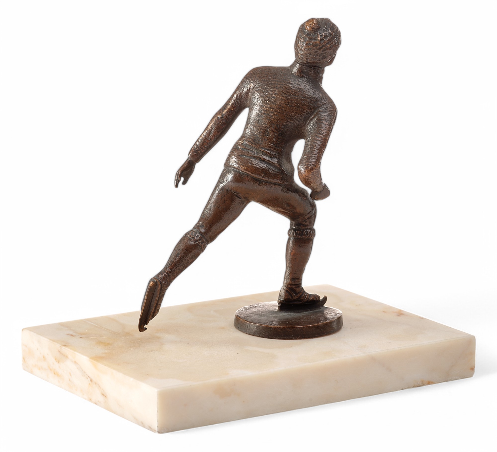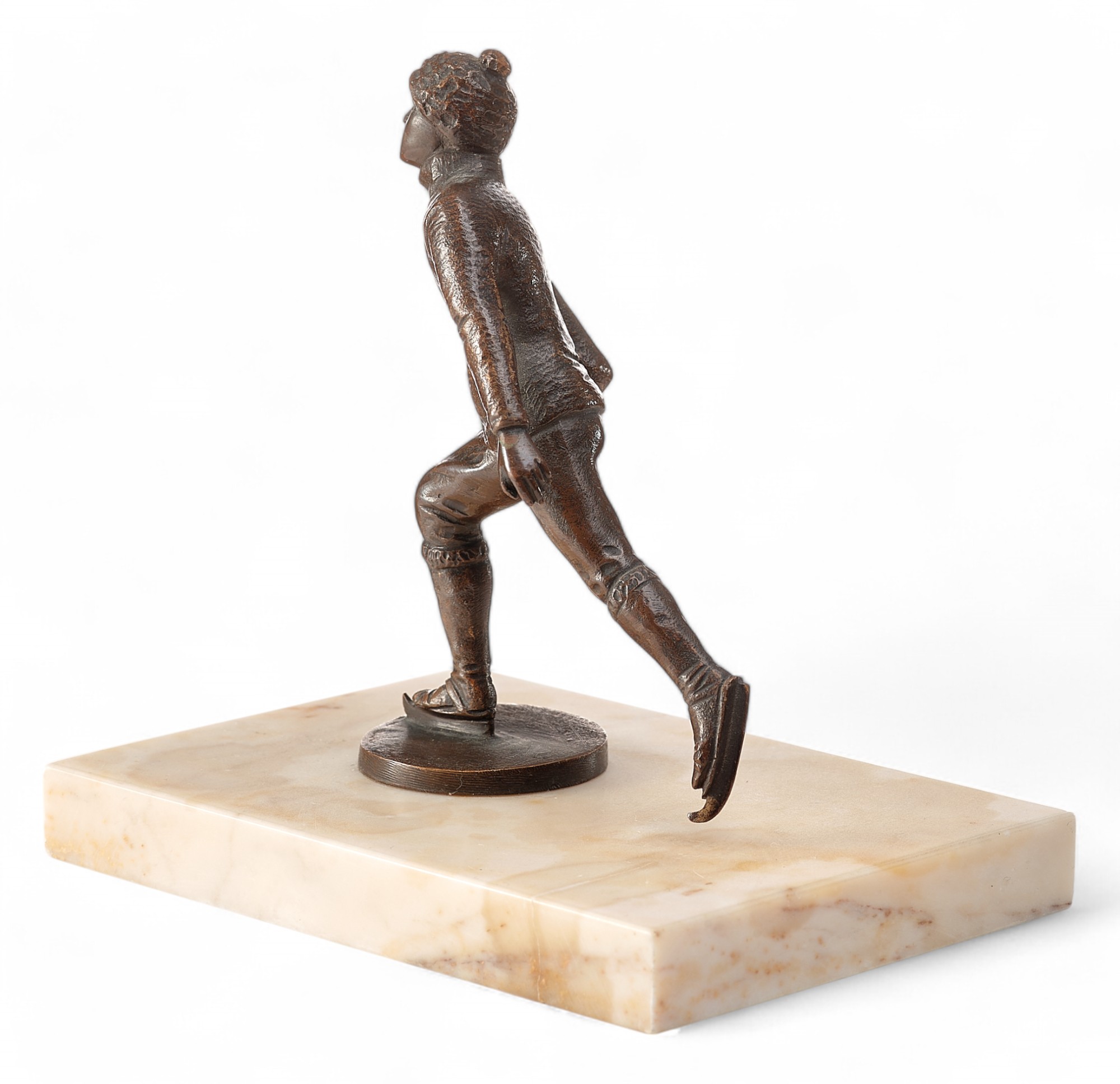 Скульптура «Конькобежец» представляет собой миниатюрное бронзовое произведение, выполненное в традициях венской бронзы, популярной в Европе в первой четверти XX века. Она изображает спортсмена в момент движения, с одной ногой, вытянутой назад, и выразительной динамикой позы, передающей скорость и грацию катания на коньках.
