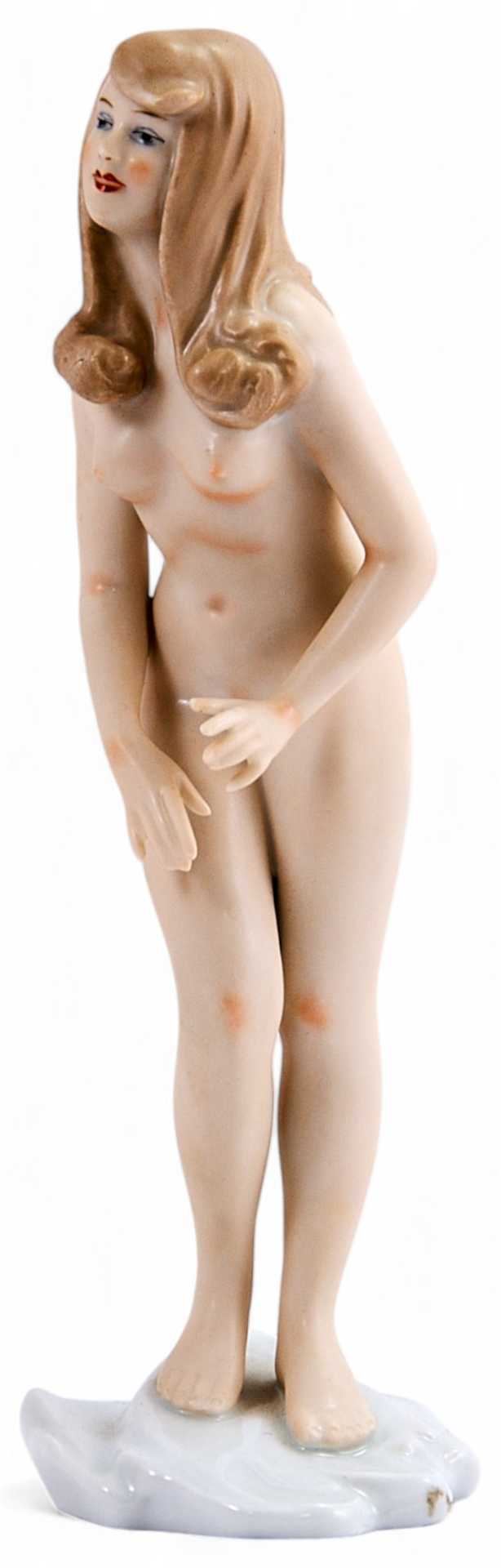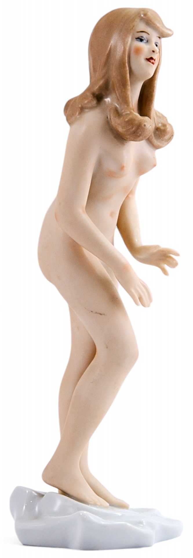 Фигура обнаженной девушки, раздевшейся перед купанием. На донышке основания скульптуры имеется клеймо фарфоровой фабрики Валлендорф, ставившееся после 1963 г с надписью: Handarbeit (ручная работа). Клеймо «в тесте»: М 1922. Надпись появилась в 1980-1990-х гг. Валлендорф (Waliendorf), Тюрингия. Небольшая фабрика, основанная в 1763 году Иоганном