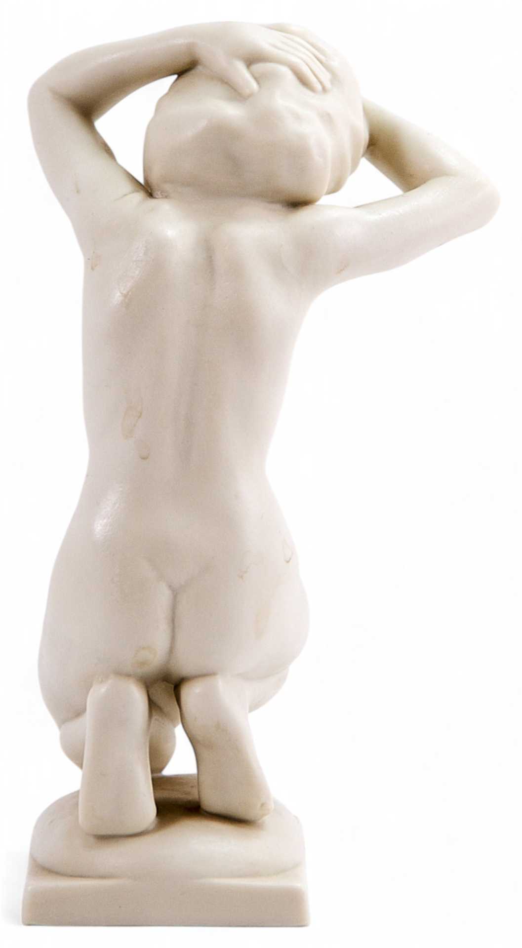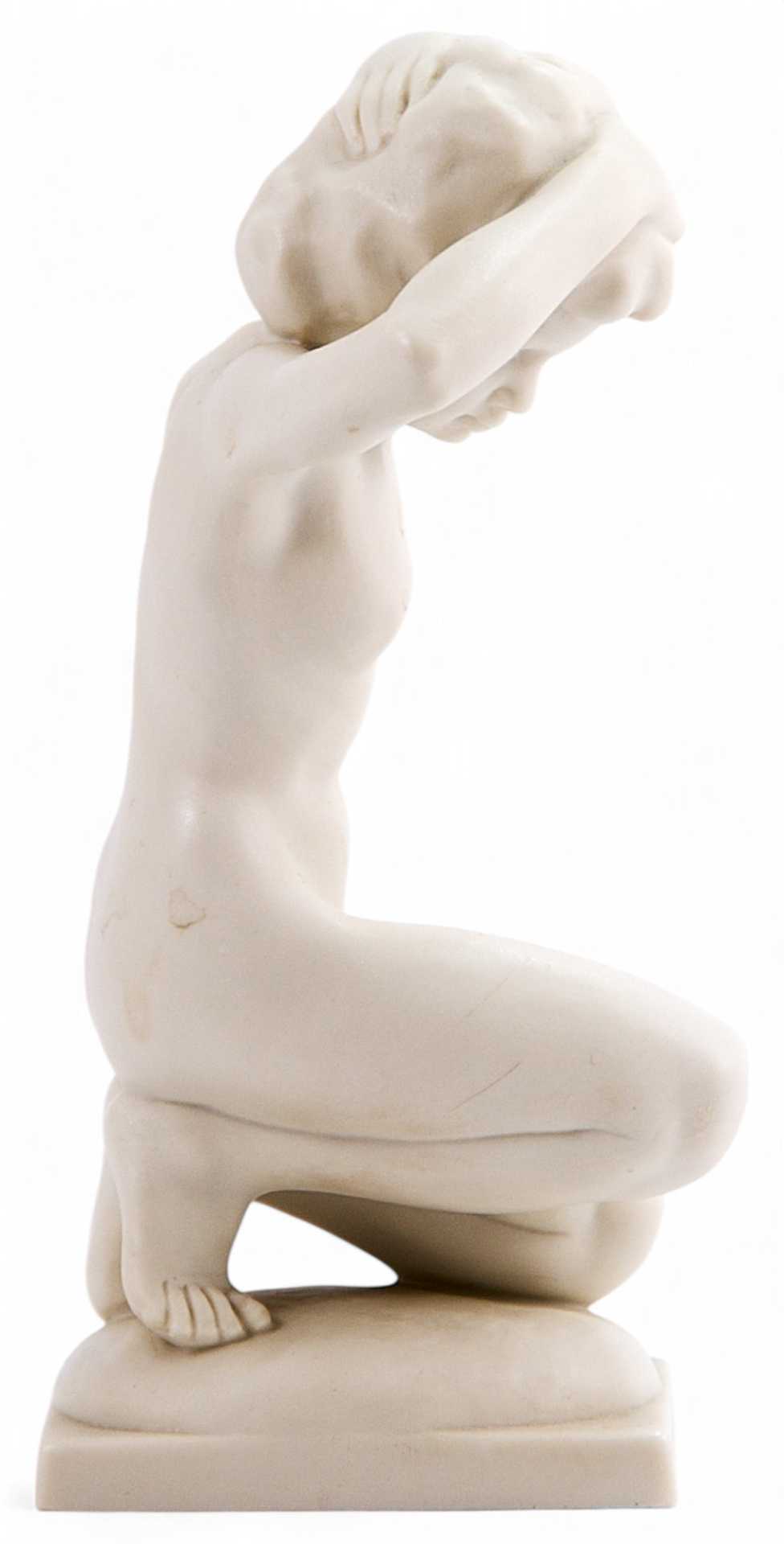 Фарфоровая скульптура сидящей обнаженной женщины, перебирающей руками волосы на голове. На основании клеймо фарфоровой фабрики Lorenz Hutschenreuter, ставившееся с 1968 по 1970 гг. Состояние использованных материалов не противоречит указанной датировке. Фарфоровая фабрика Lorenz Hutschenreuter (Германия) Компания была основана в 1814 году Карлом Магнусом Хютшенреутером (1794-1845) в Хоэнберге дер Эгер, Бавария. Ранее он работал на фарфоровой мануфактуре в Лихте (WaUendorf). После его смерти в 1845 году завод возглавила его вдова, Йоханна Hutschenreufher, и два ее сына. С 1860 года они произвели ручную роспись позолоченного фарфора. Большая часть завода была уничтожена пожаром в 1848 году, но он был перестроен. В начале XX века, фабрика Hutschenreuther быстро росла, поглощая заводы в Altrohlau (ныне Стара Роль, Карловарский регион) в1909г. и Карла Аувера (Auvera) в Арцберге в 1918/1919 гг. В 1857 году Лоренц Hutschenreuther (сын К.М Hutschenreuther-a) установили фарфоровый завод в Зельбе (Selb). Эта фирма расширилась с 1902 по 1969 гг. и стала фарфоровой фабрикой Lorenz Hutschenreuther AG (фарфоровые заводы компании) Selb. В 1969 г. компания Lorenz Hutschenreuther объединилась С. М Hutschenreuther в Хоэнберге. За годы своего существования кампания приобрела ряд заводов-производителей фарфора: Jaeger, Werner & Co., Selb (1906), Paul Mueller, Selb (1917), Brauscher brothers, Weiden (1927), Tirschenreuth porcelain factory' (1927), Konigszelt porcelain factory, Konigszelt (today Jaworzyna Slaska), Silesia (1928). На сегодняшний день собственником компания Hutschenreuther является немецкий производитель фарфора компания Rosenthal AG. Karl Tutter (28 сентября 1883- 28 марта 1969) - немецкий скульптор. Работал на фабрике Лоренца Хютсченройтера более 40 лет. Создавал скульптуры животных, обнаженную натуру, жанровые композиции. Являлся одним из лучших заводских скульпторов в период ар-деко. Образование получил в художественной школе в Австрии, а также в частной школе Йозефа Майра (Josef Mayr). После Первой Мировой войны он 6 лет провел в Хабаровске, работая художником-портретистом. С 1922 г. он работал скульптором на заводе Лоренца Хютсченройтера вместе с Карлом Вернером, способствуя поднятию авторитета фабрики на мировой уровень. Успешно завоевывал признание своими работами на выставках в Мюнхене, Праге и др. городах. В 1941 г. выиграл приз за скульптуру в г. Байройт.