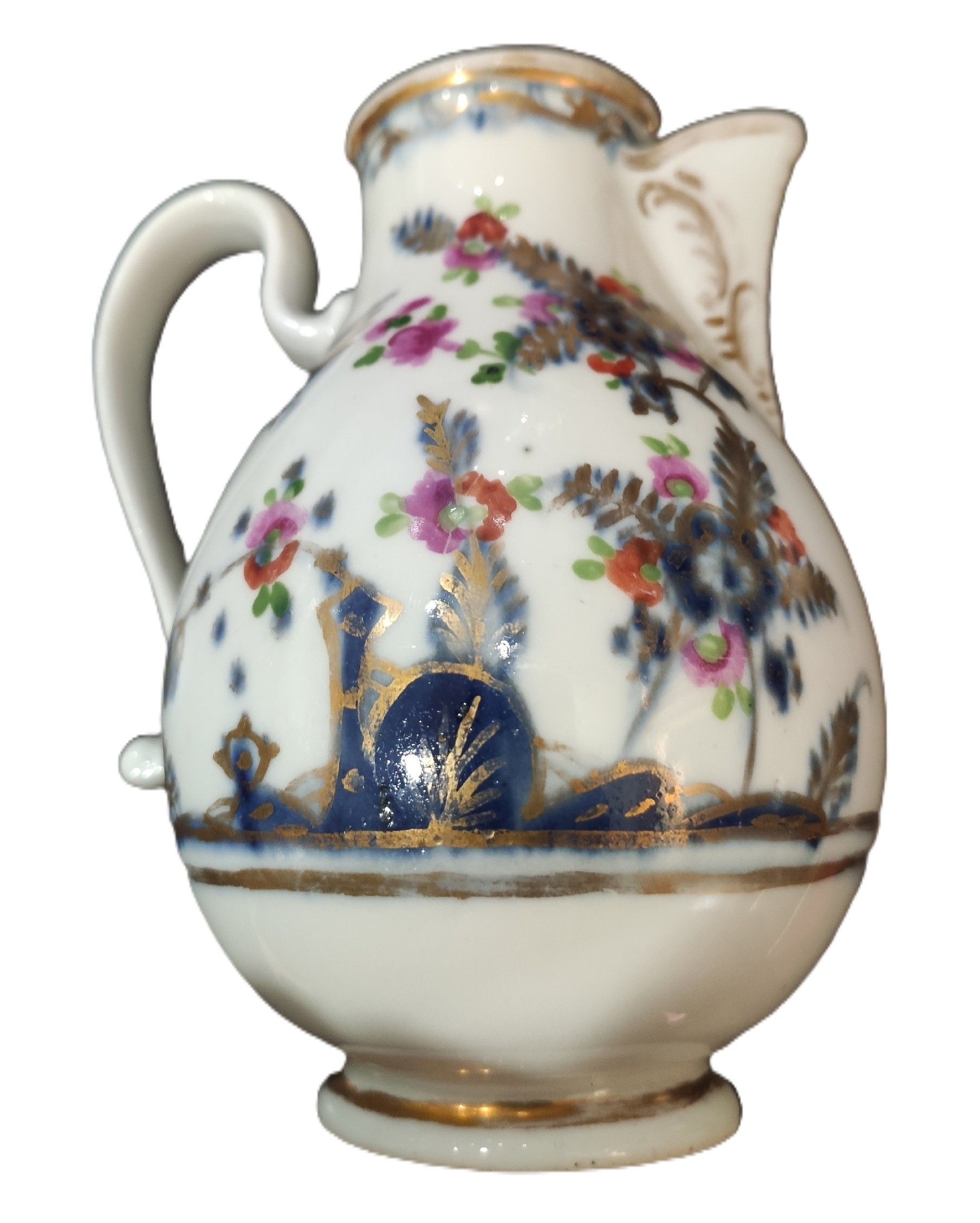 Этот фарфоровый молочник, изготовленный в последней четверти XIX века в Австро-Венгрии, представляет собой образец декоративного фарфора, выполненного в подражание стилистике конца XVIII века. Он украшен ручной росписью с изображением цветочных букетов и элементами золочения.
