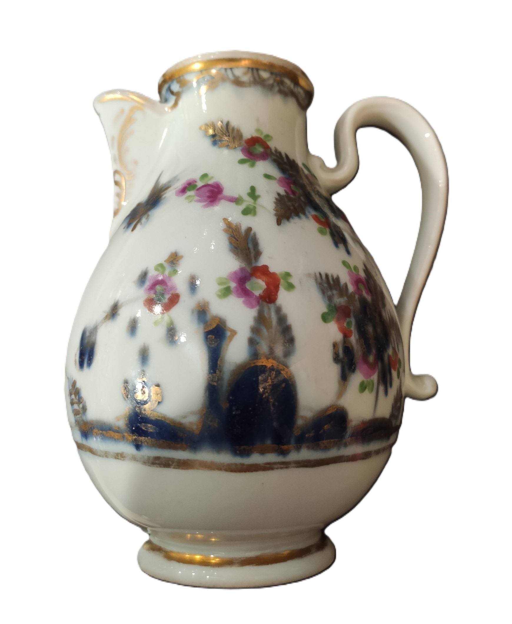 Молочник имеет высоту 14 см и изящную, слегка вытянутую форму с плавно изогнутой ручкой. Основной мотив росписи включает нежные цветочные орнаменты, выполненные в естественных оттенках, с добавлением подглазурной синей росписи, создающей эффект глубины изображения. Отдельные элементы, такие как декоративные завитки и бордюр по краю, выделены золотом, что подчеркивает изысканность изделия.