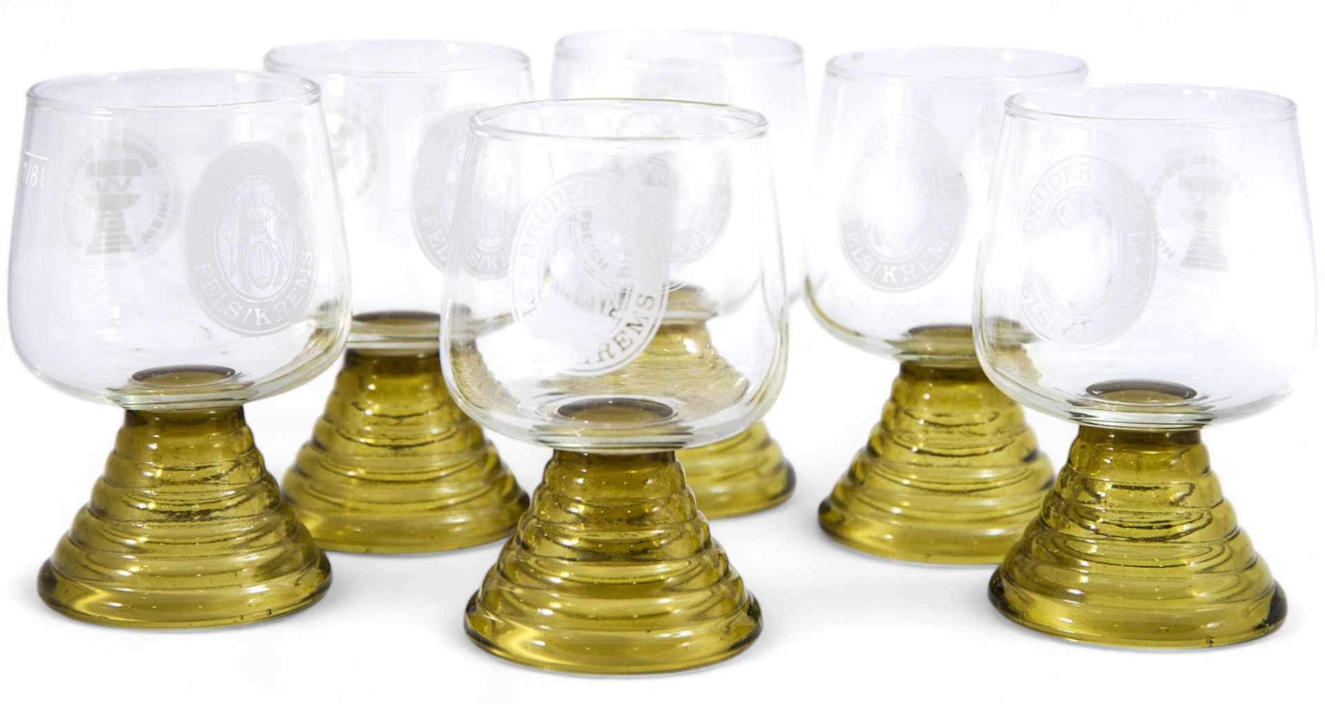 На стекле присутствуют выгравированные надписи: WEINGUTESIGEL ÖSTERREICH и BRUDER GRILL FELS KREMS. Первая обозначает знак качества австрийских вин, учреждённый с 1973 года — винное маркетинговое сообщество Австрии. Вторая указывает, вероятно, на ресторан или винодельню Brüder Grill в районе Фельс-Кремс, одном из известных винодельческих центров Нижней Австрии. Это позволяет предположить, что бокалы изготавливались специально для дегустационного использования в гастрономическом или ресторанном контексте, возможно, в рамках продвижения винного бренда.