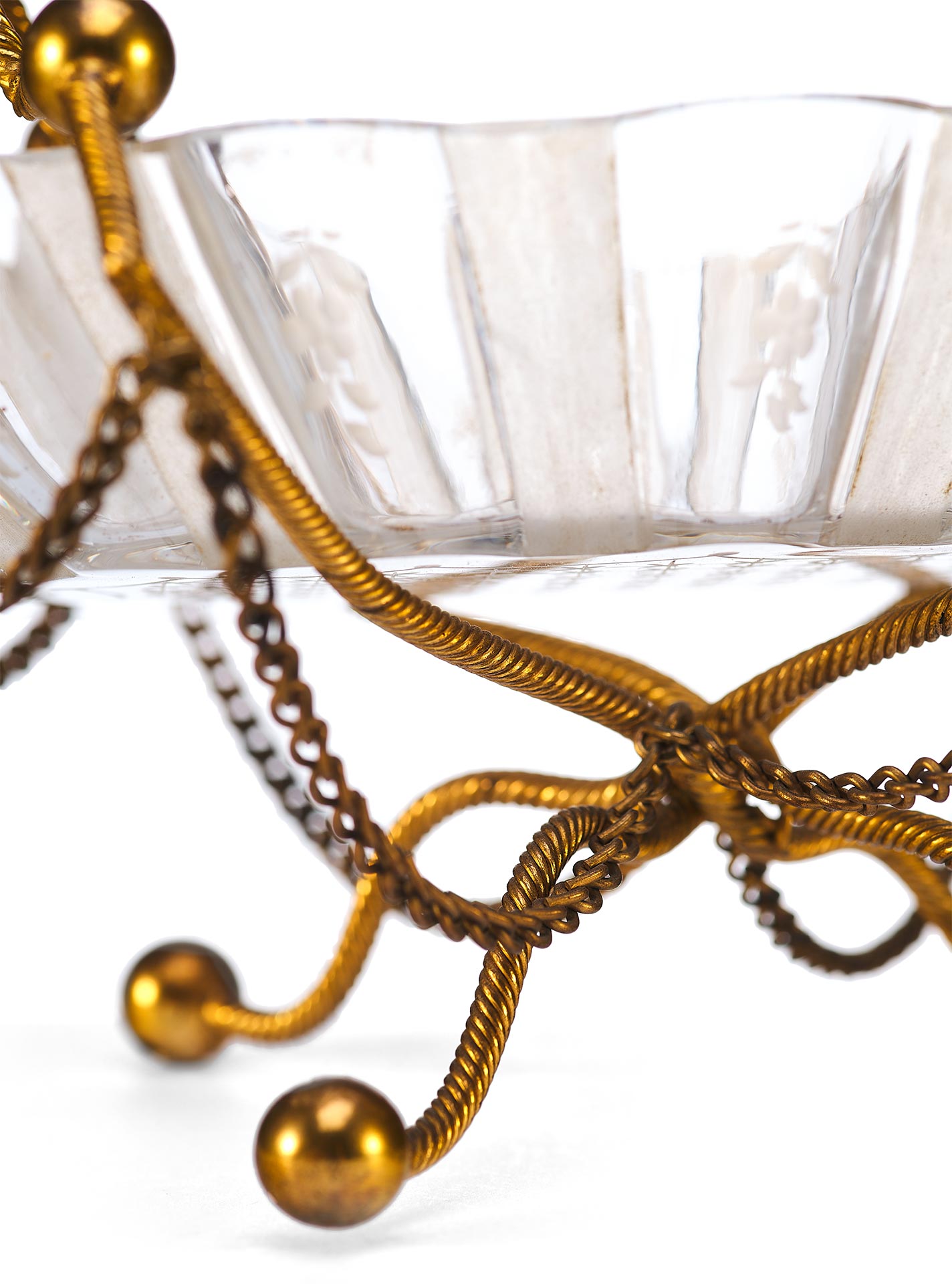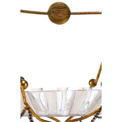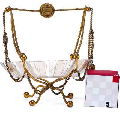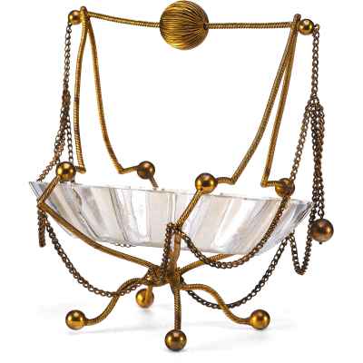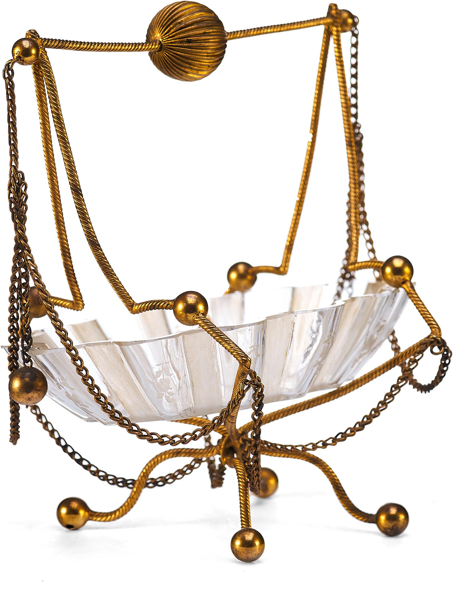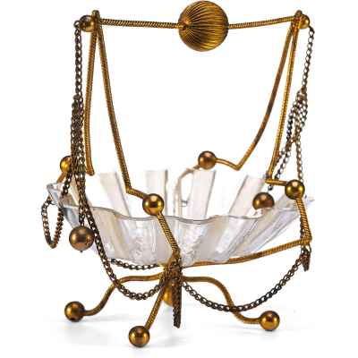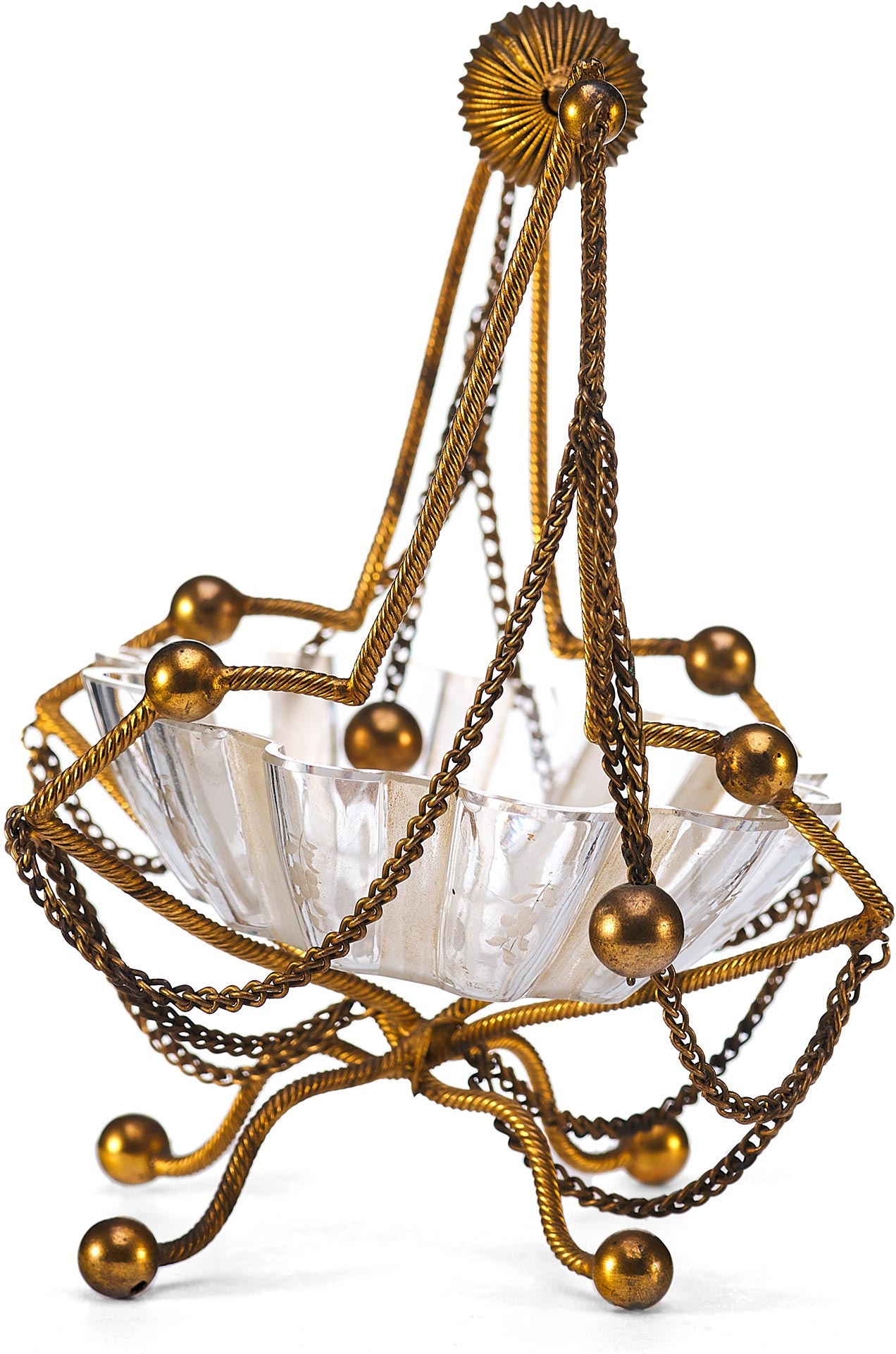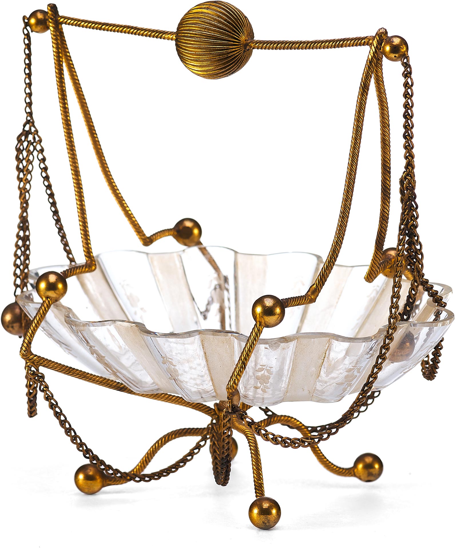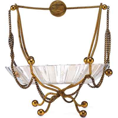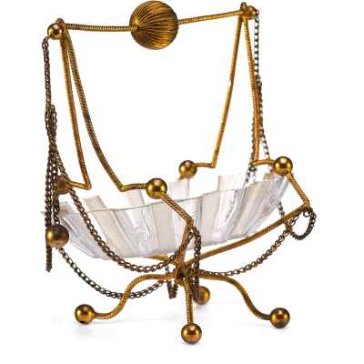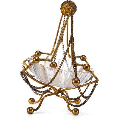 Чаша выполнена в форме распустившегося цветка с гофрированными краями и украшена изящной ручной гравировкой. Основная декоративная и функциональная часть — металлическая подставка и каркас, созданные из тонкой витой проволоки с шарообразными завершениями. Конструкция дополнена изогнутыми ножками и подвесными цепочками, придающими предмету воздушность и элегантность. Верх композиции венчает декоративная ручка с крупным фактурным шаром.