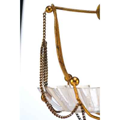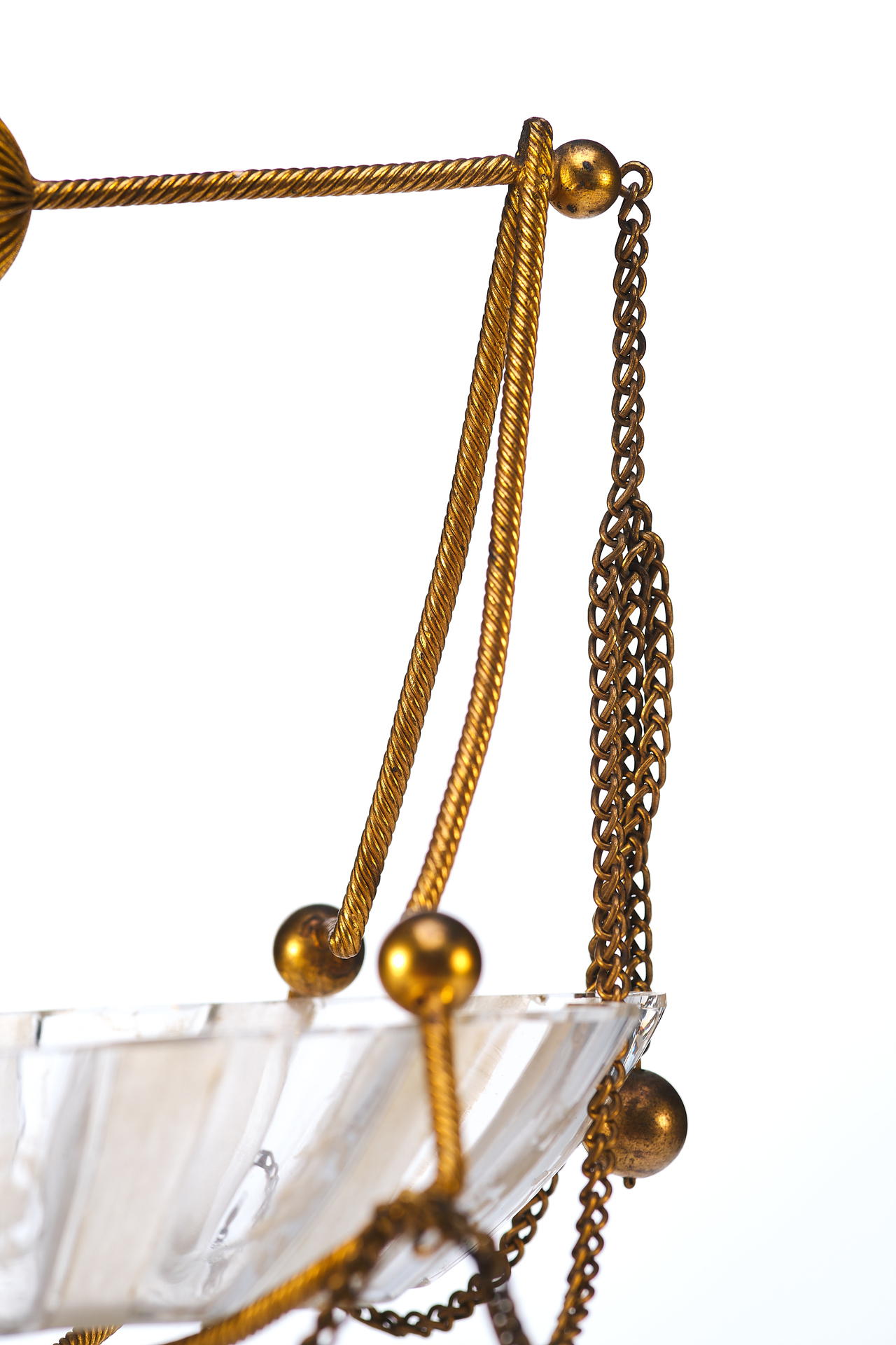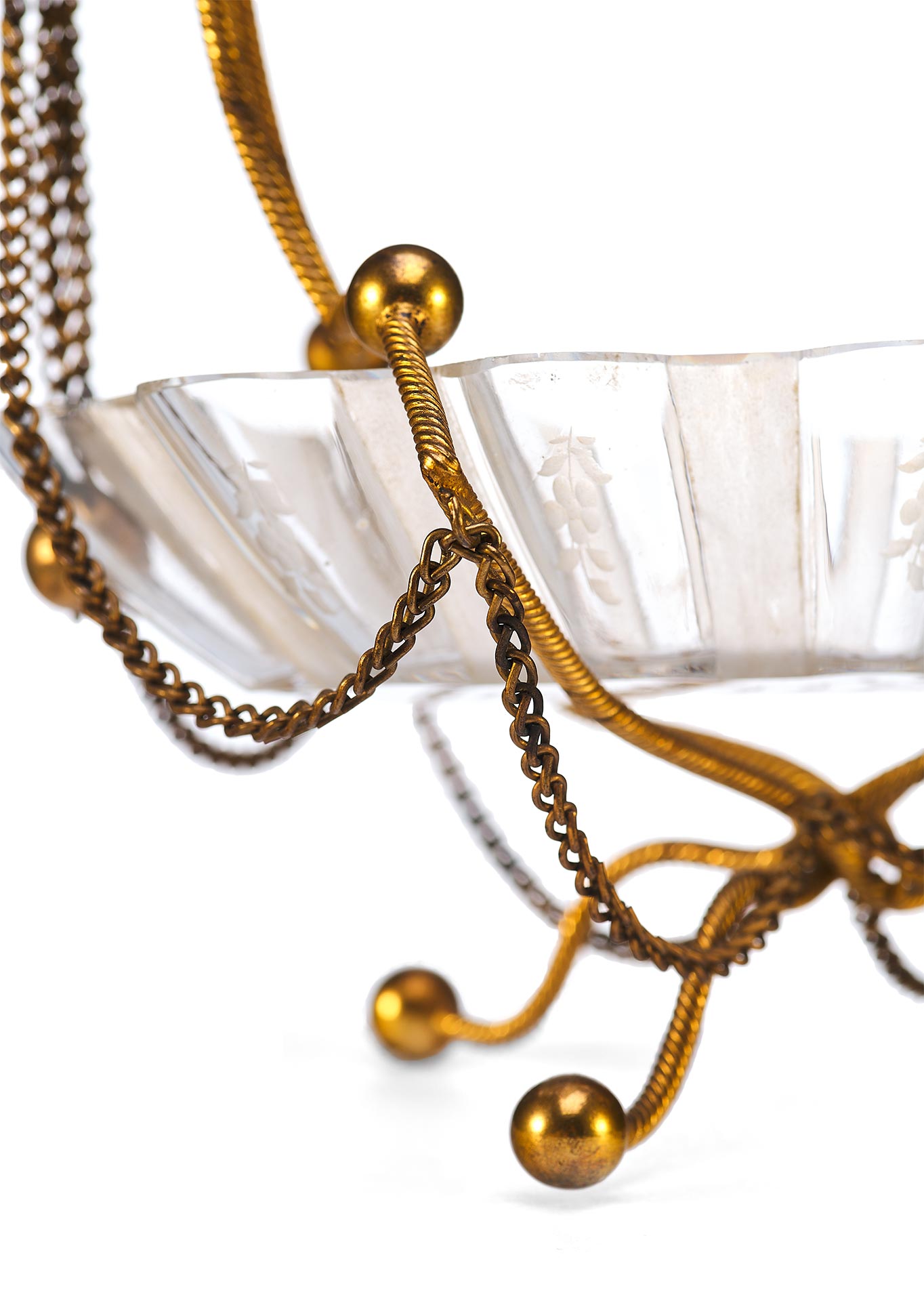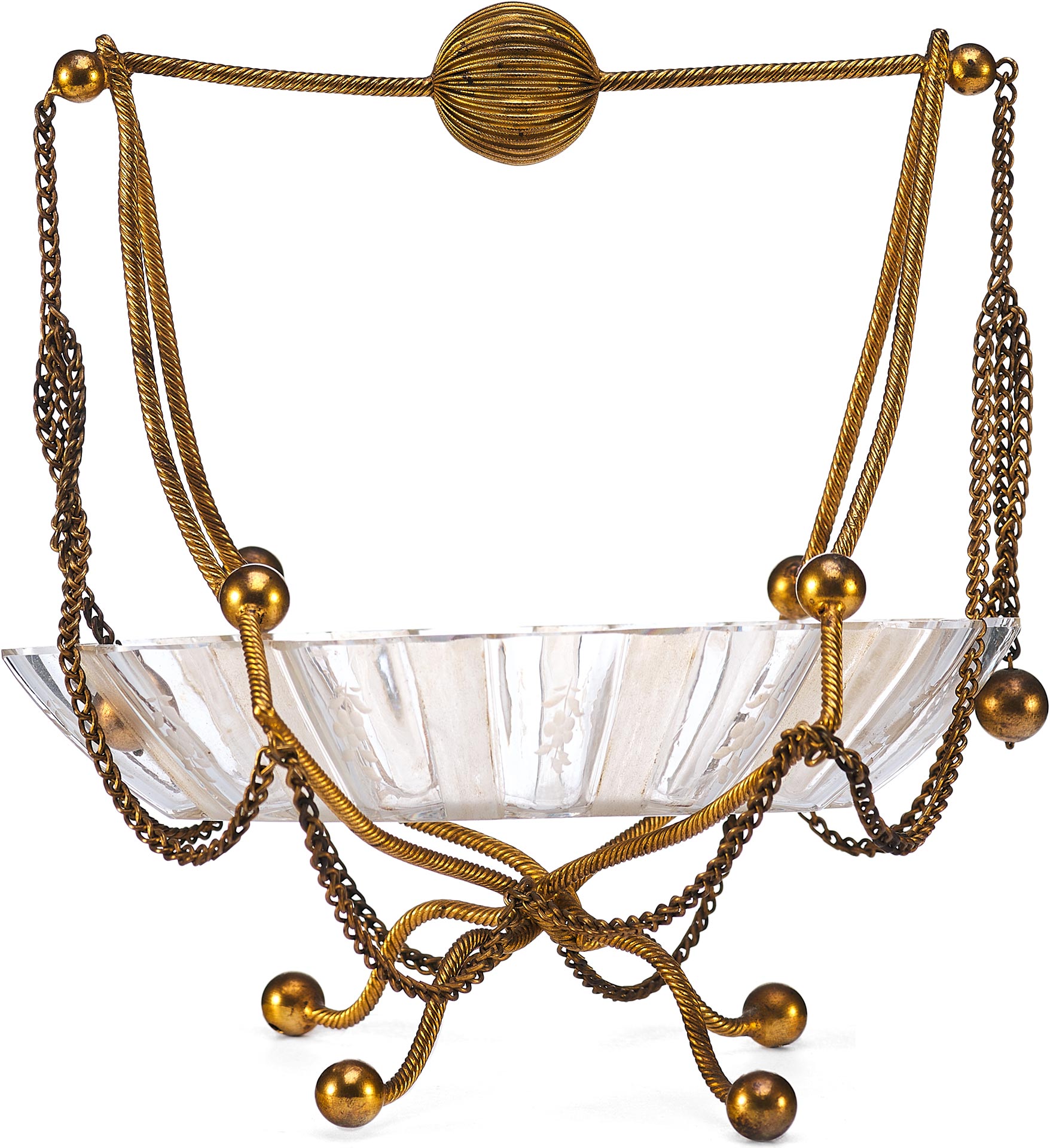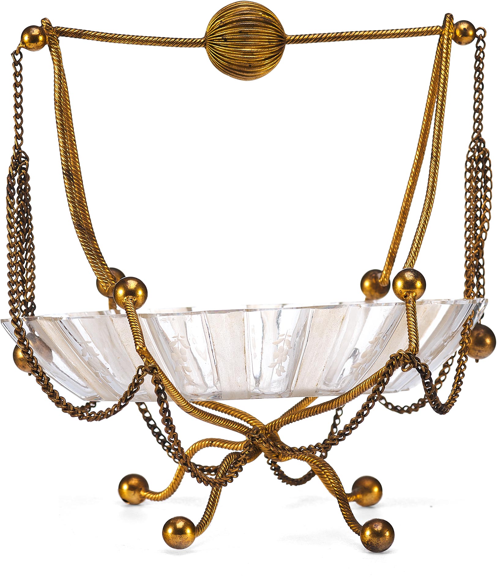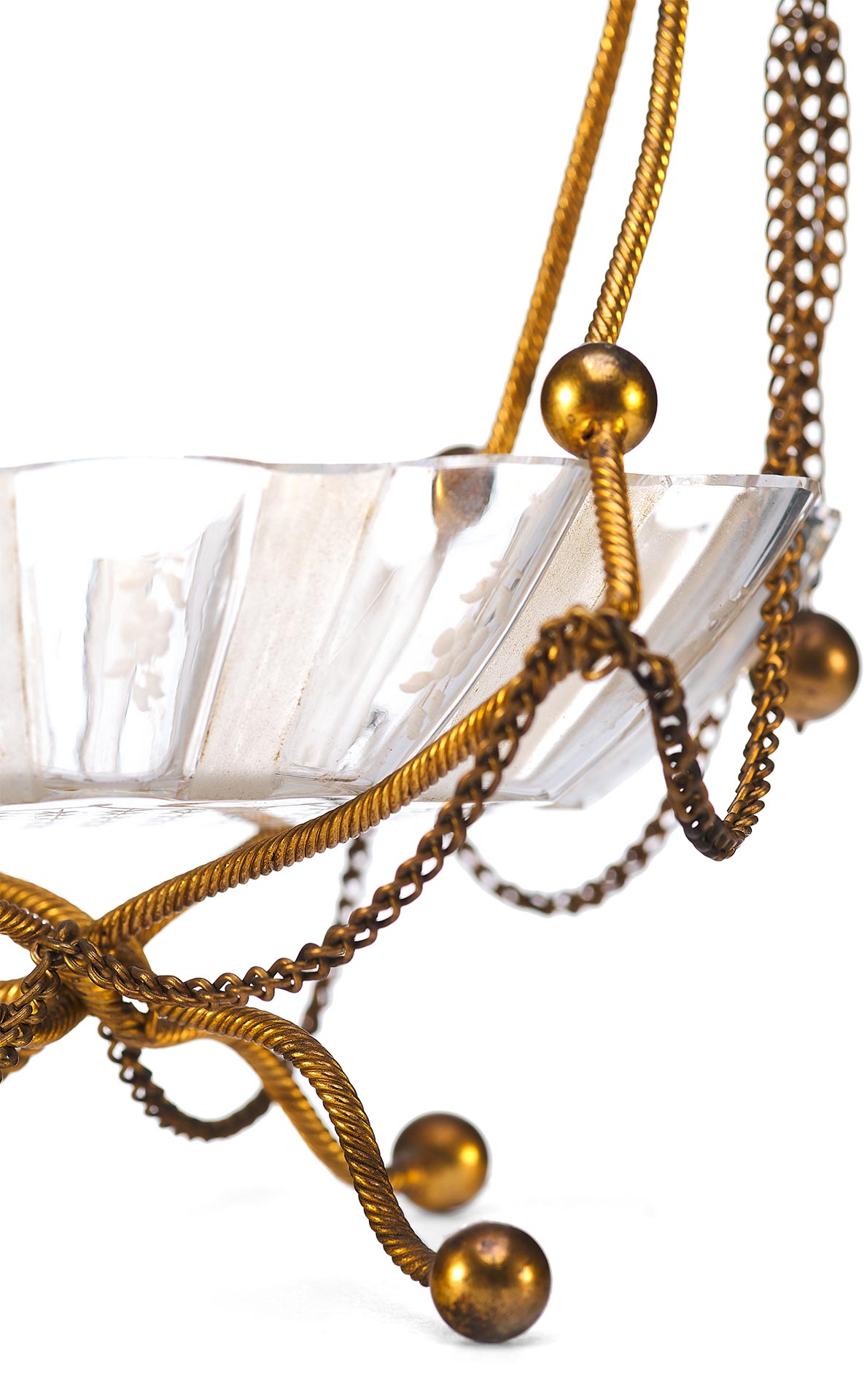 Чаша выполнена в форме распустившегося цветка с гофрированными краями и украшена изящной ручной гравировкой. Основная декоративная и функциональная часть — металлическая подставка и каркас, созданные из тонкой витой проволоки с шарообразными завершениями. Конструкция дополнена изогнутыми ножками и подвесными цепочками, придающими предмету воздушность и элегантность. Верх композиции венчает декоративная ручка с крупным фактурным шаром.