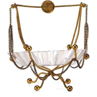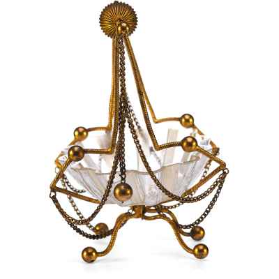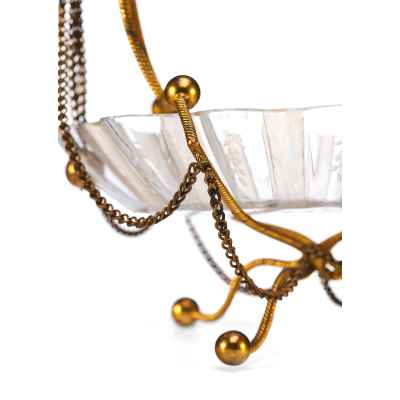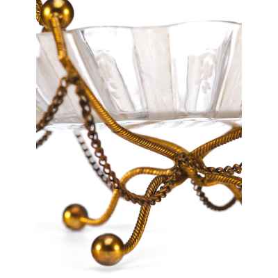 Представленная конфетница изготовлена в Европе в конце XIX века и представляет собой яркий пример декоративно-прикладного искусства, ориентированного на синтез материалов и форм. Изделие выполнено из гравированного стекла и металла, сочетая в себе эстетическую утончённость и конструктивную выразительность.