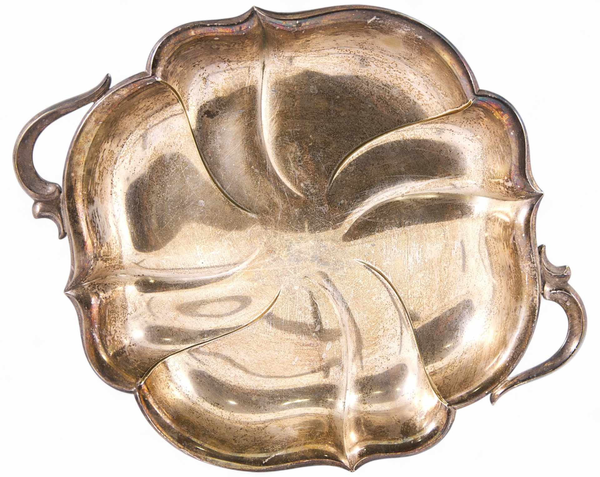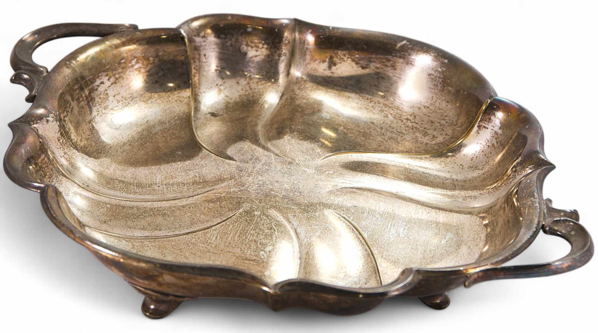 Сухарница имеет овальную форму с волнистыми краями, двумя изогнутыми ручками и изящными ножками, приподнимающими чашу над поверхностью. Внутренняя часть оформлена рельефным декором, расходящимся от центра по принципу стилизованного цветка или водной ряби. Такая композиция типична для продукции WMF, где соединялись функциональность, декоративность и технологическая утонченность.