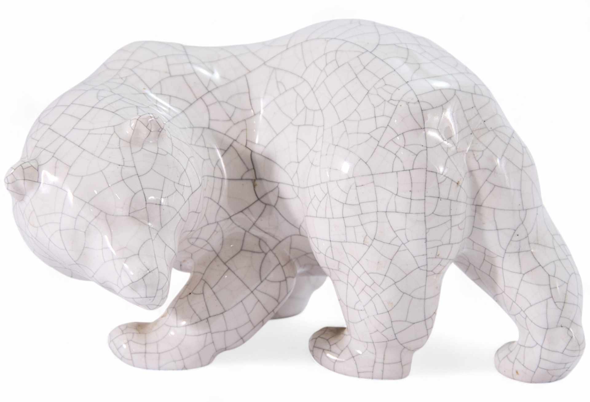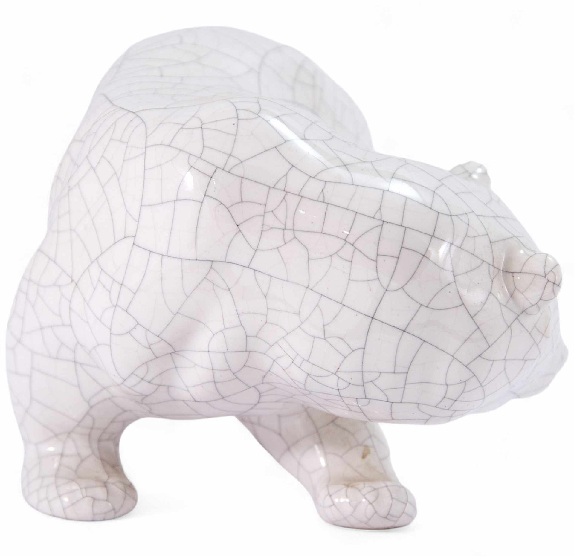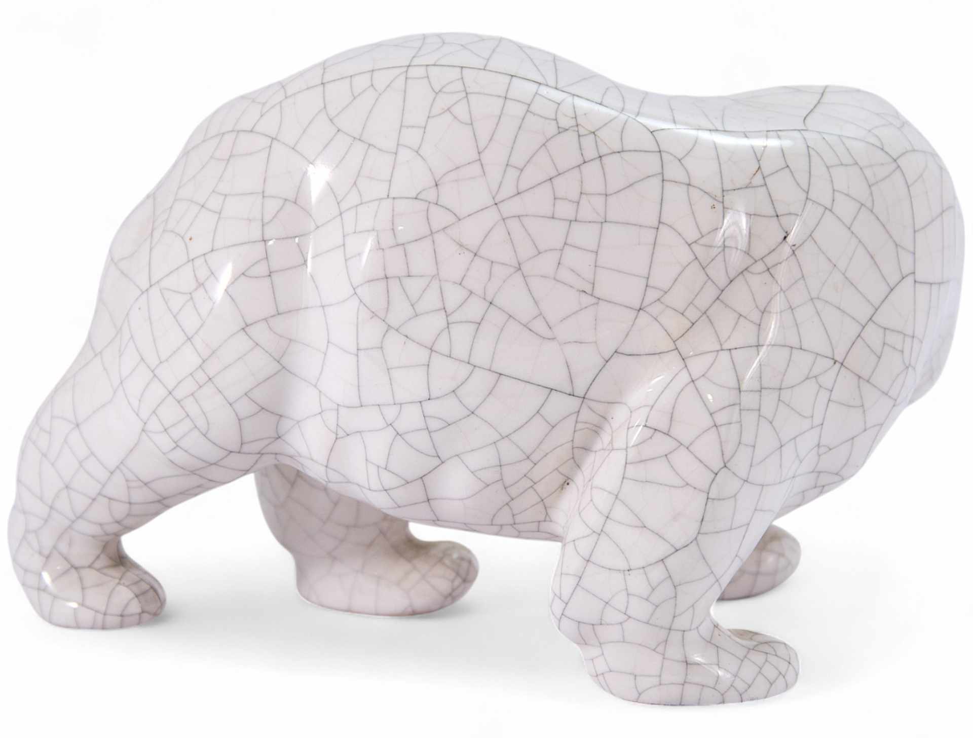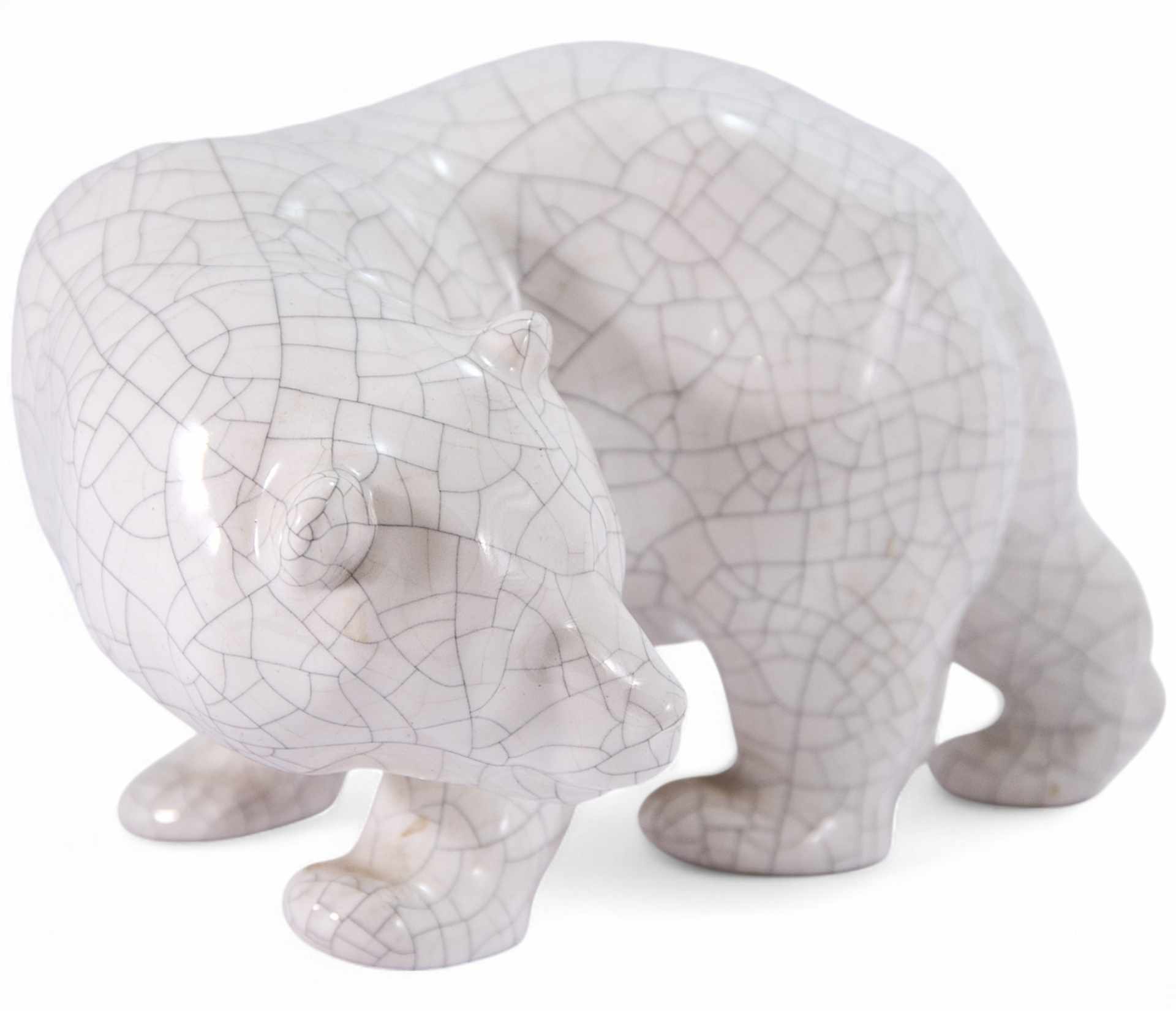Скульптура в виде идущего и оглядывающегося назад медведя. Поверхность скульптуры покрыта тонкими пересекающимися линиями, напоминающими кракелюр. Скульптуры с подобной пластикой изготавливались на венской фабрике "Keramos"