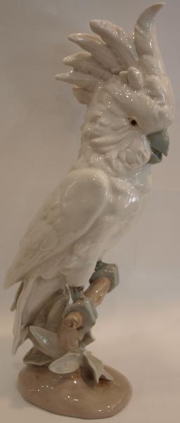 Фарфоровая скульптура, изображающая белого какаду, представляет собой выразительное произведение декоративно-прикладного искусства середины XX века. Птица выполнена в натуральной позе — сидящей на изогнутой ветви с зелёными листьями, с приподнятым хохолком, что придаёт всей композиции живость и динамику. Слегка сероватая грудка и нежно-голубой клюв подчеркивают внимательное отношение художника к натурным деталям и стремление передать природную правдоподобность образа.