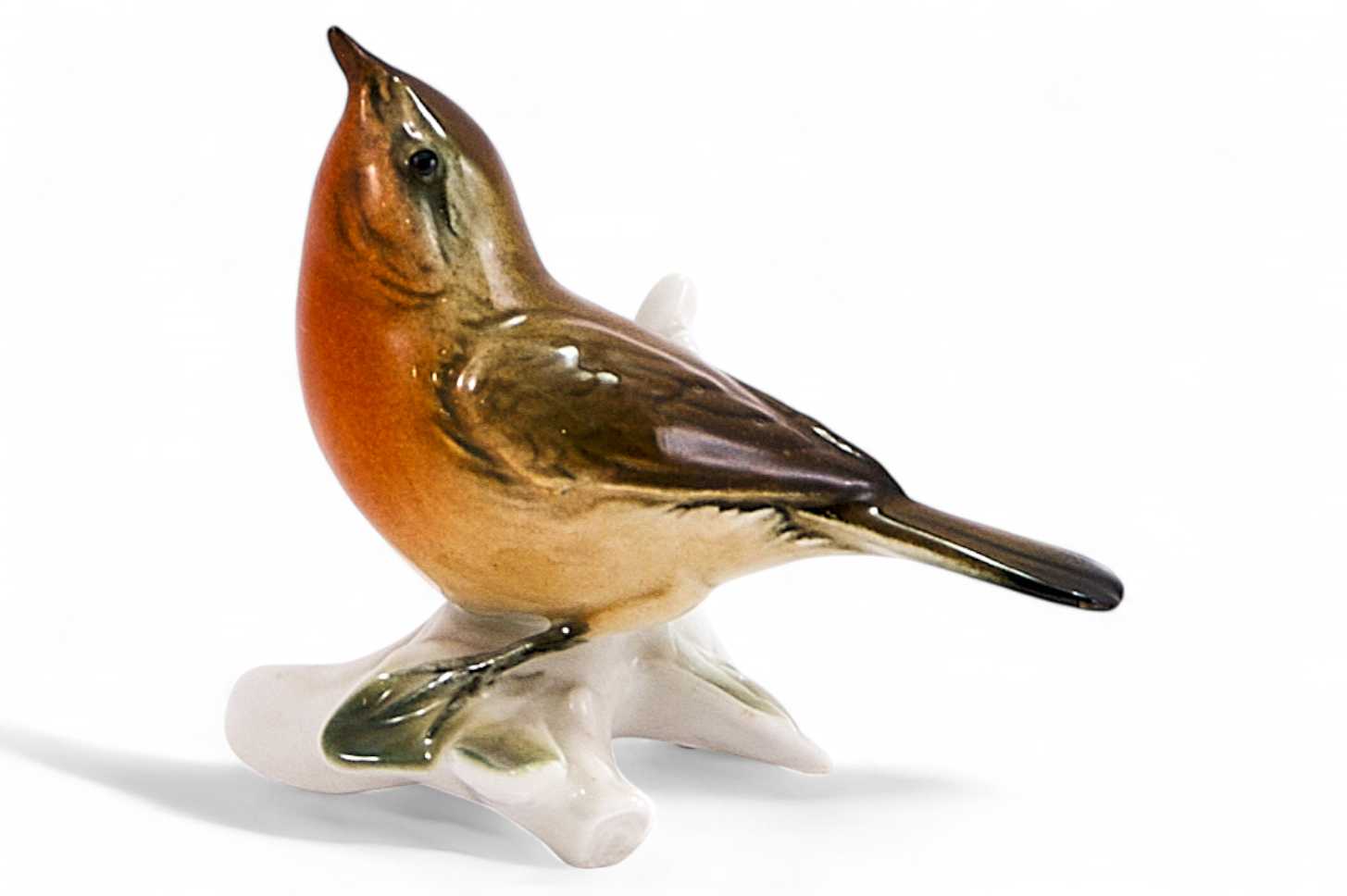 Фигура птицы изображена в динамичной позе: с приподнятой головой, расправленным телом и хвостом, вытянутым вдоль линии ветви. Она сидит на стилизованном основании, выполненном в виде светлой ветки с зелёным листом. Скульптура выполнена из фарфора с использованием техники ручной лепки, подглазурной росписи и последующего обжига, что обеспечивает плавные цветовые переходы и блеск поверхности. Теплая палитра с коричнево-рыжими, охристыми и оливковыми оттенками подчёркивает реалистичность изображения и живописность формы.