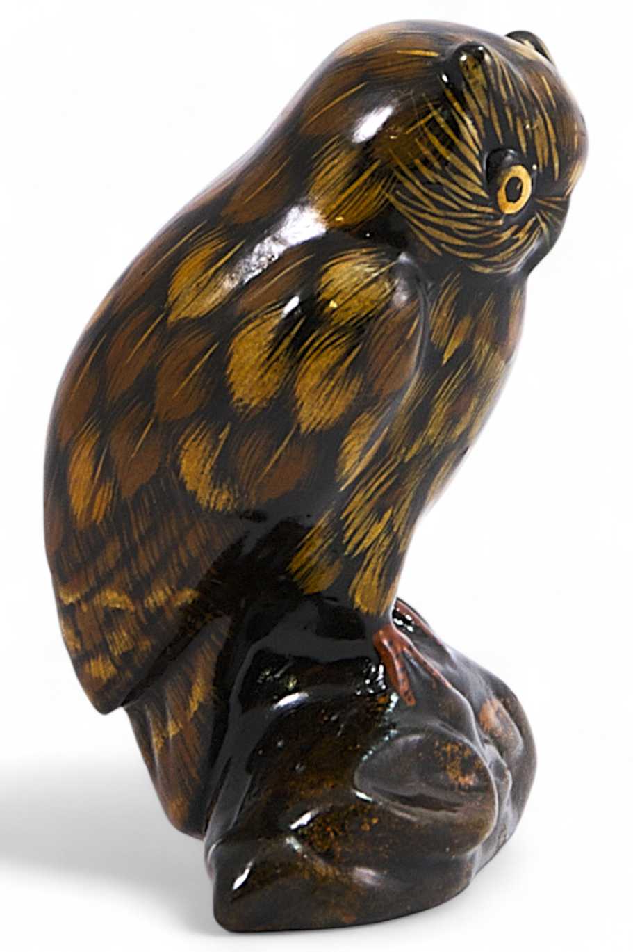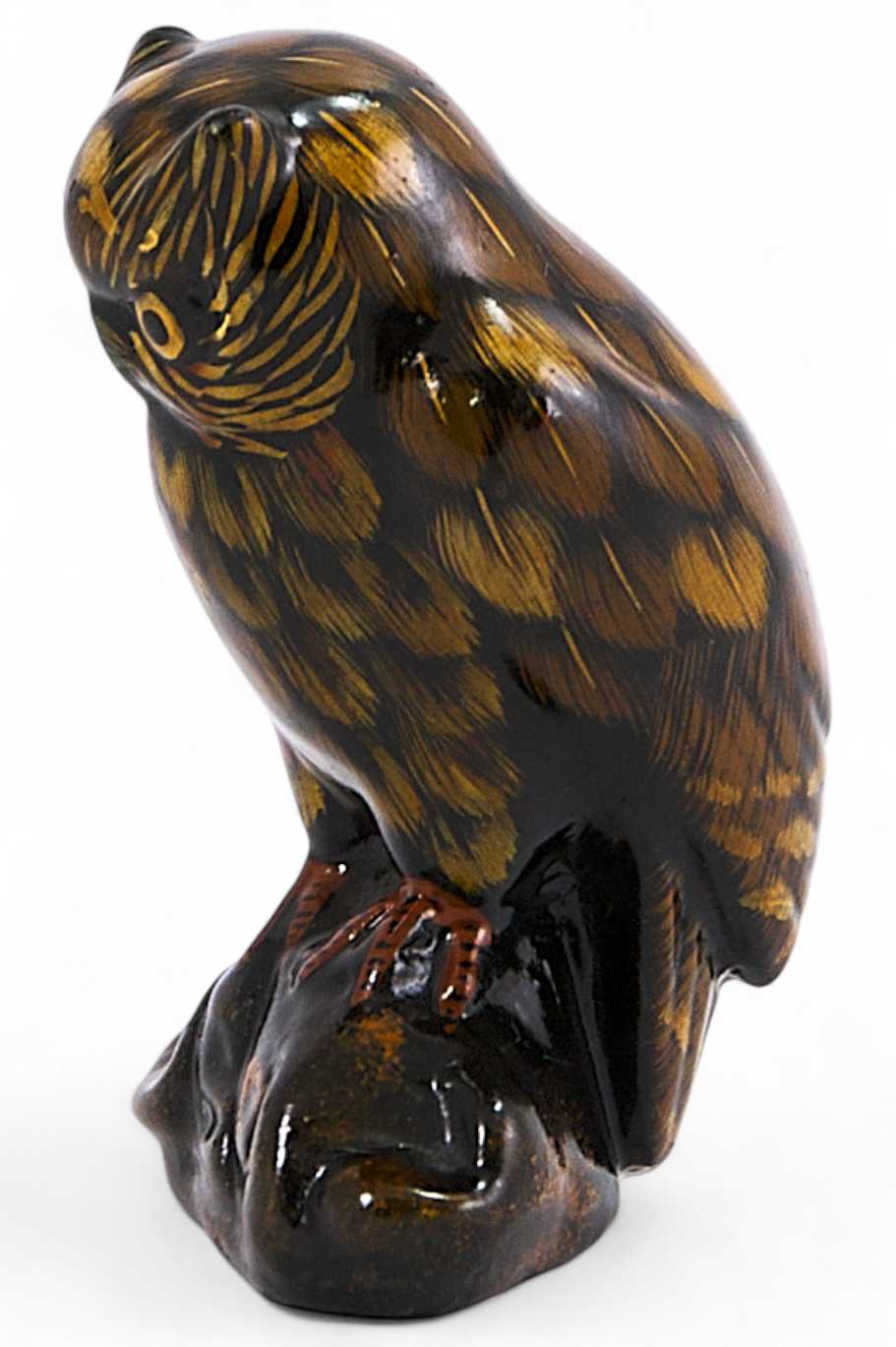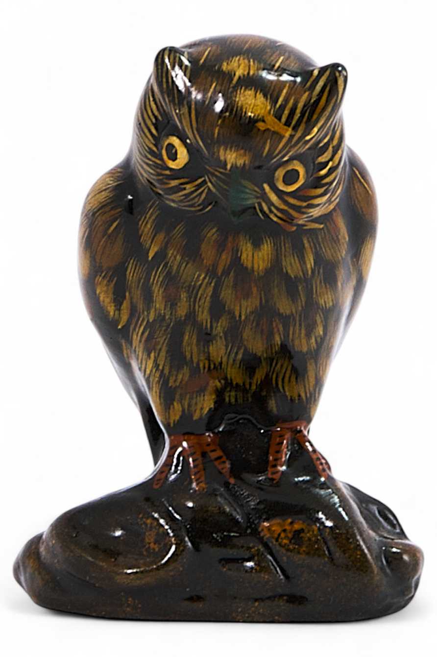 Фаянсовая скульптура «Сова», созданная во второй половине XX века в Вене, представляет собой характерный пример декоративного искусства, связанного с венской художественной традицией. Птица изображена в статичной позе, сидящей на камне, с крупной головой, подчёркнутыми глазами и детализированным оперением, оформленным в густых тёплых тонах — коричнево-жёлтых с чередованием мазков, имитирующих перья.