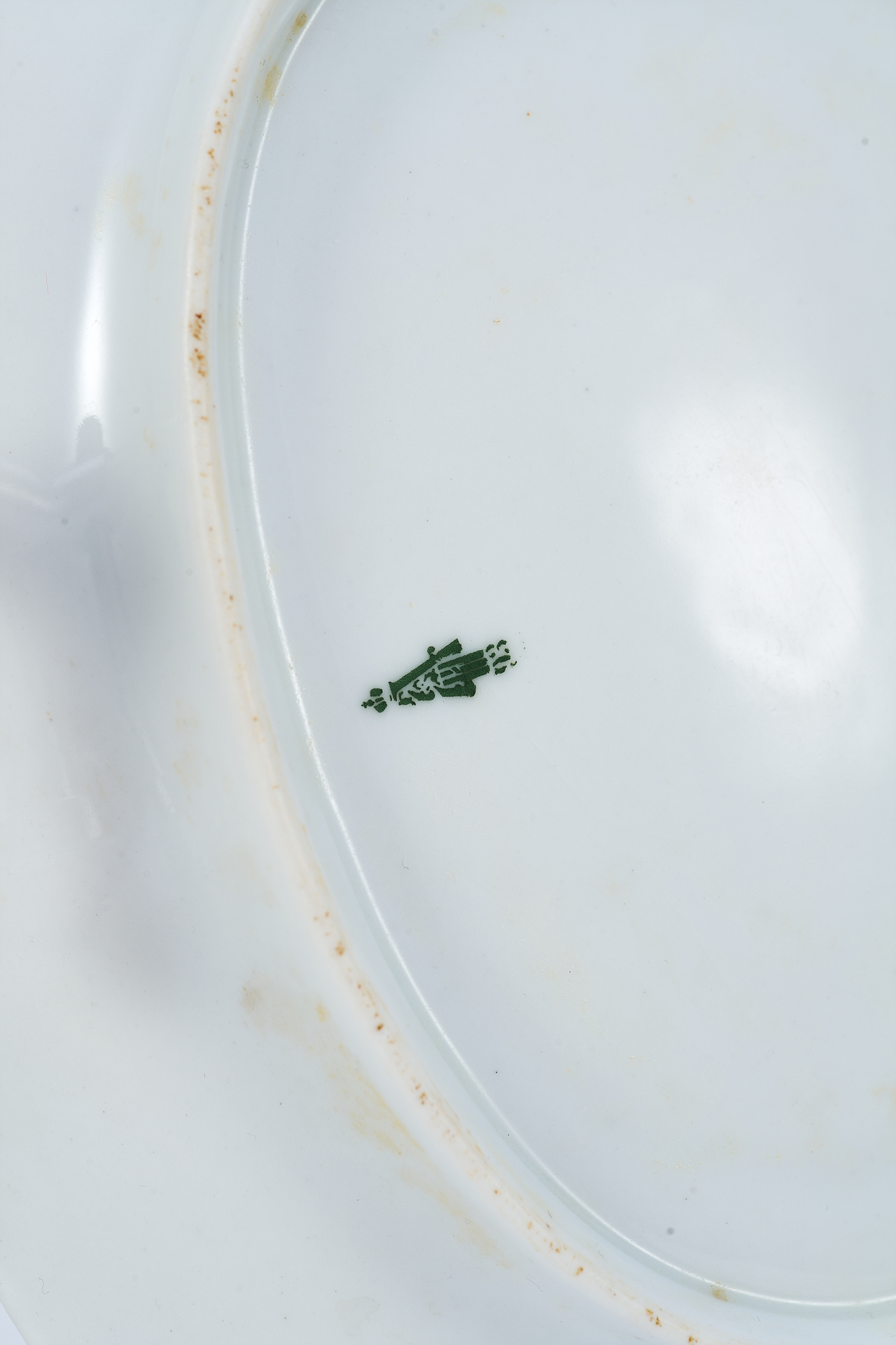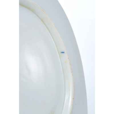 Блюдо датировано 1902 годом, что подтверждается наличием оригинального подглазурного клейма — марка Николая II, исполненная темно-зеленым хромом по трафарету. Как и принято с времён Императора Павла I, монограмма выполнена в форме гражданской литеры под императорской короной и над годом производства, что подтверждает подлинность изделия и его соответствие заявленному периоду.