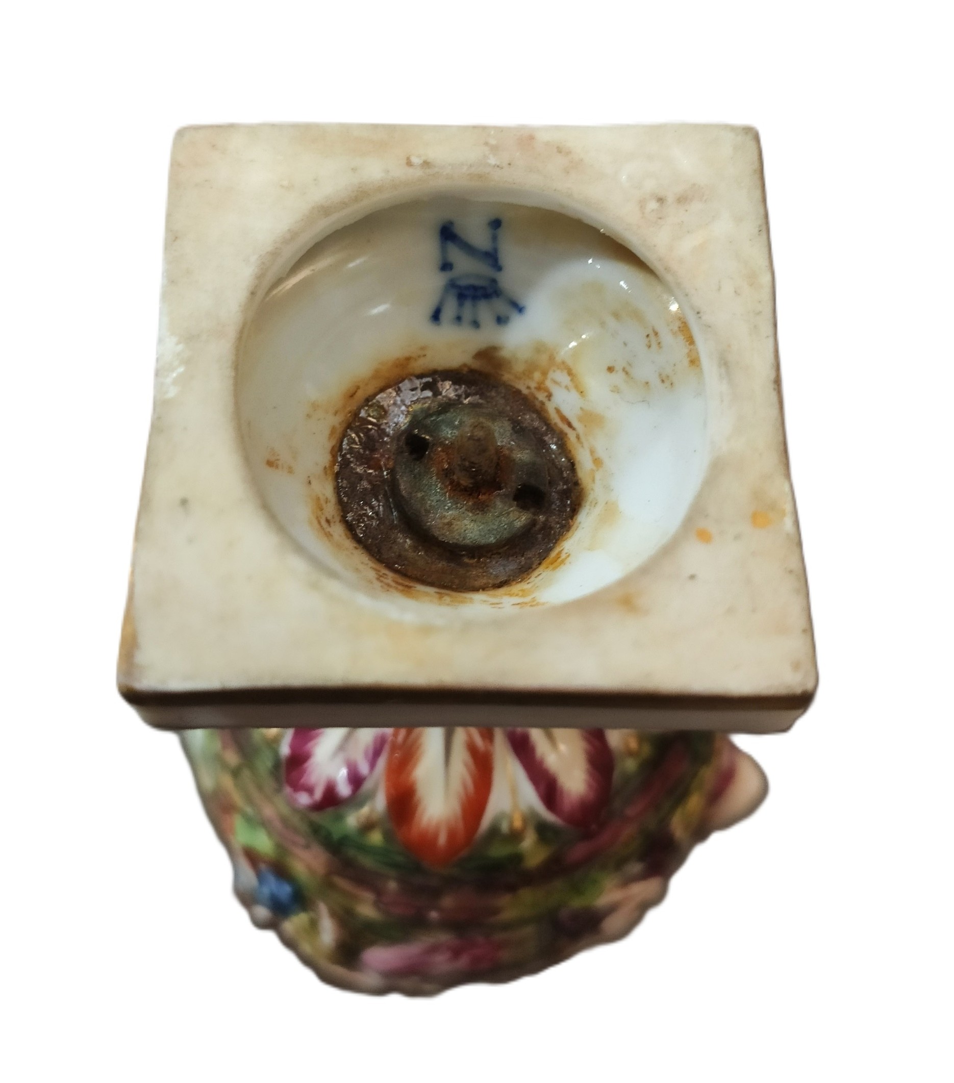 Изделие изготовлено из фарфора и богато декорировано ручной росписью, позолотой и лепным орнаментом. Высота вазы составляет 12 см. На основании нанесено клеймо, имитирующее марку фарфорового завода Каподимонте де Пальма, что указывает на принадлежность изделия к традиции, но не к исторической мануфактуре XVIII века. Подобные подражательные знаки характерны для изделий XX века, созданных в рамках сохранения стилистического наследия.
