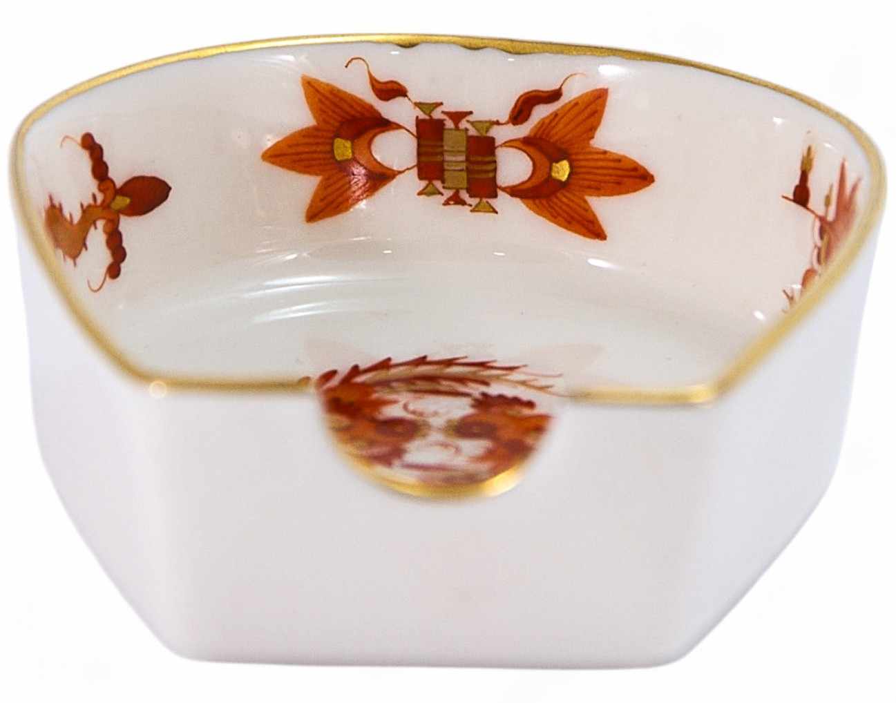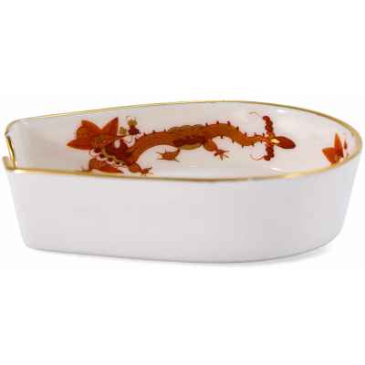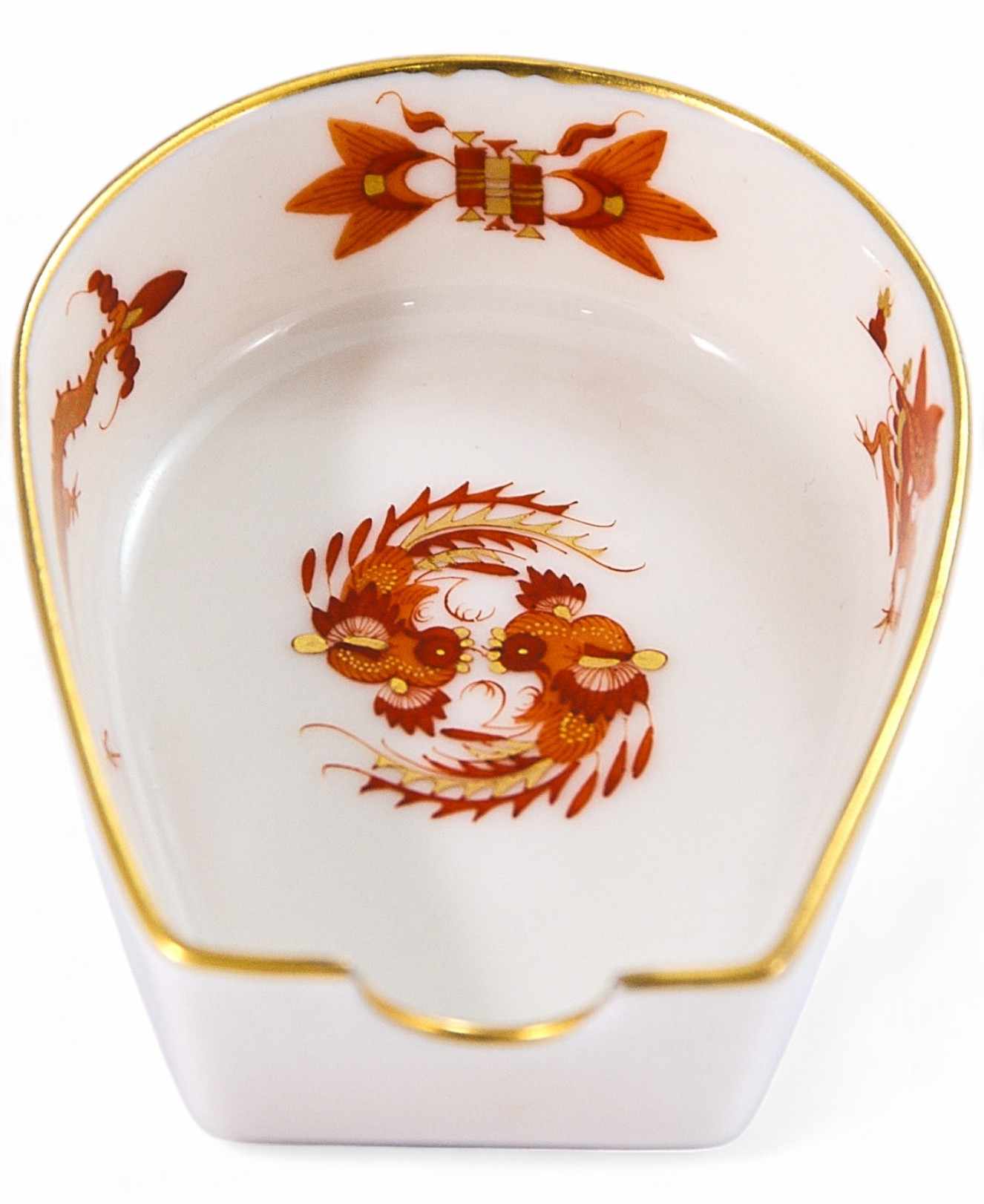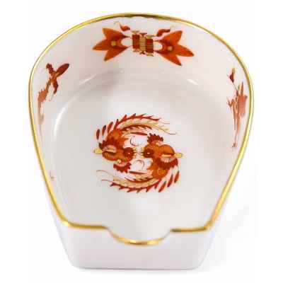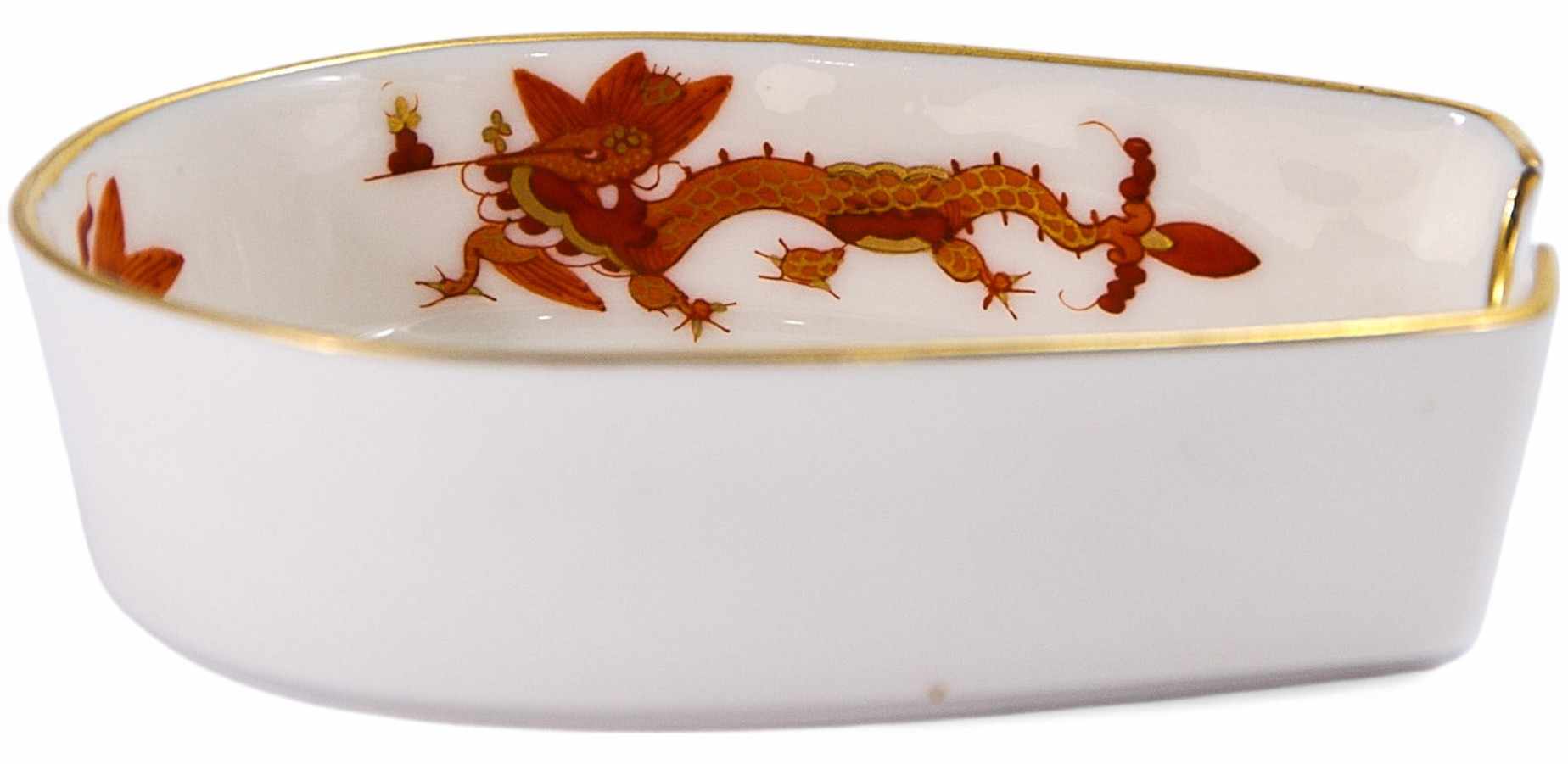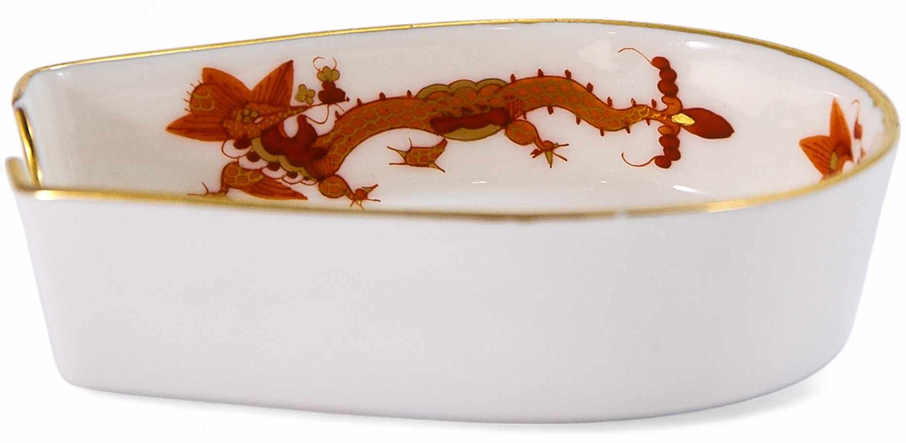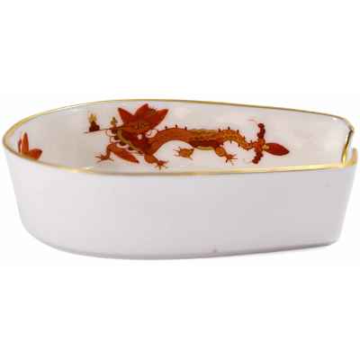 Фарфоровая розетка в стиле «Красный дракон», изготовленная в 1934–1973 годах на Мейсенской фарфоровой мануфактуре, представляет собой изысканный образец малой декоративной посуды с элементами восточного стиля. Компактная по форме, с выемкой под ложечку, она украшена богатой росписью в технике шинуазри, популярной в Европе XVIII–XX веков. Центральным мотивом выступает стилизованный дракон, окружённый орнаментальными элементами, выполненными в железно-красной палитре, что соответствует самому классическому варианту оформления сервизов Meissen данной серии.