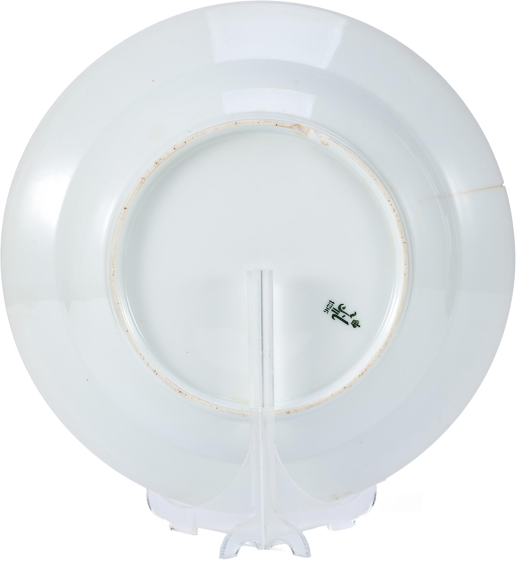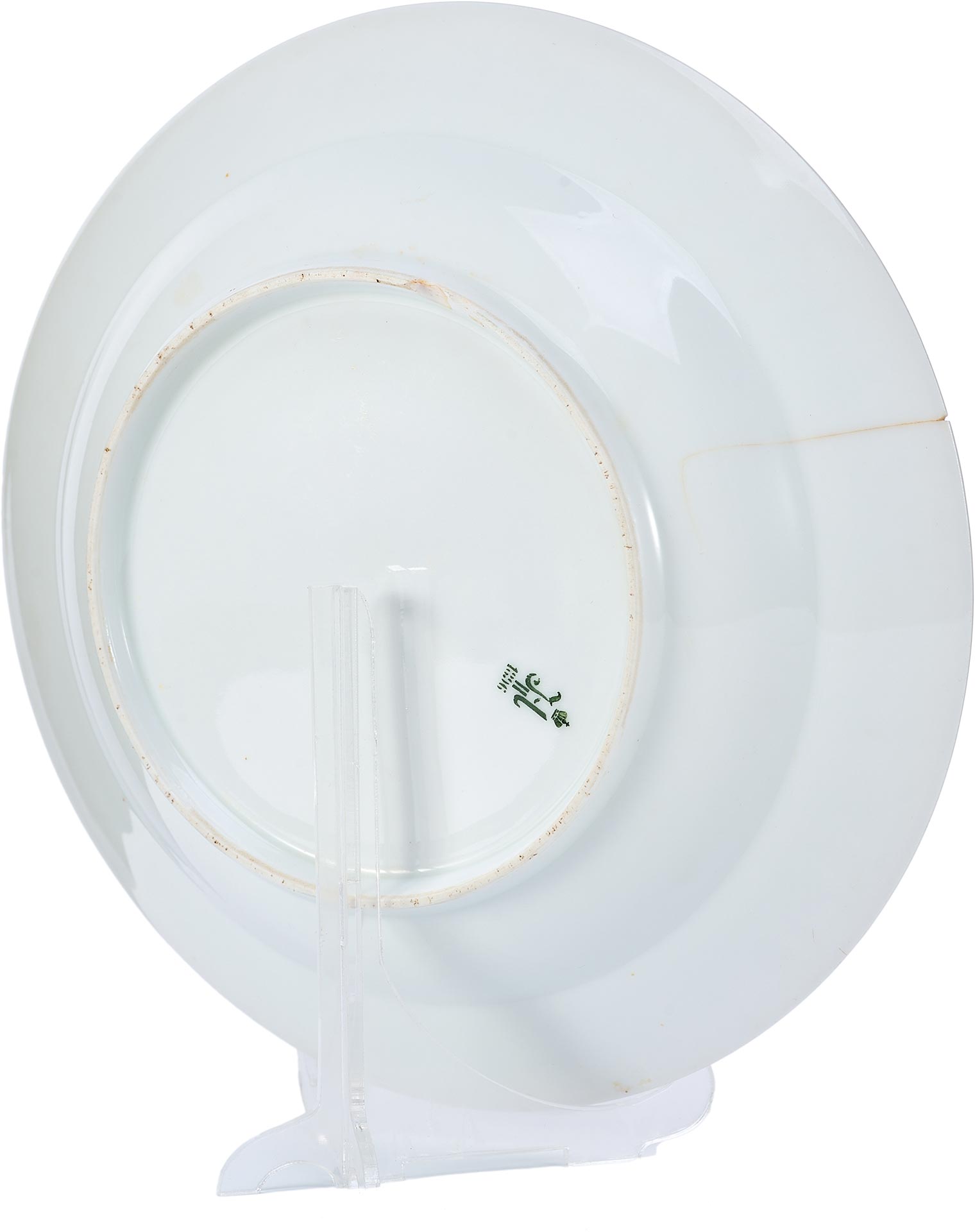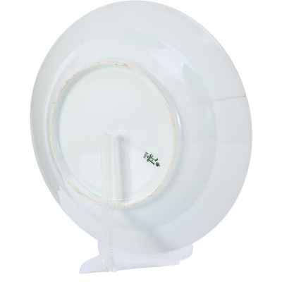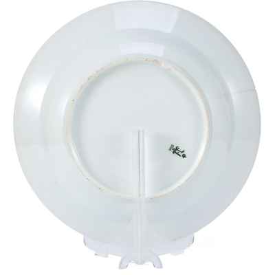 На оборотной стороне присутствует подглазурная марка Николая II, исполненная темно-зеленым хромом по трафарету. Согласно традиции, установленной еще при Императоре Павле I, литера клейма изображена под короной и над годом изготовления – 1902 г., что подтверждает подлинность предмета.