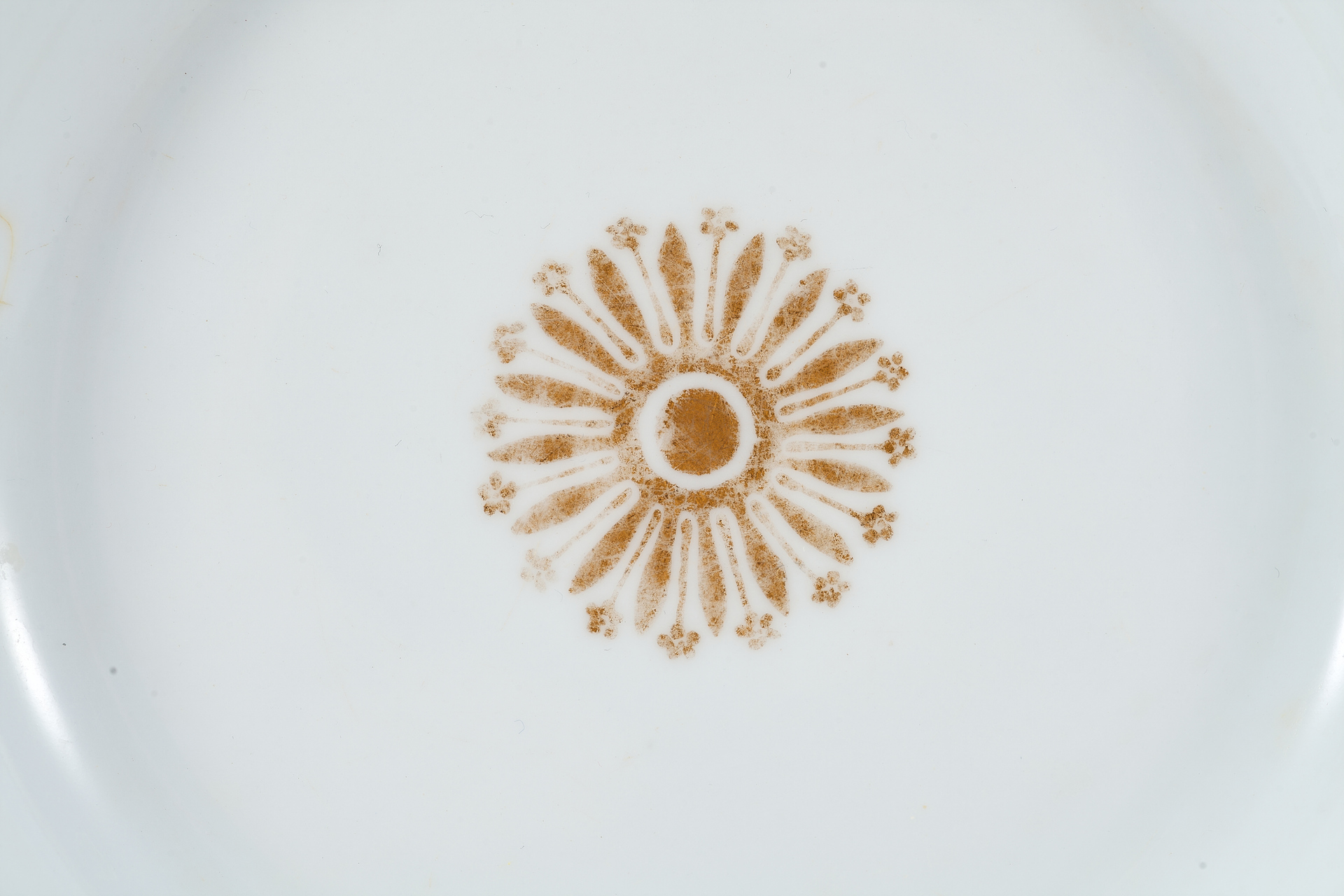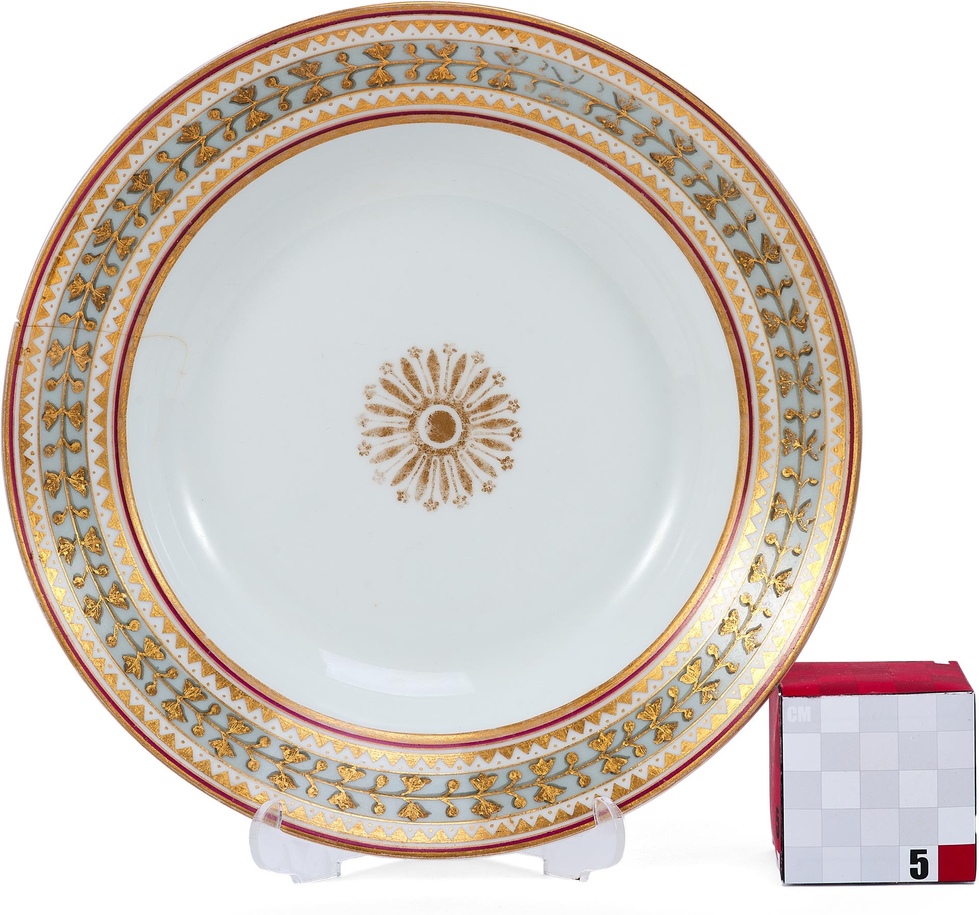 Изделие выполнено из фарфора с применением росписи и золочения. По фризу тарелка украшена стилизованным растительным орнаментом, а в центре расположен аналогичный элемент, выполненный в технике позолоты. Диаметр тарелки составляет 22,5 см.