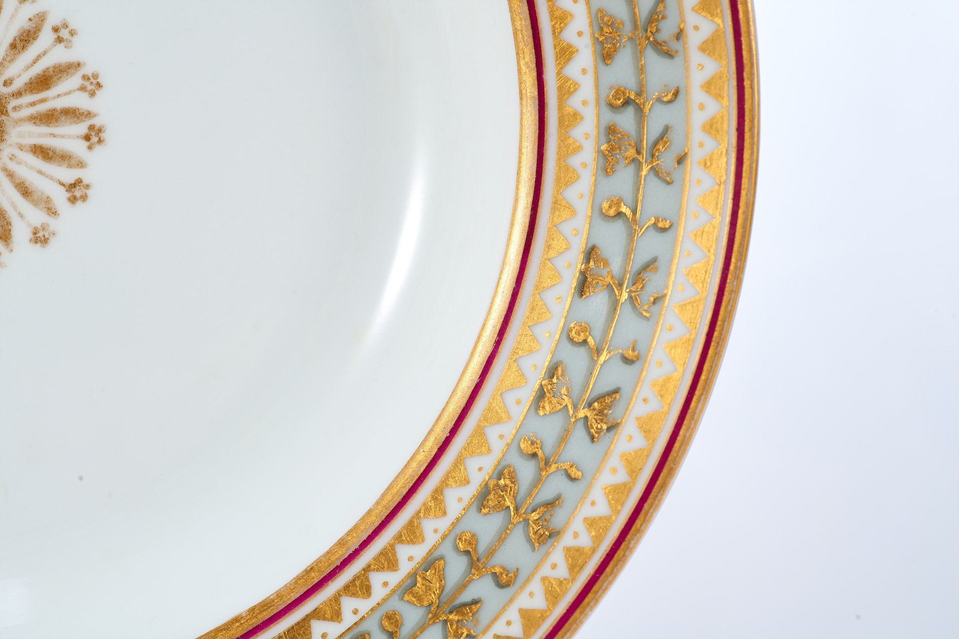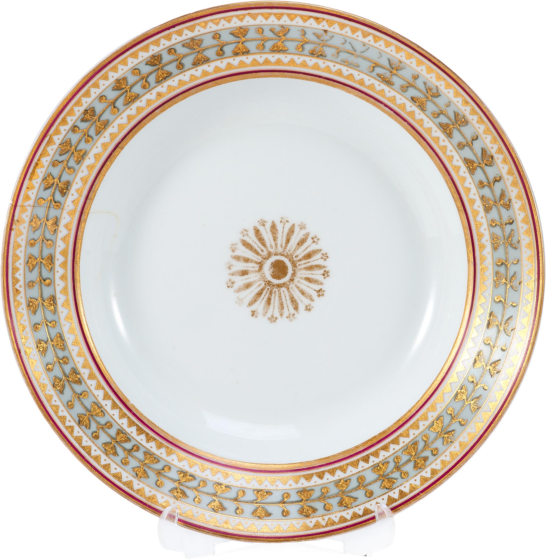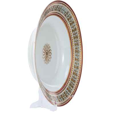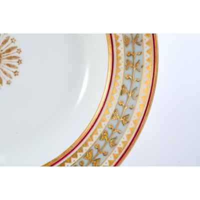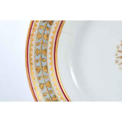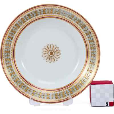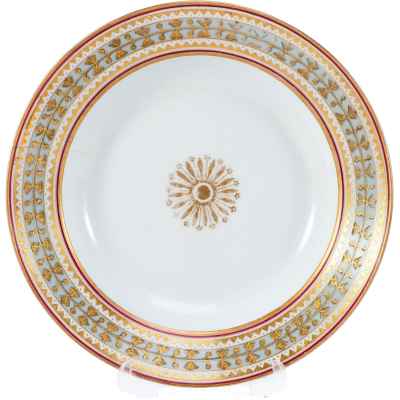 Тарелка из Дворцового сервиза времен Императора Николая II, изготовленная в 1902 году на Императорском фарфоровом заводе в Санкт-Петербурге, представляет собой редкий образец русского фарфора с изысканным декором.