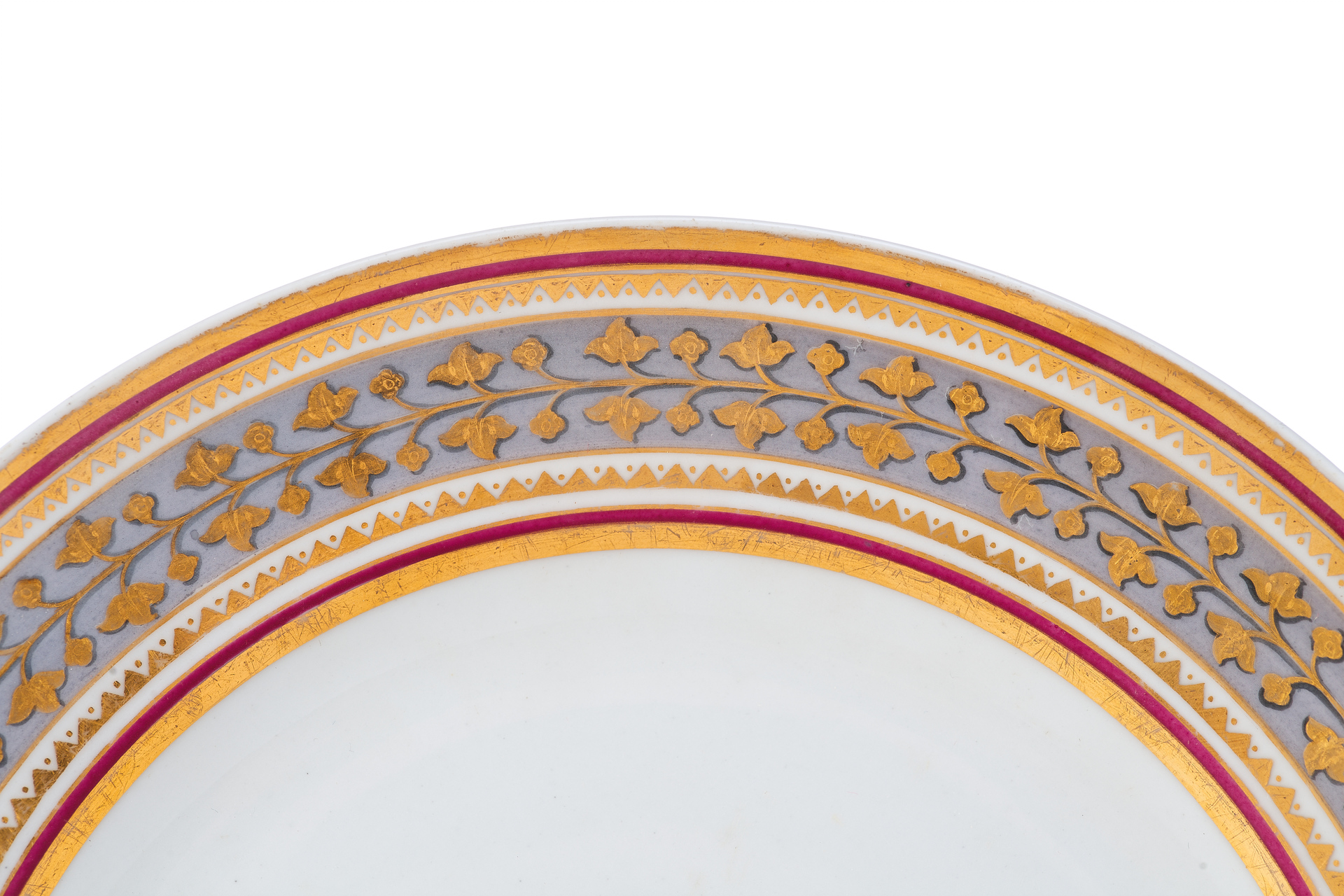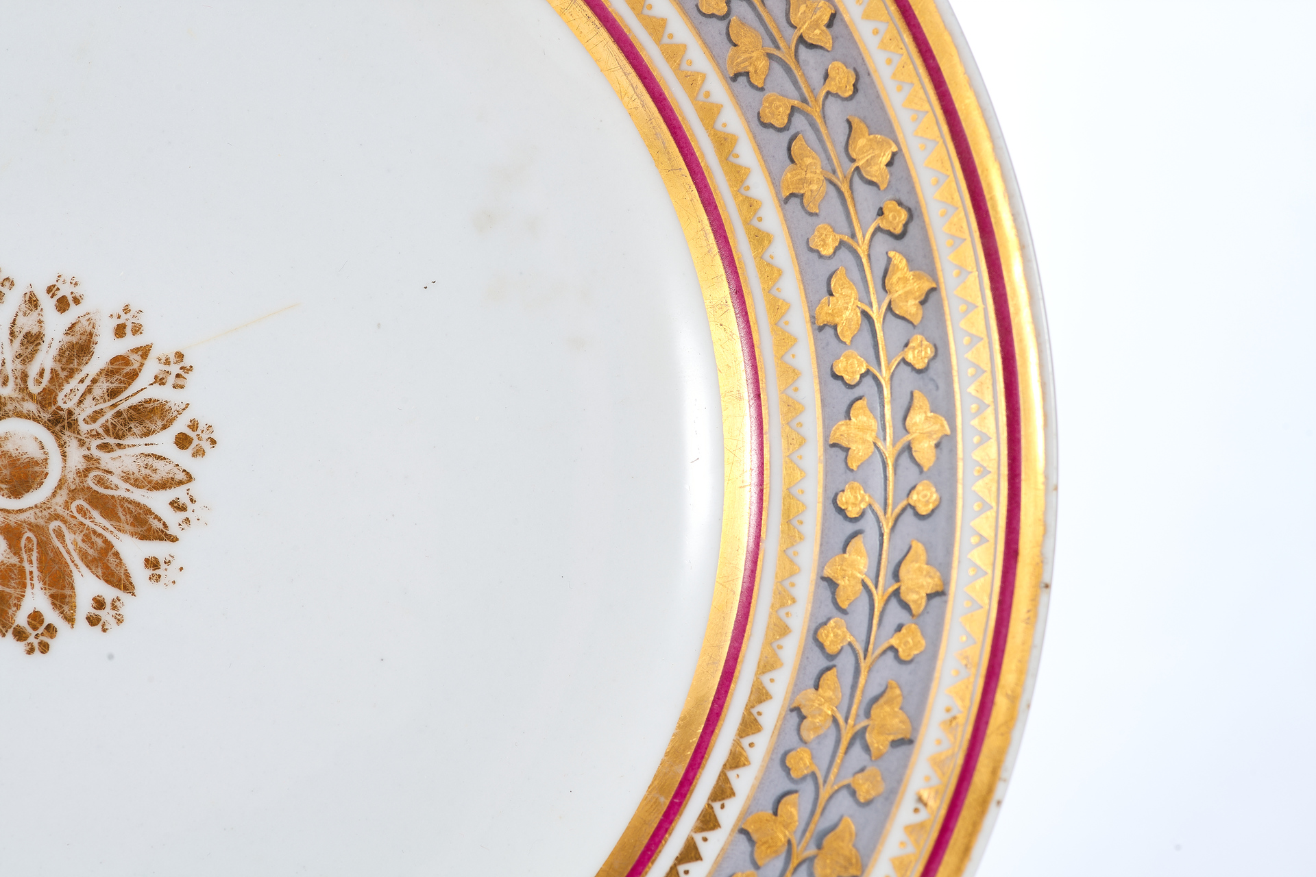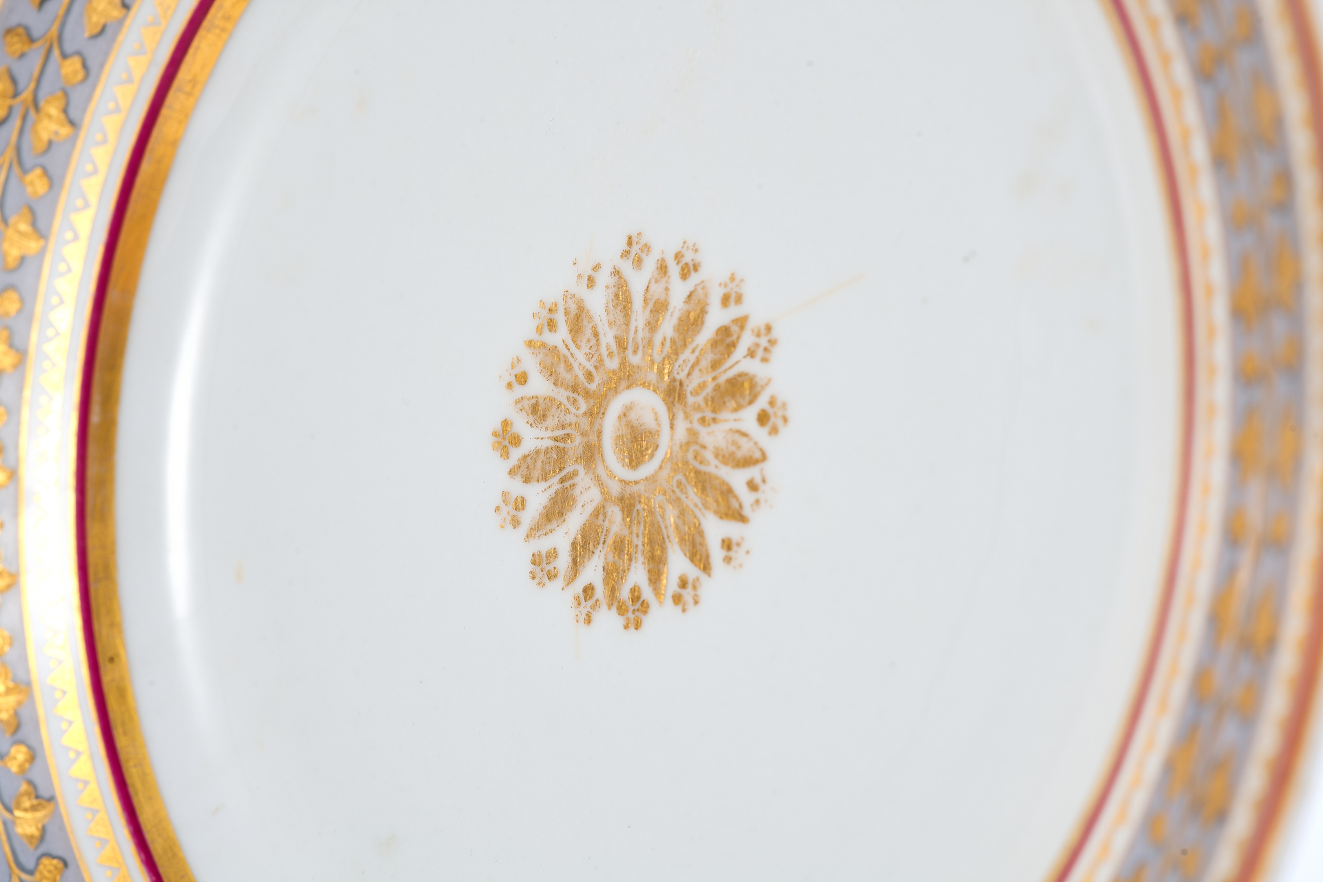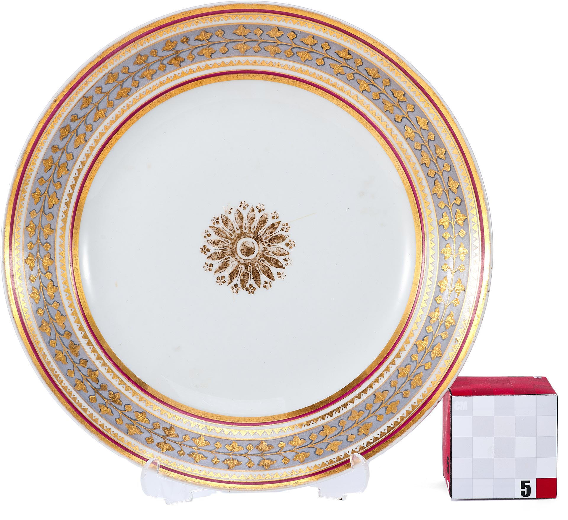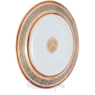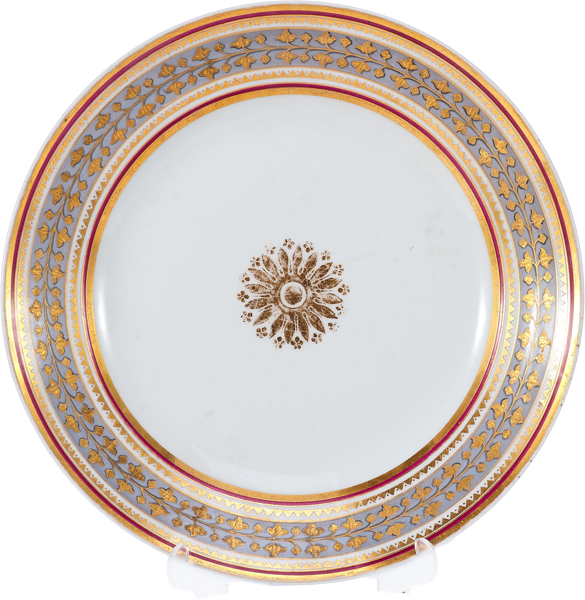 Эта тарелка входит в категорию официальной сервизной посуды, использовавшейся при торжественных и представительских приёмах. Изделия такого уровня отражают эстетические предпочтения высшего двора эпохи Николая II, где ценились строгость формы, высокое качество исполнения и утонченность орнаментального решения.
