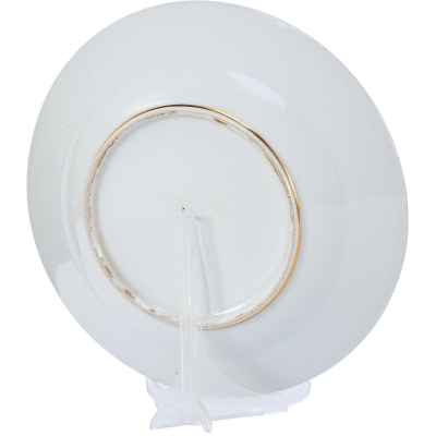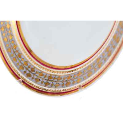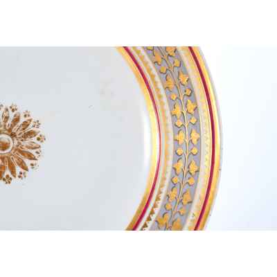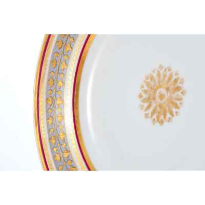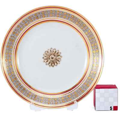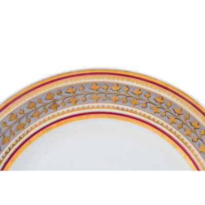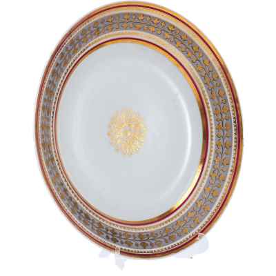 Тарелка изготовлена из высококачественного фарфора и оформлена в технике ручной росписи с применением золочения. Основной декоративный акцент приходится на фриз по краю изделия, украшенный стилизованным растительным орнаментом, выполненным с изяществом и вниманием к симметрии. Центр тарелки декорирован аналогичным элементом, что придаёт всей композиции завершённость и гармоничность.
