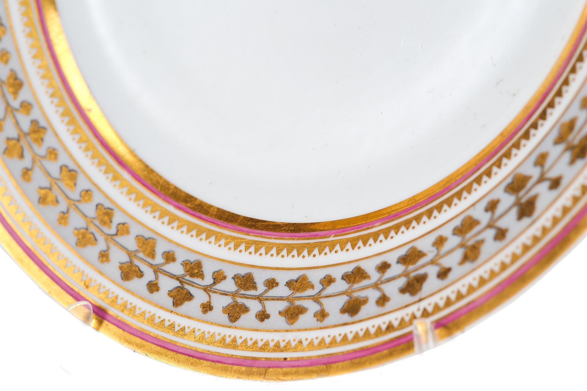Изделие выполнено из фарфора с применением росписи и золочения. Диаметр тарелки составляет 23,2 см. Фриз тарелки украшен стилизованным растительным орнаментом, выполненным в технике позолоты, а аналогичный элемент размещен в центре композиции.