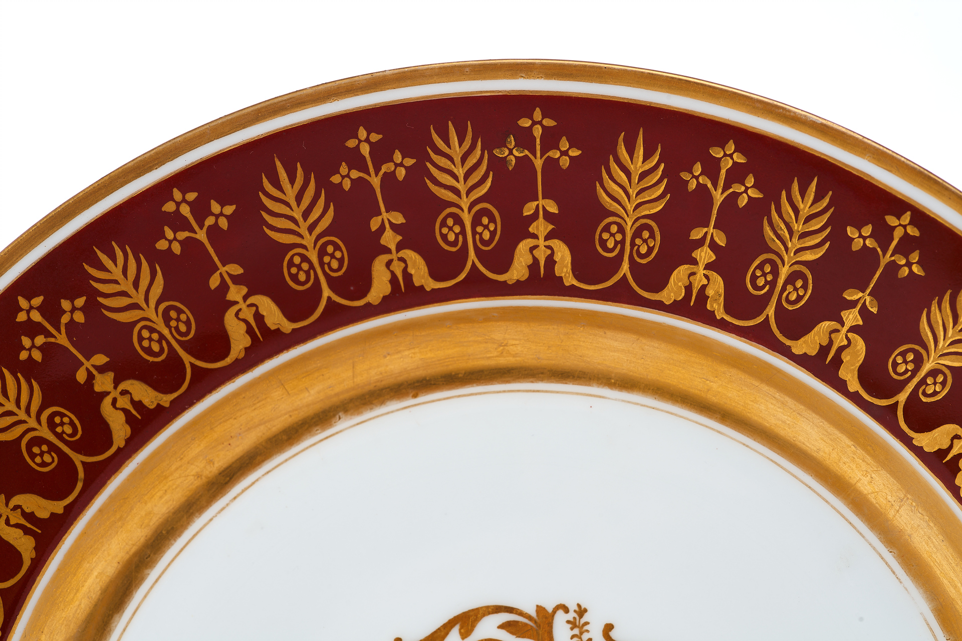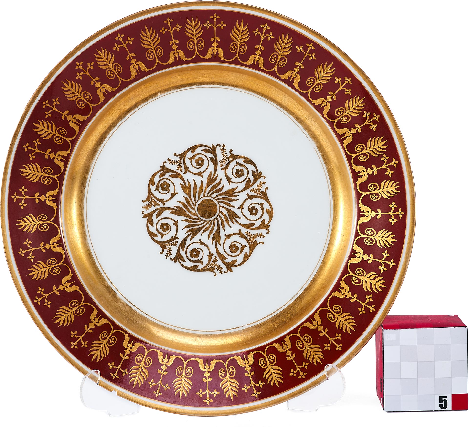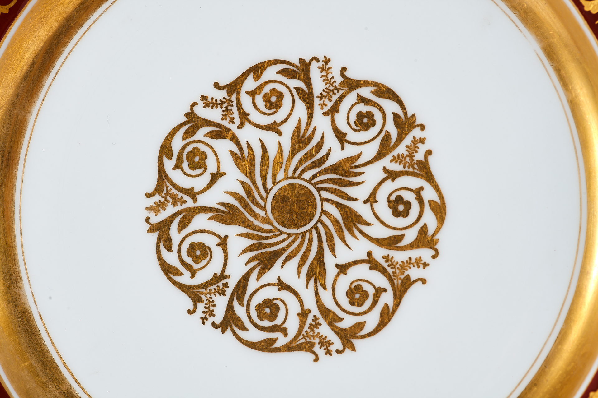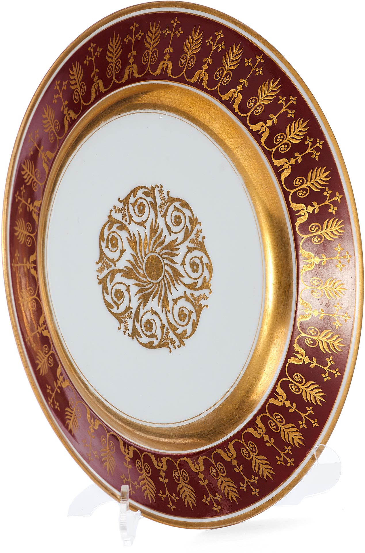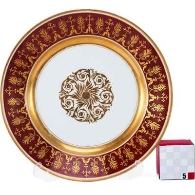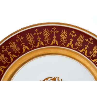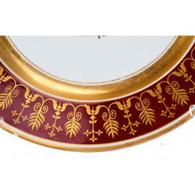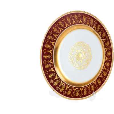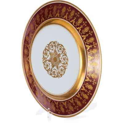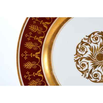 Тарелка изготовлена из фарфора и украшена сложным растительным орнаментом, нанесенным золочением поверх темно-красной росписи. Фриз тарелки покрыт богатым узором, включающим стилизованные листья, завитки и цветочные мотивы, которые перекликаются с центральным медальоном, выполненным в виде солнечного орнамента с витиеватыми элементами.