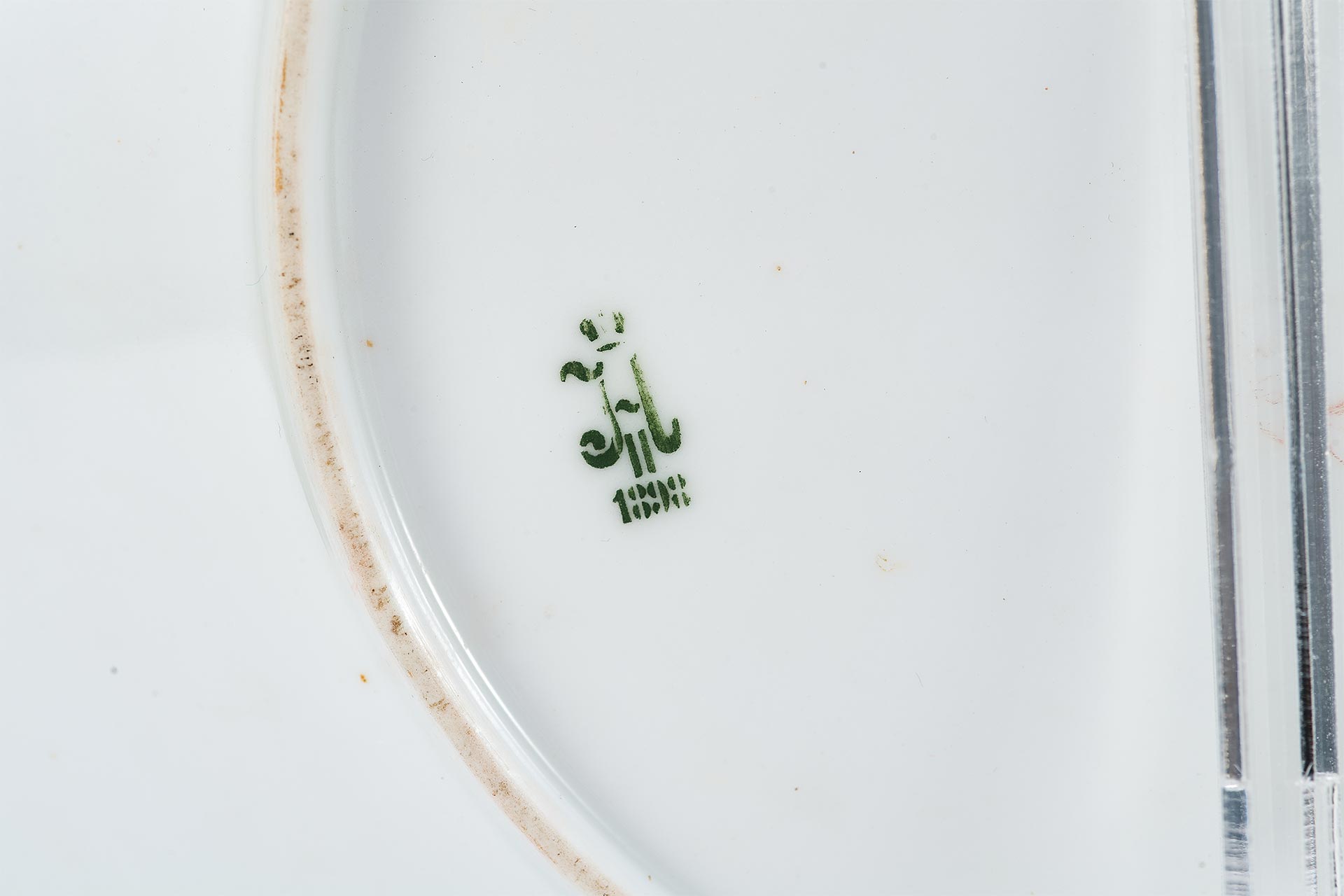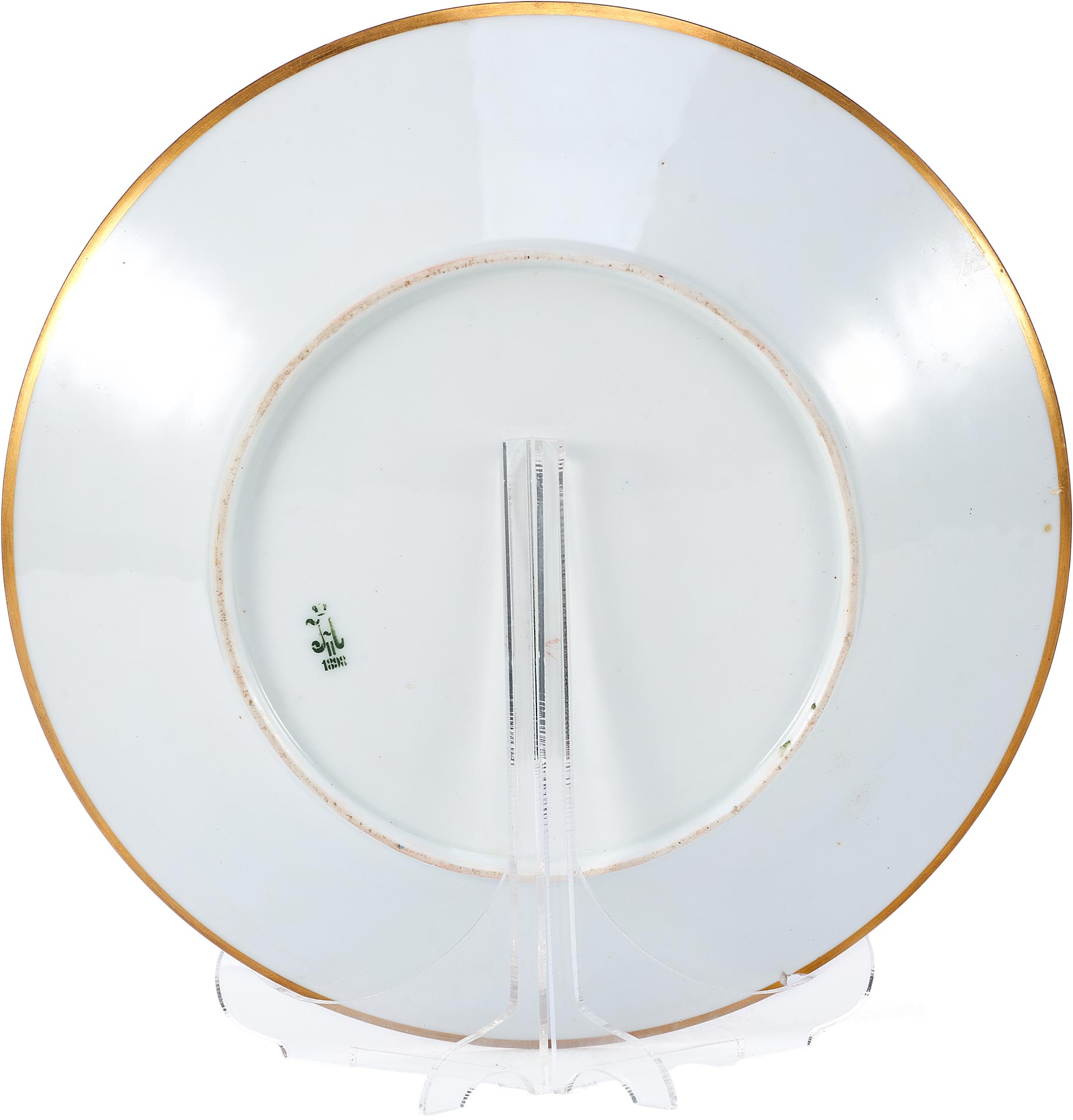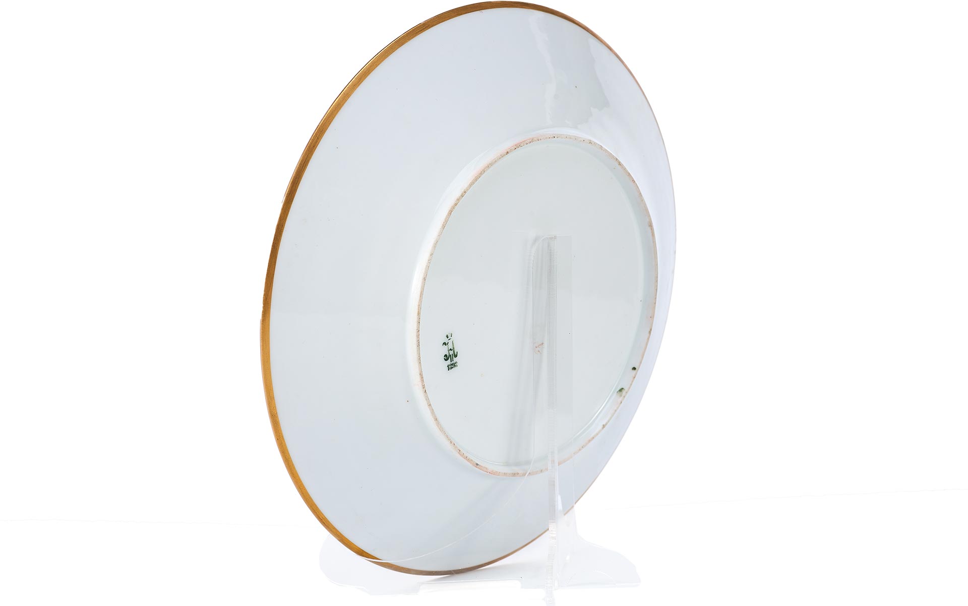 На оборотной стороне изделия нанесено подглазурное клеймо Николая II, исполненное хромом темно-зеленого цвета по трафарету. Шрифт использован из гражданской азбуки, традиционно применявшейся на марках Императорского фарфора с времён Павла I. Датировка клейма указывает на 1898 год, что подтверждает подлинность предмета.