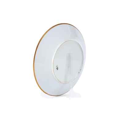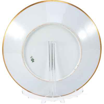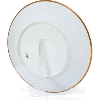 Тарелка, представленная на изображении, является частью Дворцового сервиза времен Императора Николая II, созданного на Императорском фарфоровом заводе в 1898 году. Этот изысканный образец отражает традиции русского придворного фарфора конца XIX века, сочетая в себе роскошь, строгость и безупречное качество исполнения.