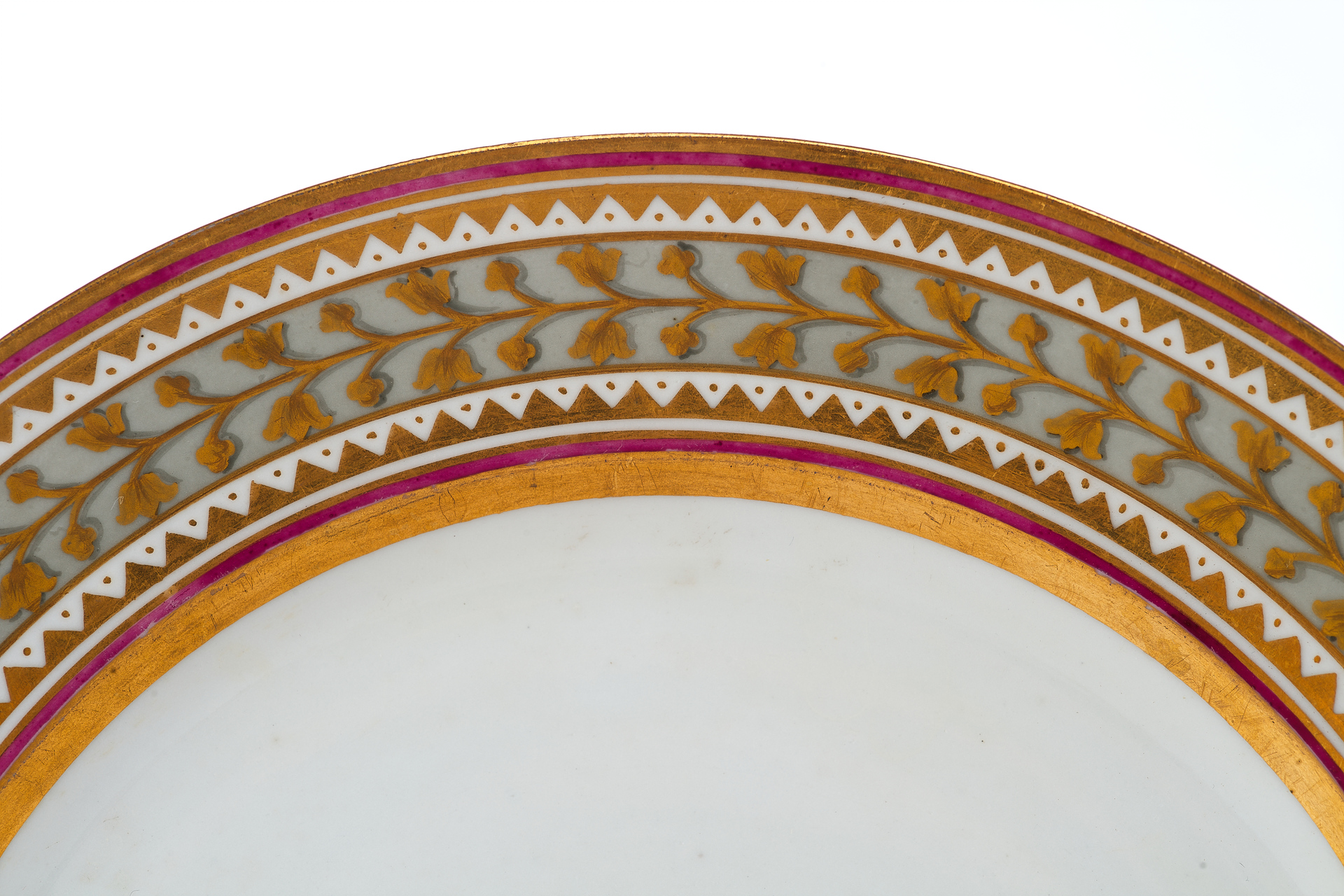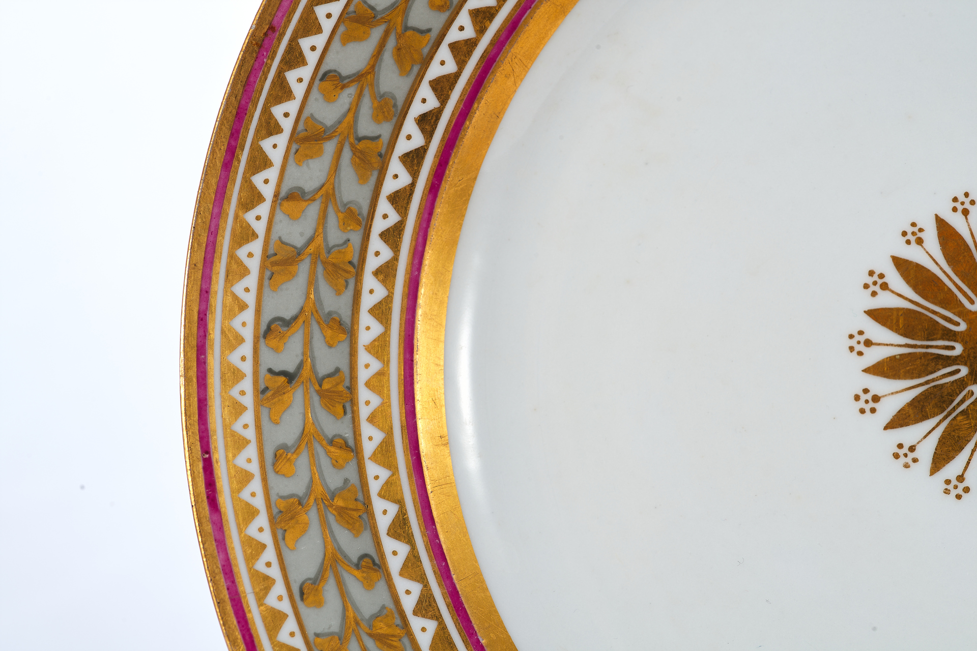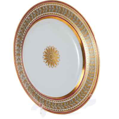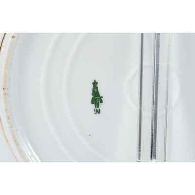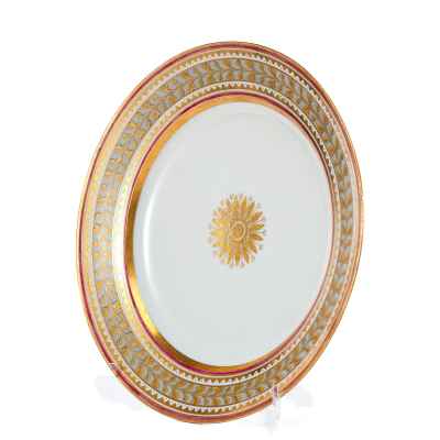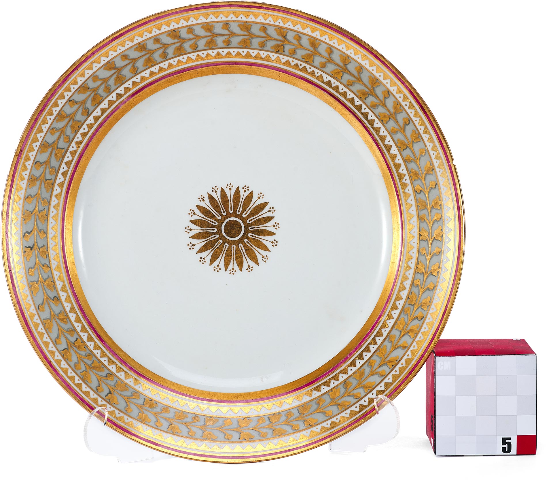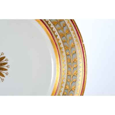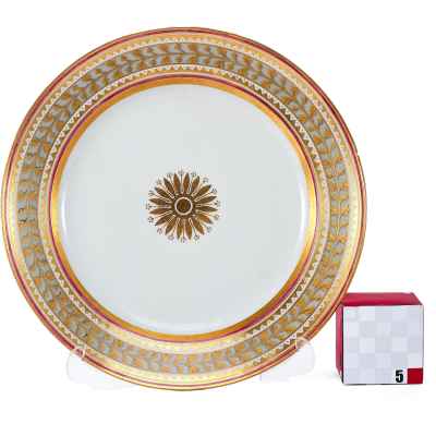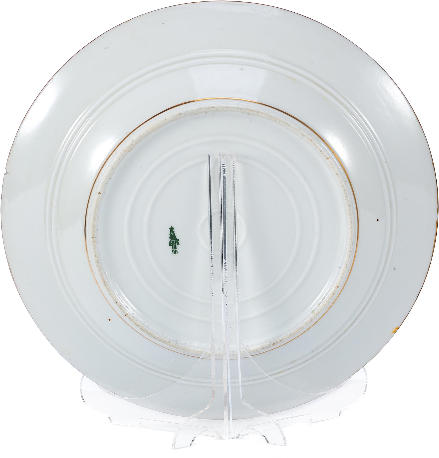 Фарфоровая тарелка, представленная на изображении, относится к Дворцовому сервизу времен правления Императора Николая II и была изготовлена на Императорском фарфоровом заводе в 1902 году в Санкт-Петербурге. Подобные предметы создавались специально для использования при дворе и официальных торжественных приемах, отличаясь высоким качеством исполнения и изысканным художественным оформлением.
