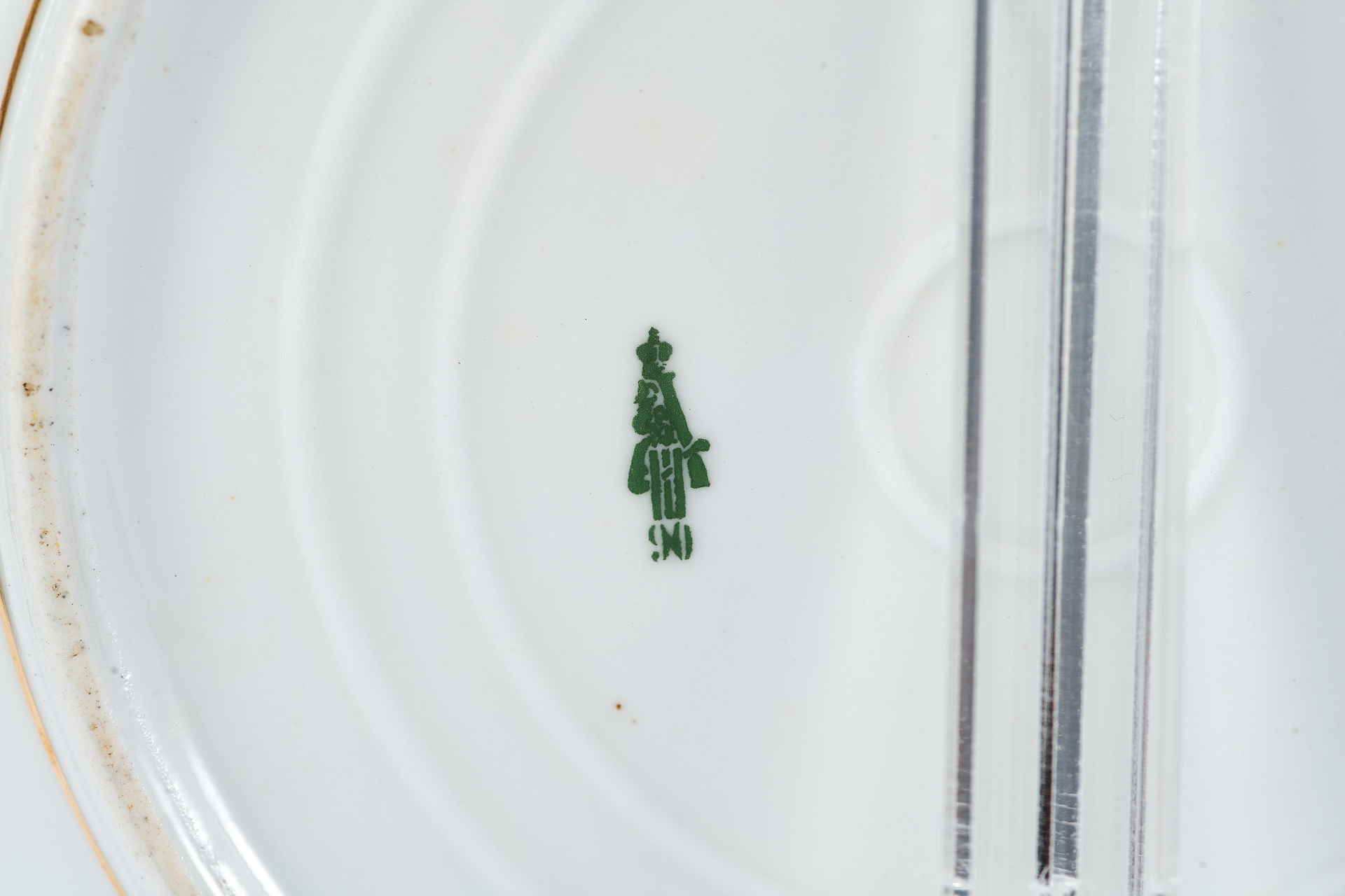 На оборотной стороне тарелки присутствует подглазурное клеймо Николая II, выполненное темно-зеленым хромом по трафарету. Эта маркировка, традиционно применявшаяся с эпохи Императора Павла I, включает гражданскую литеру под короной и надпись с годом производства — 1902. Наличие клейма подтверждает подлинность изделия и его принадлежность к продукции Императорского фарфорового завода.