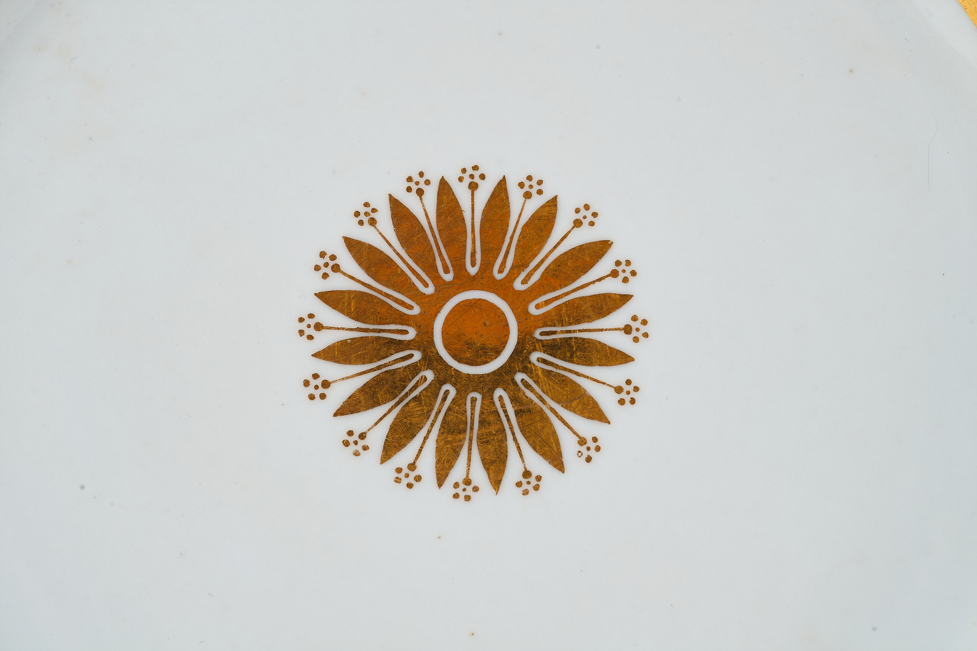 Материалом служит тонкостенный фарфор, покрытый ручной росписью и позолотой. Декорирование выполнено в виде растительного орнамента по фризу и аналогичного элемента в центральной части блюда. Узоры нанесены с особой тщательностью, сочетающей симметрию, яркость и изящество — характерные черты декоративного оформления продукции Императорского завода начала XX века. Палитра включает золото, серо-голубой и алый, создавая эффект торжественной сдержанности.