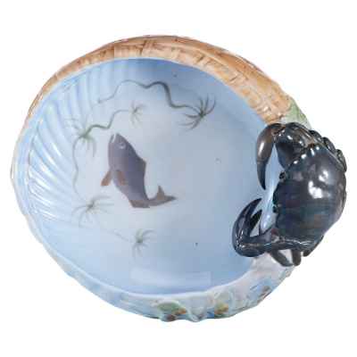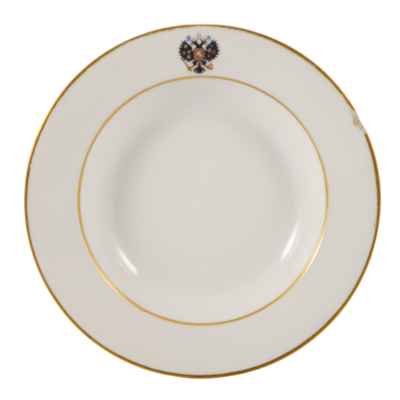 На донышке изделия присутствует клеймо Императорского фарфорового завода — монограмма «Н II» (Николай II) под императорской короной и датой производства — 1916, что подтверждает подлинность и официальное происхождение предмета. В этот период производство на ИФЗ уже приближалось к завершению в связи с политическими и социальными потрясениями, а посуда конца 1910-х годов встречается значительно реже по сравнению с изделиями более раннего времени.