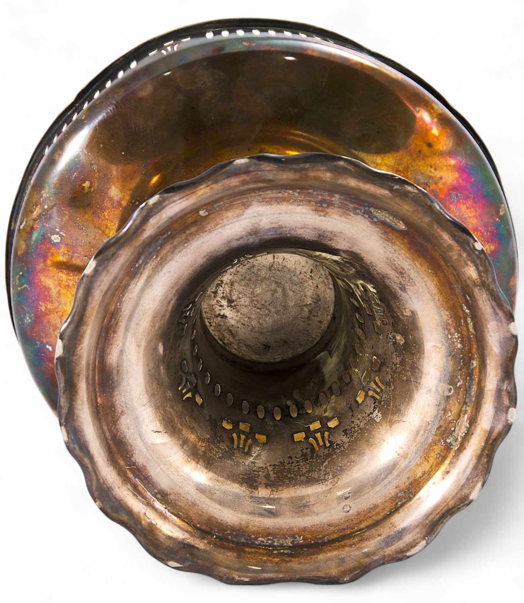 Ваза состоит из широкой чаши на высокой, конически расширяющейся ножке с волнистым основанием. По всему корпусу нанесены перфорированные мотивы в виде вытянутых овалов и крестообразных декоративных элементов. Отражающие поверхности изделия обладают характерной радужной патиной, образовавшейся в результате естественного старения металла и частичной утраты серебряного покрытия.
