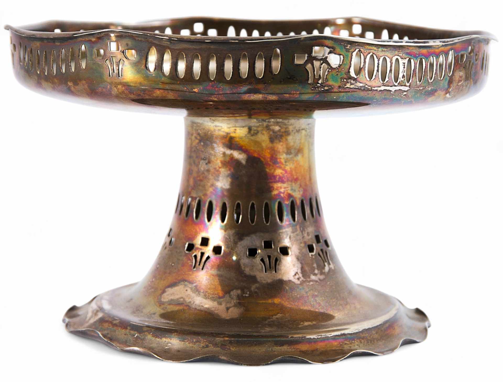 Металлическая фруктовая ваза, изготовленная в начале XX века на Берндорфской фабрике металлических изделий в Австрии, представляет собой характерный образец декоративного и утилитарного дизайна, выполненного в духе индустриального модерна. Изделие выполнено из металла с серебрением и украшено ажурной перфорацией — сквозными прорезями геометрической и стилизованной формы, придающими конструкции лёгкость и орнаментальную выразительность.