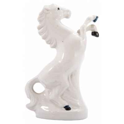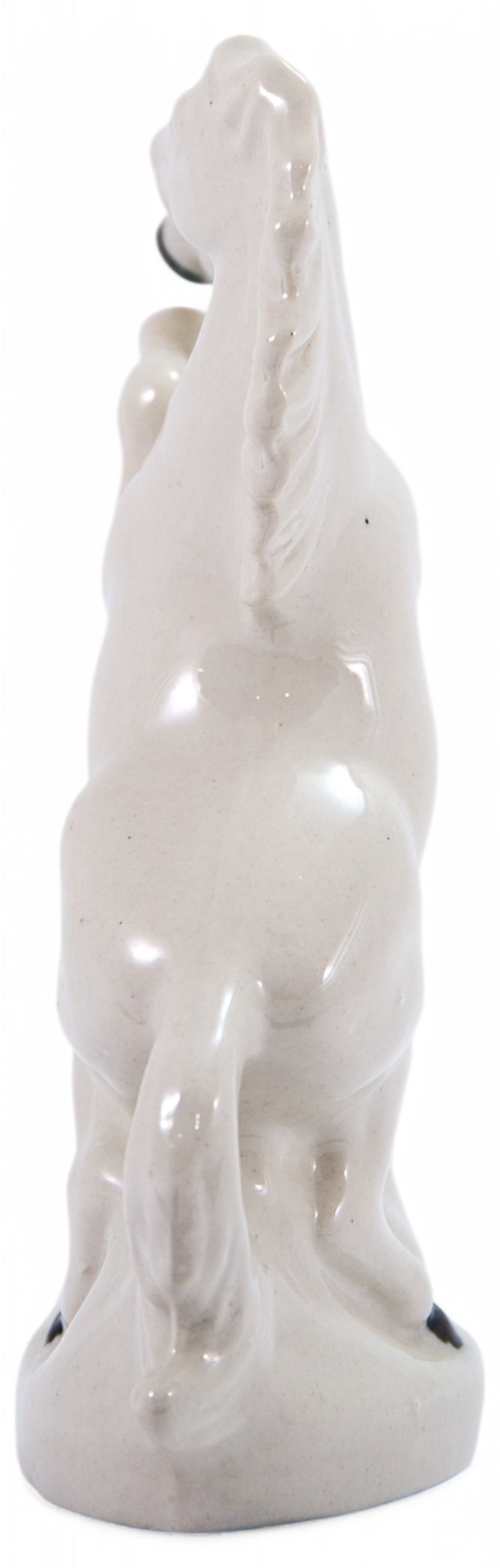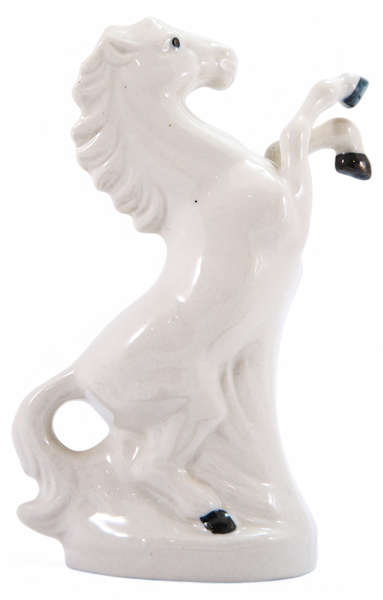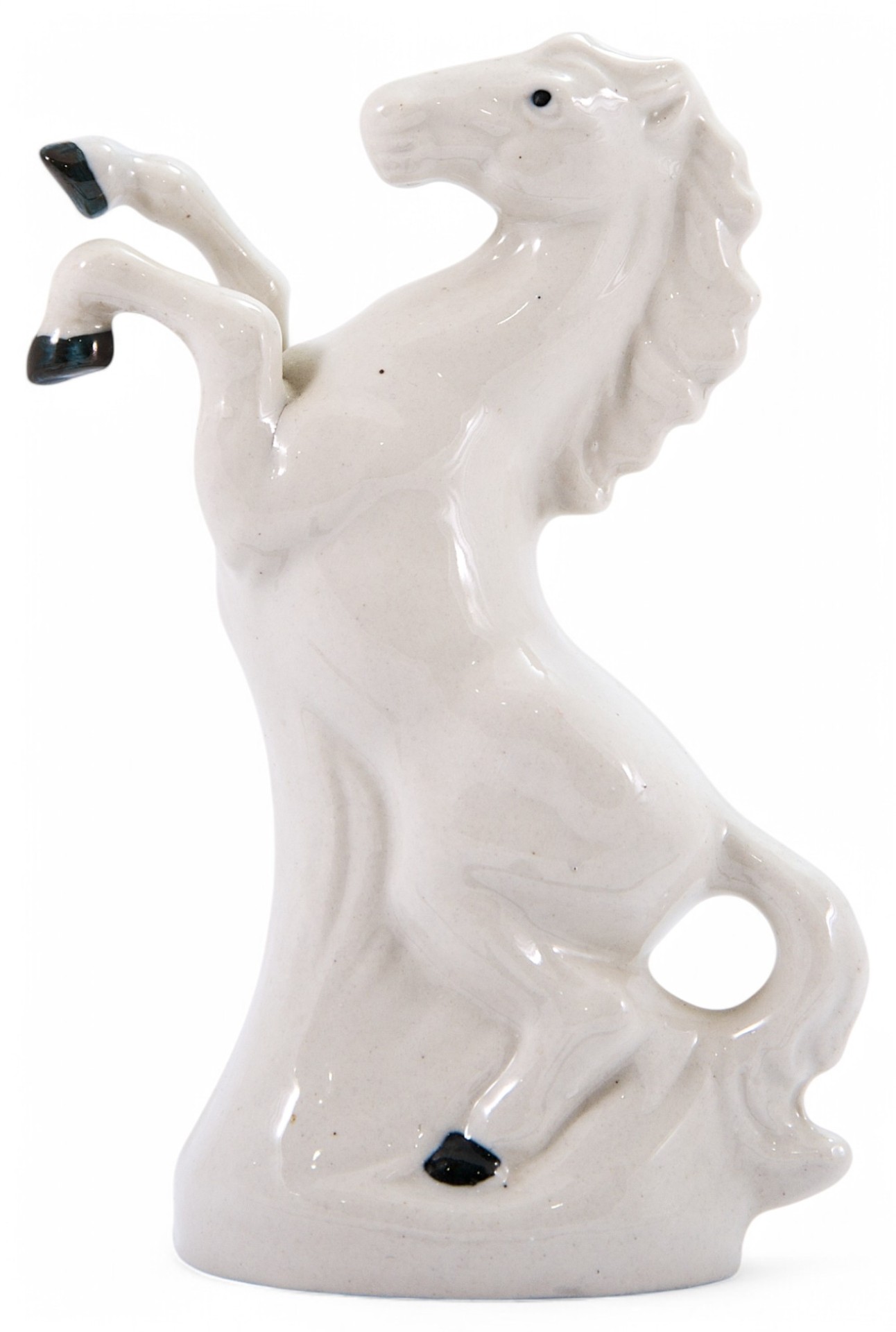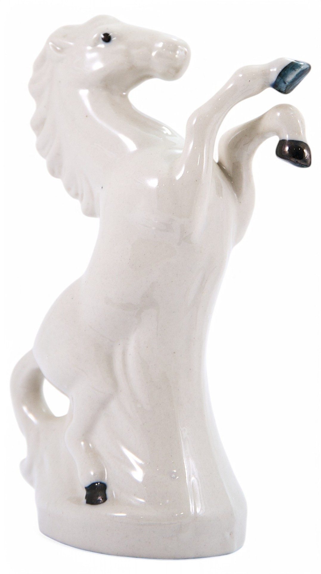 Фарфоровая статуэтка «Лошадь», изготовленная в Корейской Народно-Демократической Республике (КНДР) в 1950–1960-х годах, представляет собой выразительный пример анималистической пластики середины XX века. Скульптурное изображение выполнено в виде вставшей на дыбы белой лошади, что подчёркивает динамичность, силу и стремительность животного. Фигура отличается лаконичностью формы и минималистичной колористикой, с небольшими акцентами подглазурной росписи на копытах и морде.