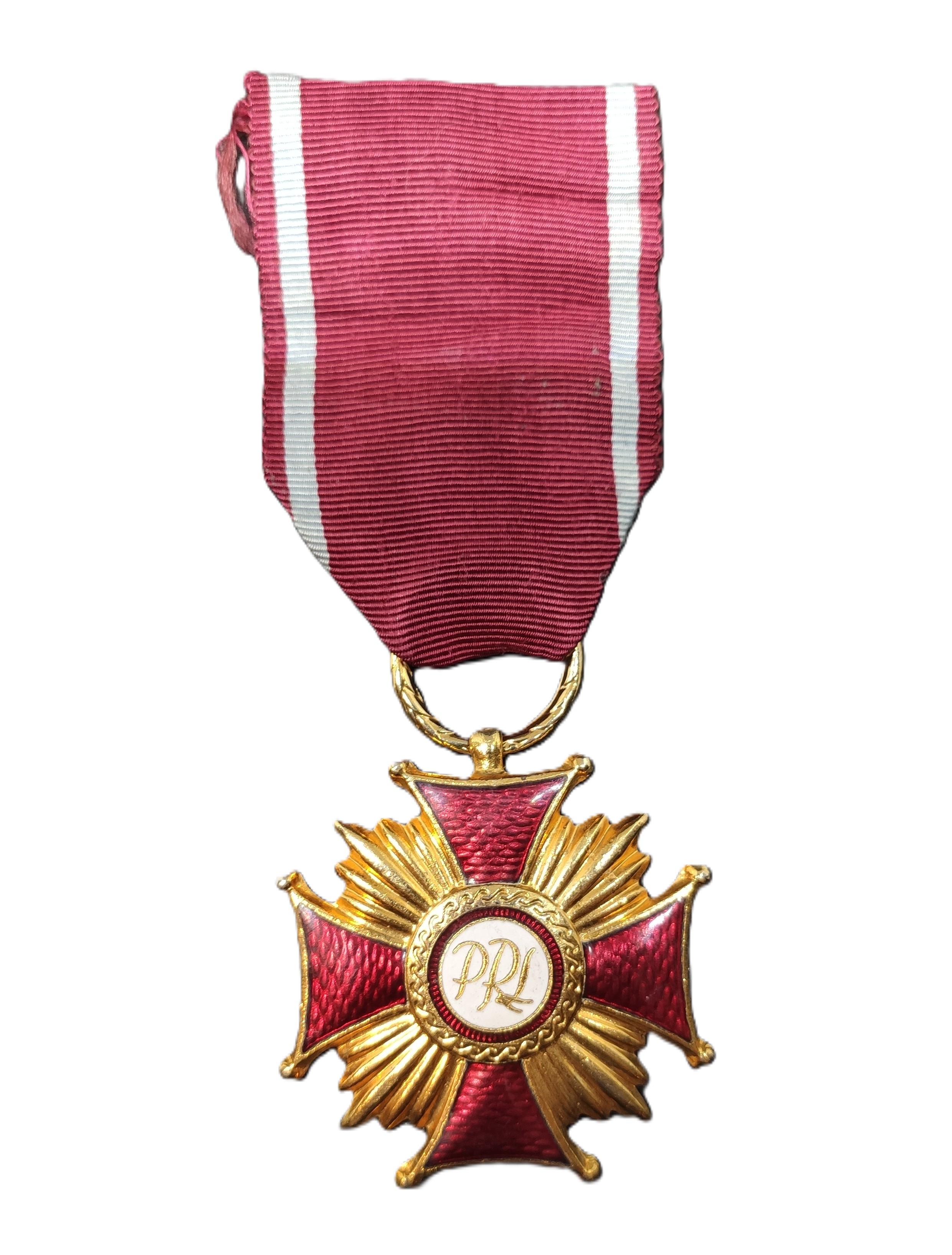 стилизованного креста с расширяющимися к концам плечами, которые заканчиваются шариками. С лицевой стороны плечи креста залиты рубиново-красной эмалью, сквозь которую просматривается их чешуйчатая поверхность. В промежутках между плечами креста располагаются пять расходящихся от центра лучей. В центре креста в медальоне, залитом белой эмалью, помещена монограмма из позолоченных букв «PRL» (до 1952 года монограмма состояла из двух букв: «RP»Y Медальон