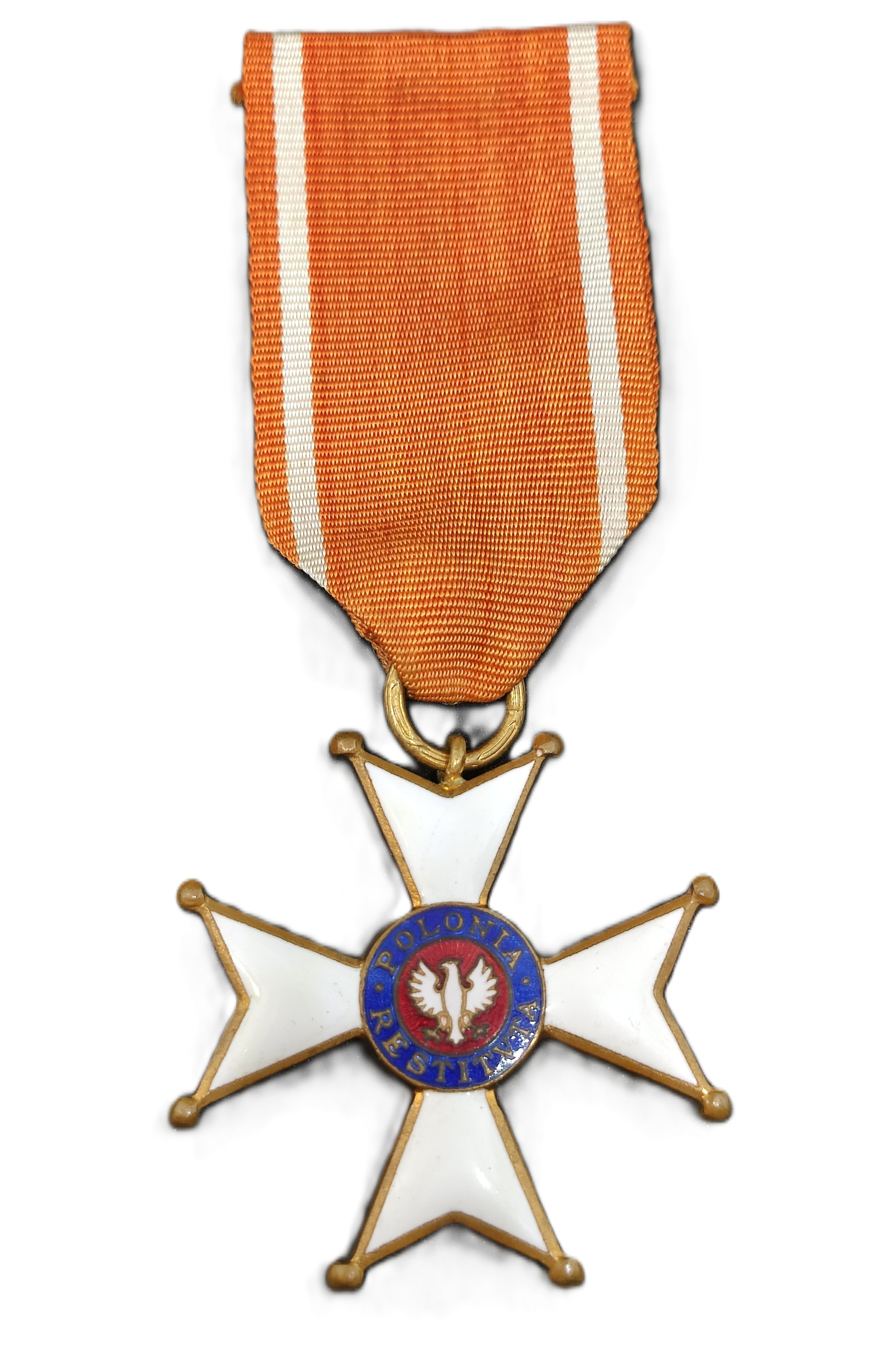 Орден Возрождения Польши. Выполнен в форме мальтийского креста. Аверс покрыт белой эмалью с золотистой каймой по краю. Восемь острых концов креста украшены золотыми шариками. В центре креста, в розетке на красном эмалевом поле, изображен польский орел: не коронованный — Польская республика. Орел, покрытый эмалью белого цвета, окаймлен синим эмалевым пояском с надписью позолоченными буквами по окружности «POLONIA RESTITVTA». Ободки пояска позолоченные. В центре позолоченного реверса на красном эмалевом поле, окантованном по круту орнаментом, находятся