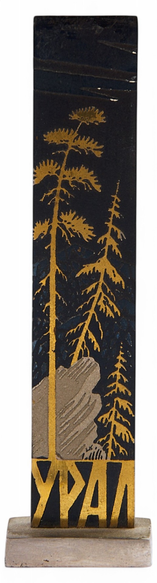 На настольной декоративной стеле, широко выпускавшейся художественной артелью мастеров-граверов Златоуста, изображен уральский пейзаж: каменный валун, сосна, ели. Ниже надпись: «УРАЛ».