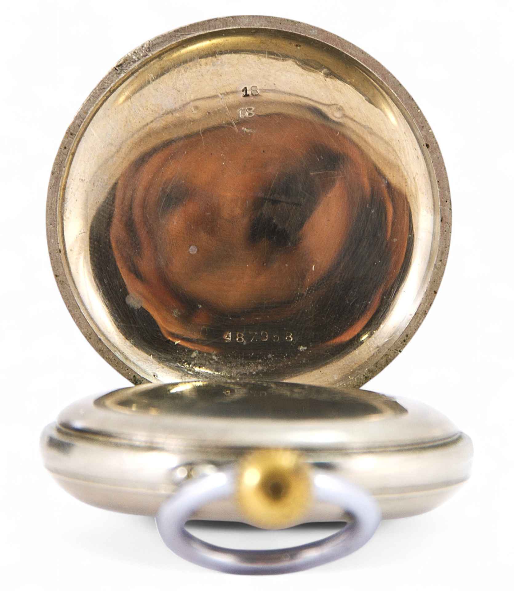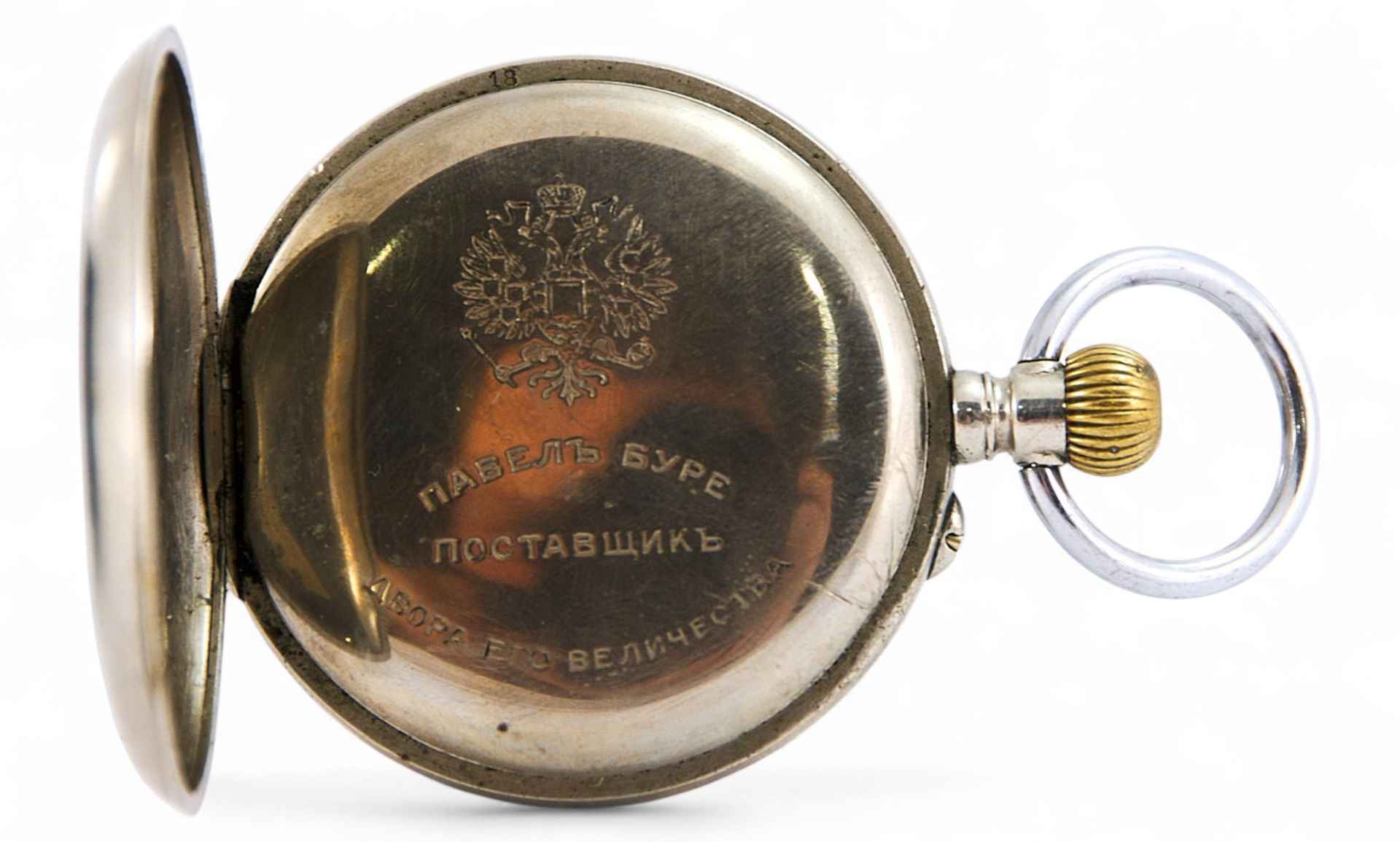 Карманные служебные часы выполнены на знаменитой фирме Павла Буре. Белый эмалевый циферблат с арабскими цифрами и секундомером открыт, застеклен. Присутствует надпись «Павелъ Буре». Стрелки и цифры черные. Под задней крышкой штампованное клеймо с надписью в три строки под изображением герба Российской Империи, двуглавым орлом: «Павелъ Буре Поставщикъ Двора Его Величества», а также номер изделия: «487958». Карманные часы выполнены на высоком техническом уровне. Клейма подлинные. Их наличие, а также стилистические особенности и состояние материала позволяют установить, что часы были изготовлены в начале XX века на фирме «Павелъ Буре» в Швейцарии.